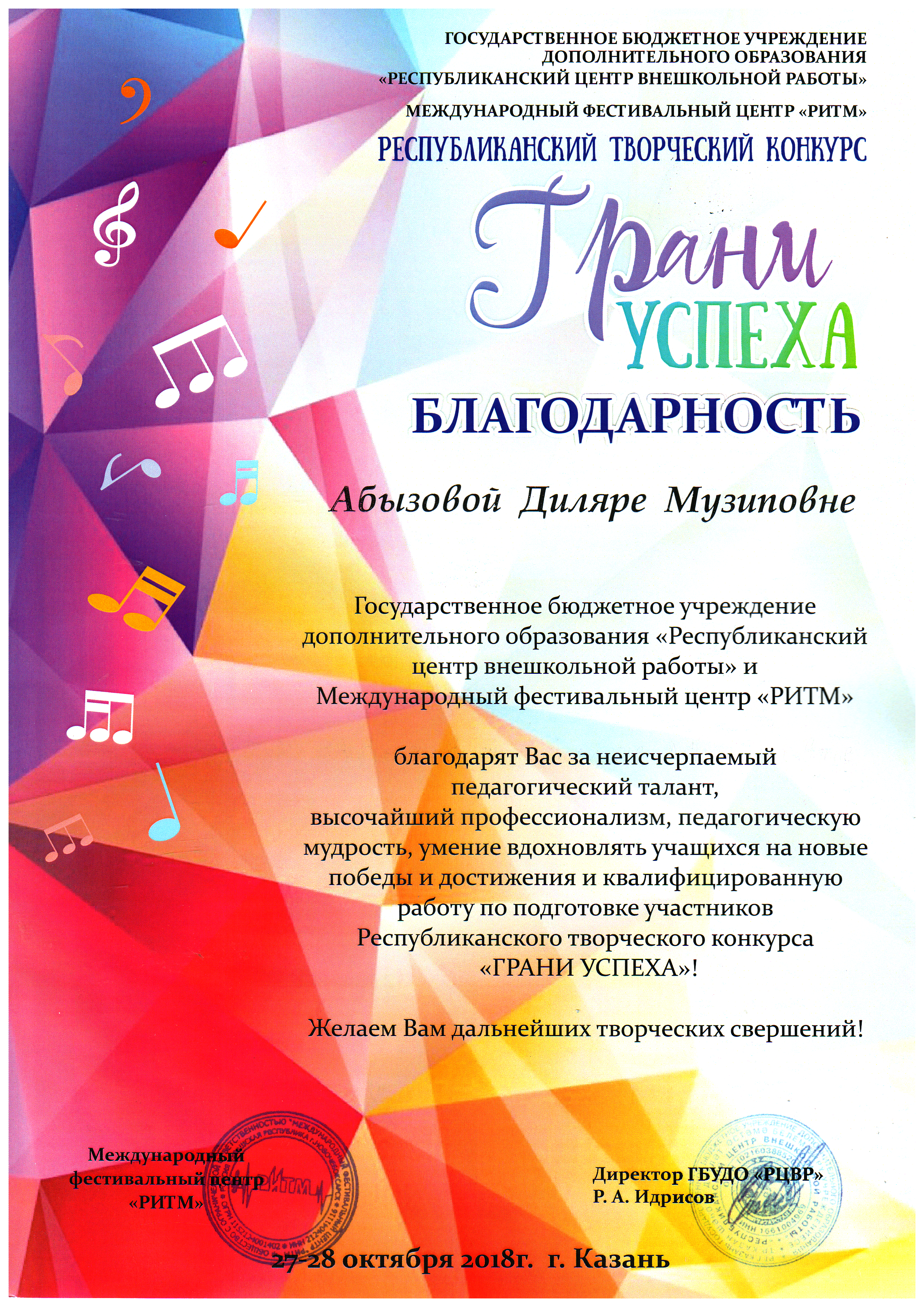 Республиканский творческий конкурс "Грани успеха" - Абызова Д.М., Благодарность;