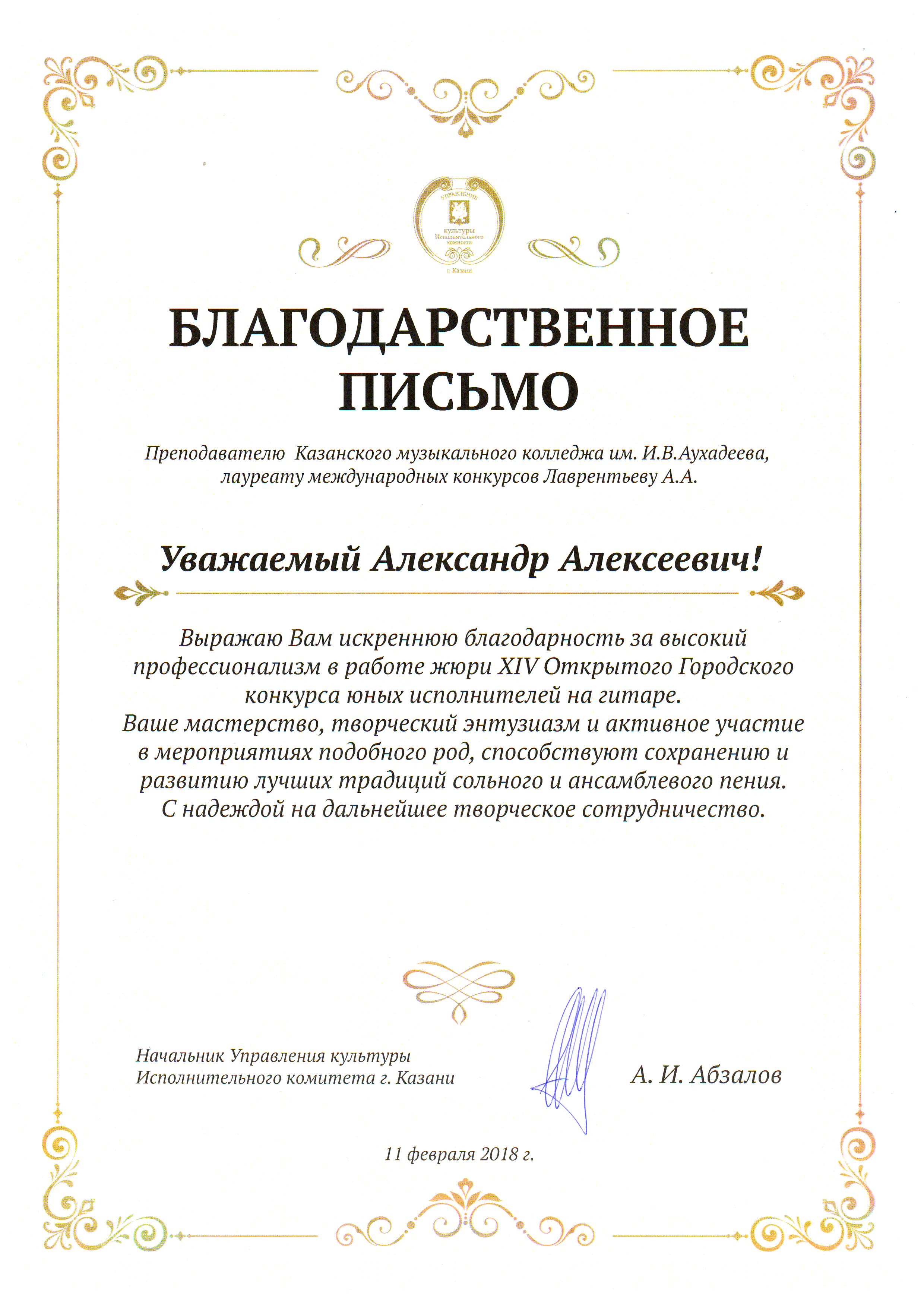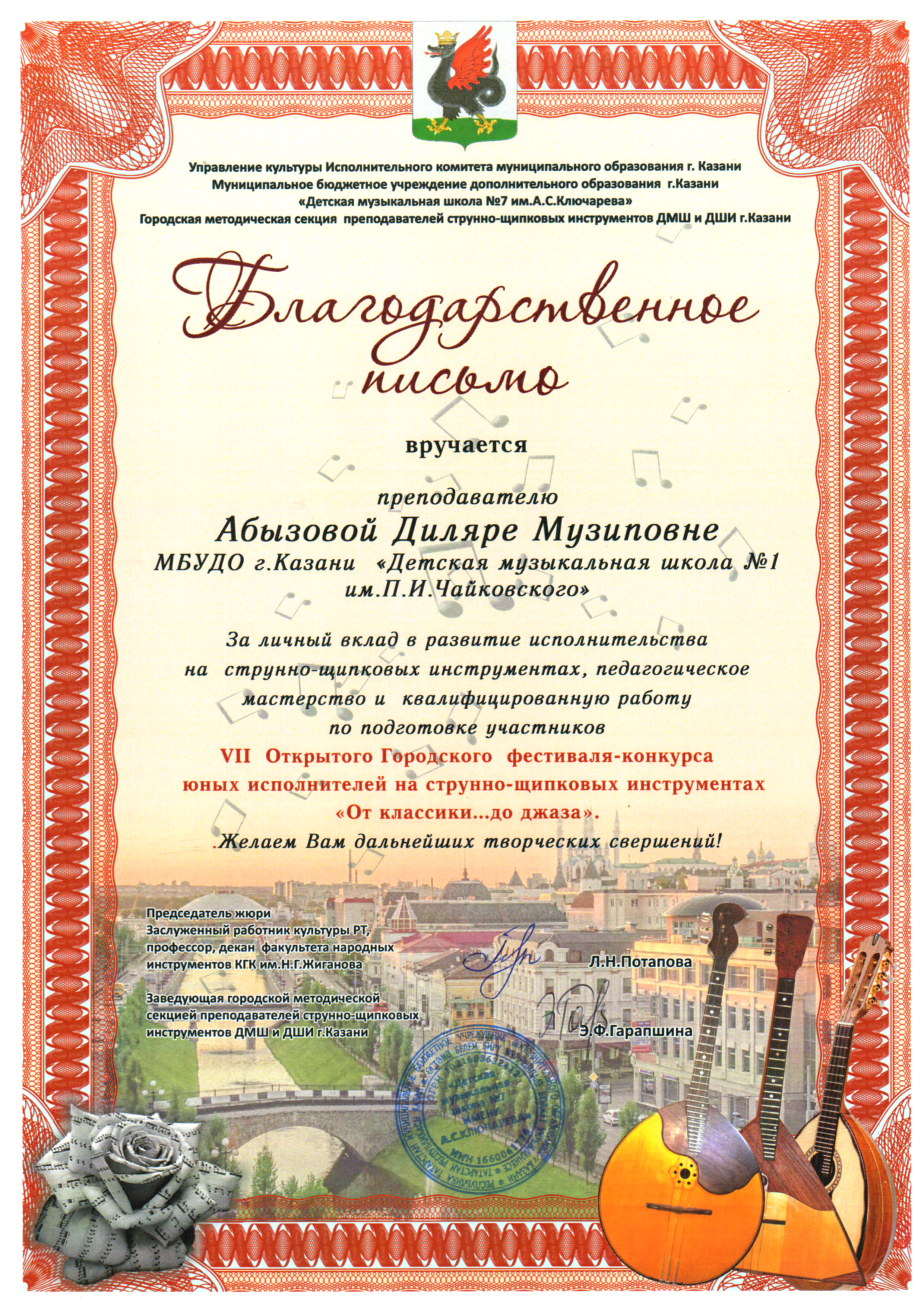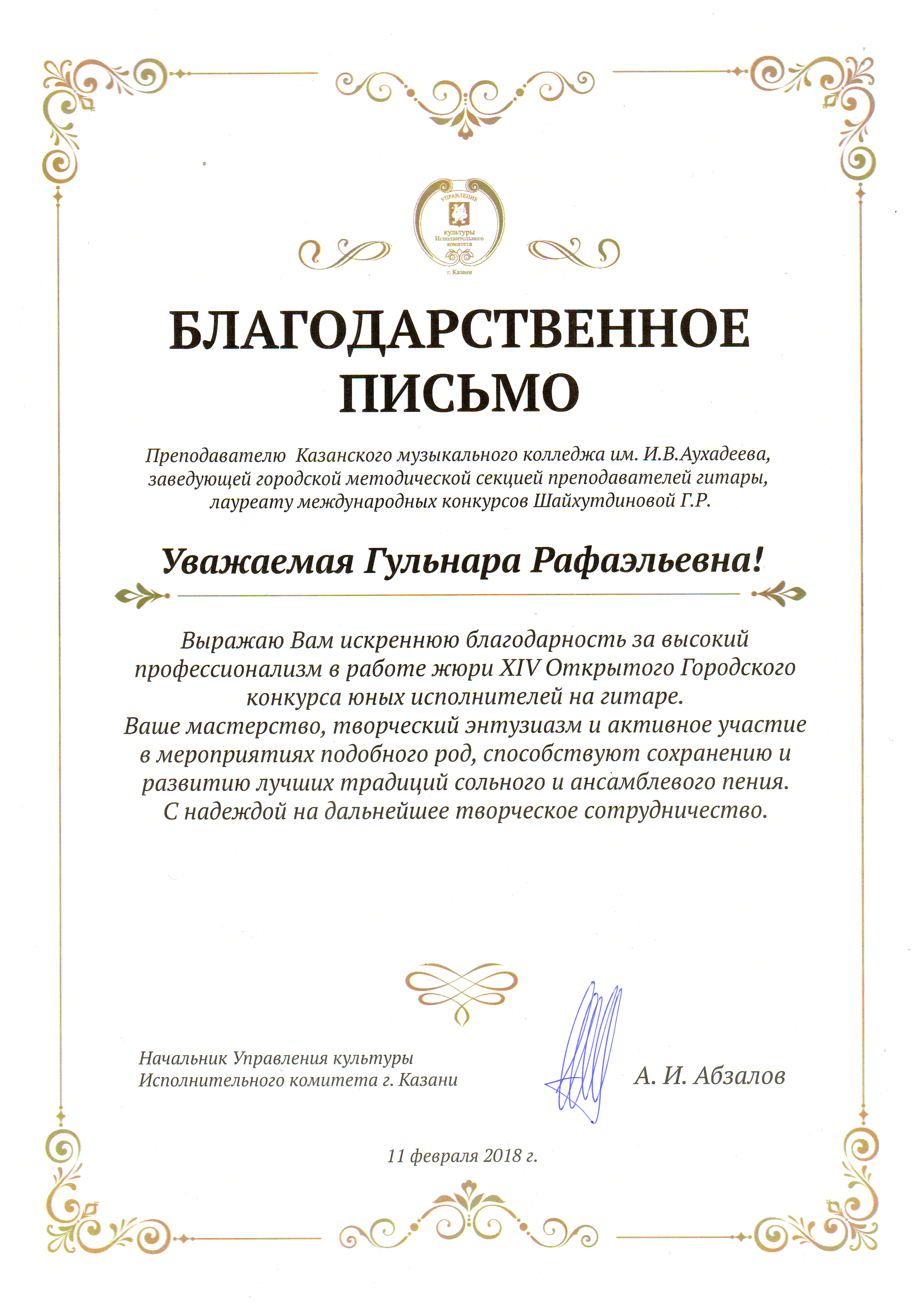 Управление культуры ИКМО г.Казани - Марданова Г.Р., Благодарственное письмо;