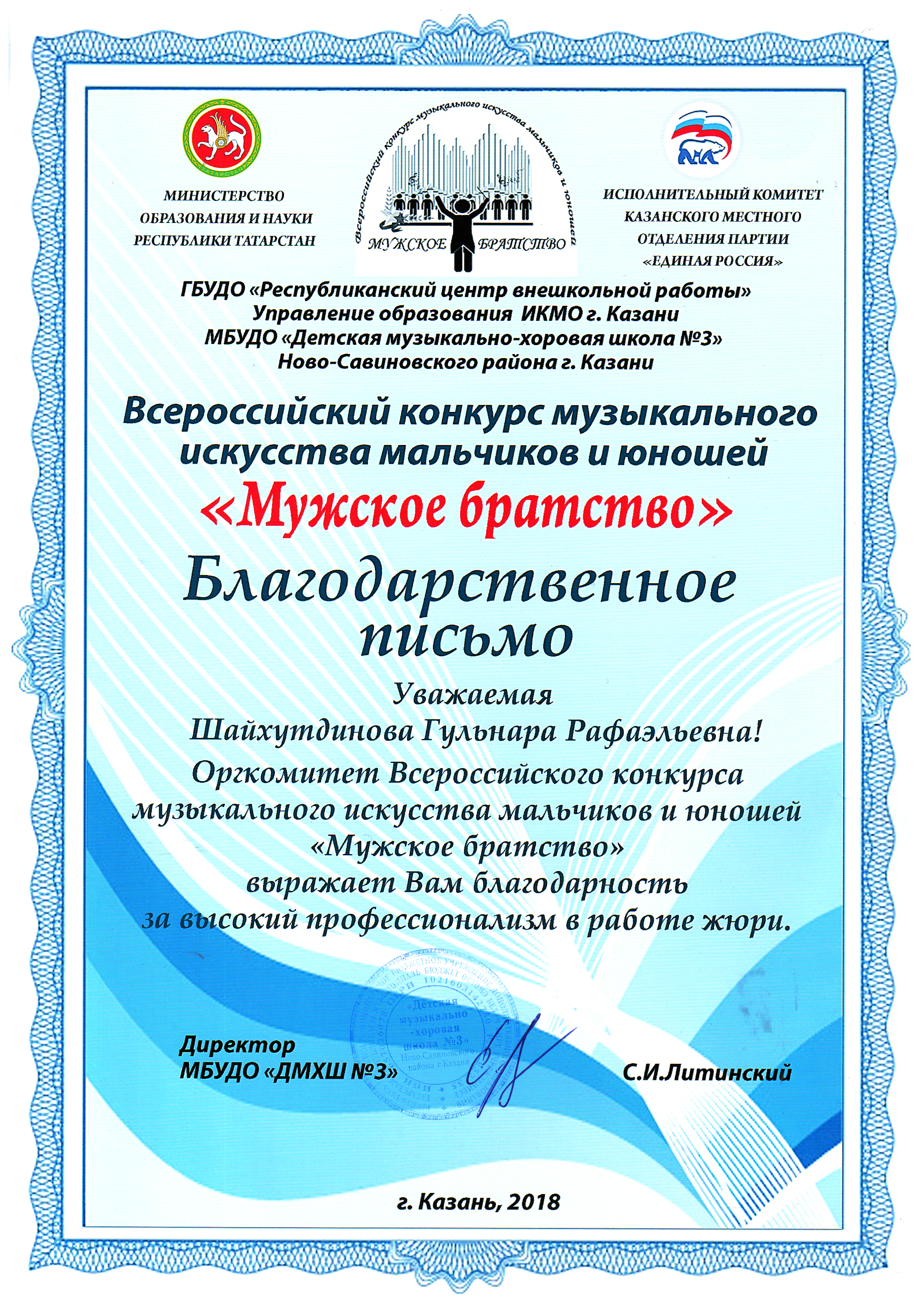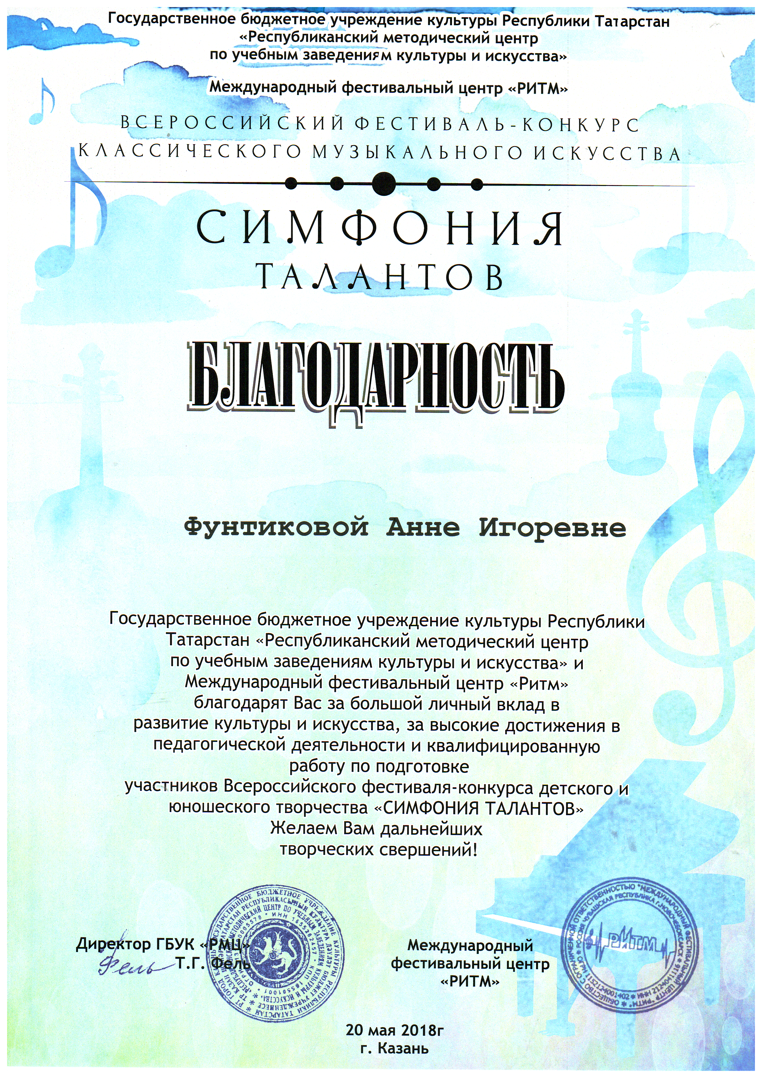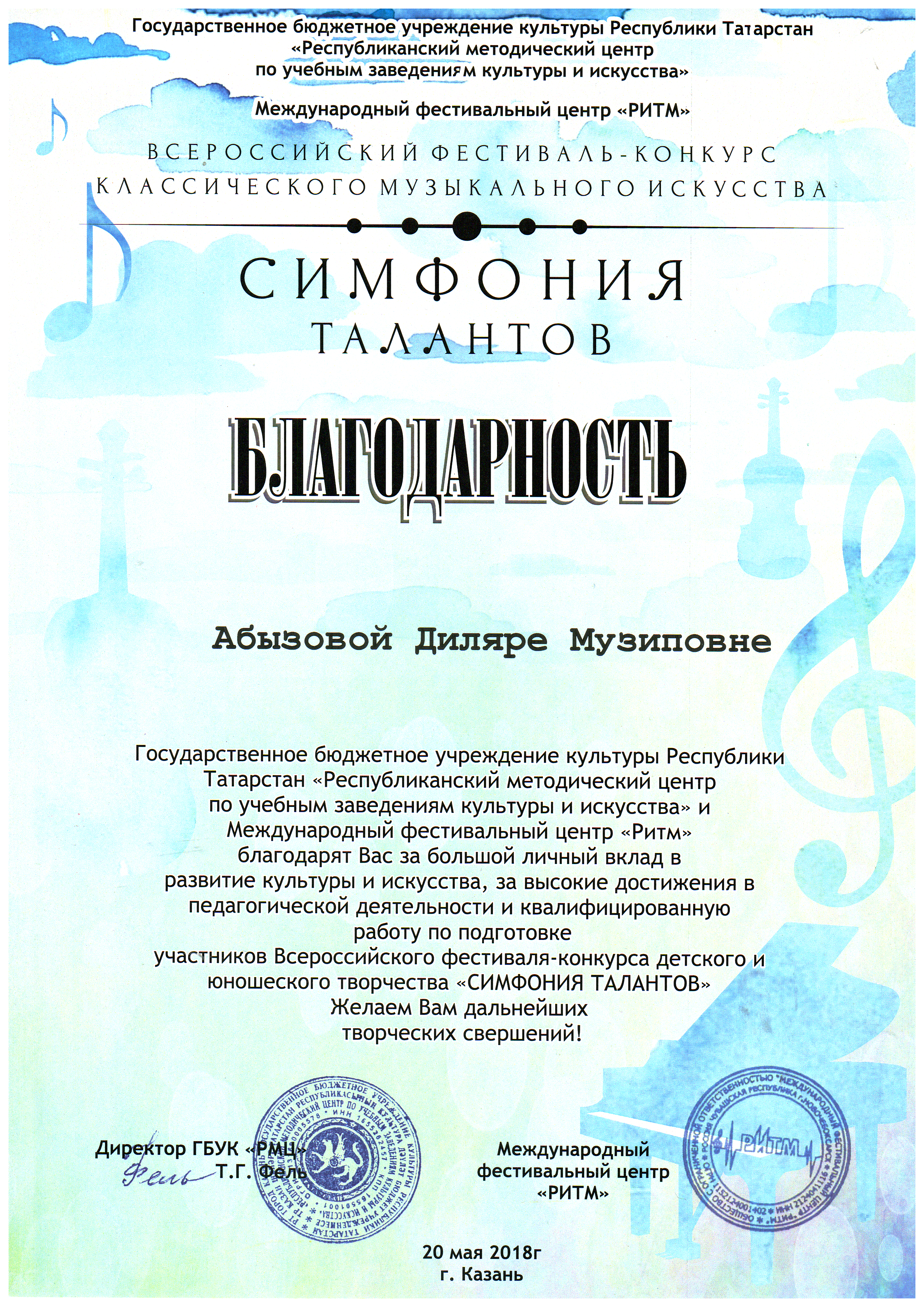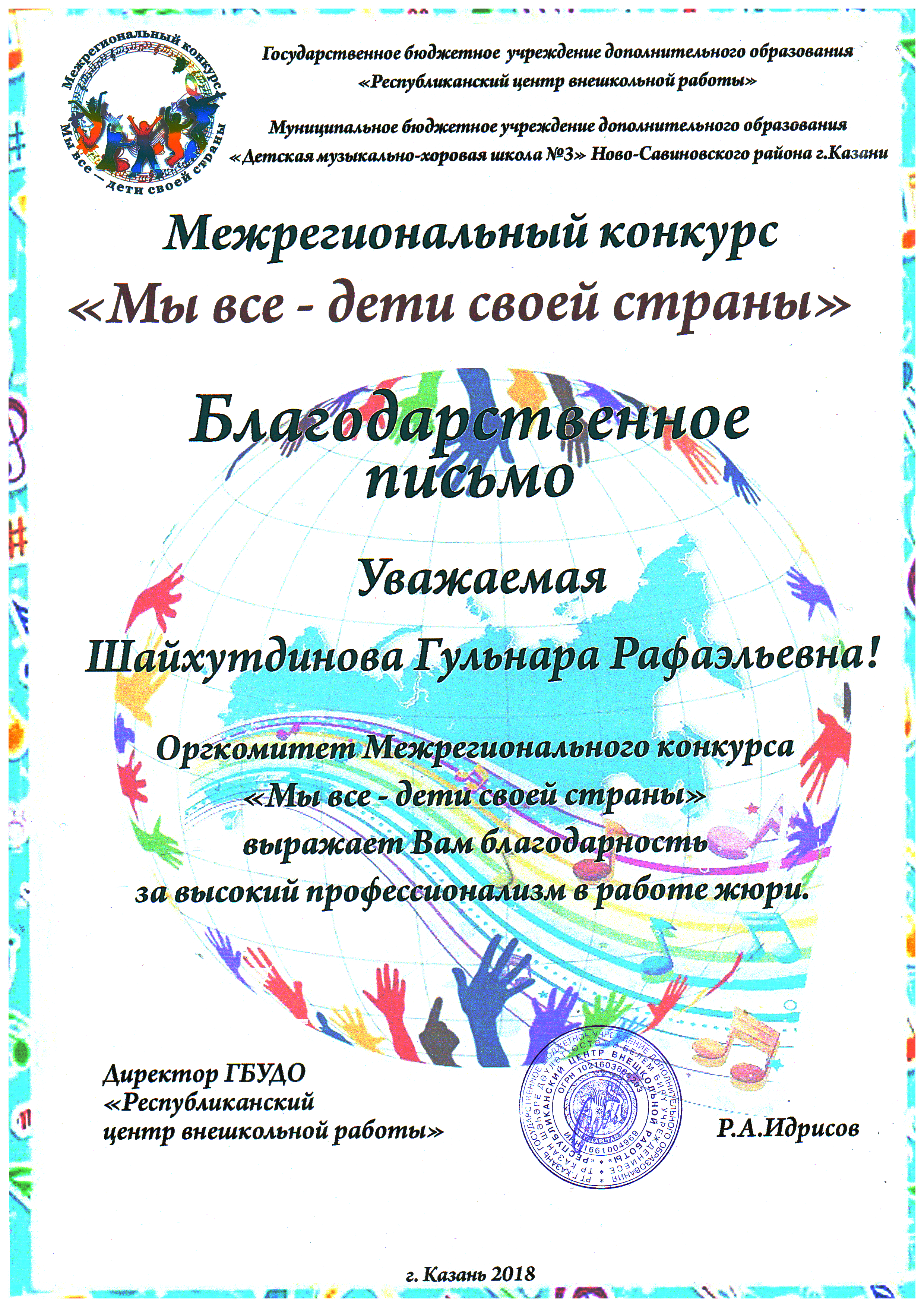 VIII Региональный конкурс по сольфеджио для младших и средних классов "Забавное сольфеджио"- Хасфиуллина Т.В., Благодарственное письмо;