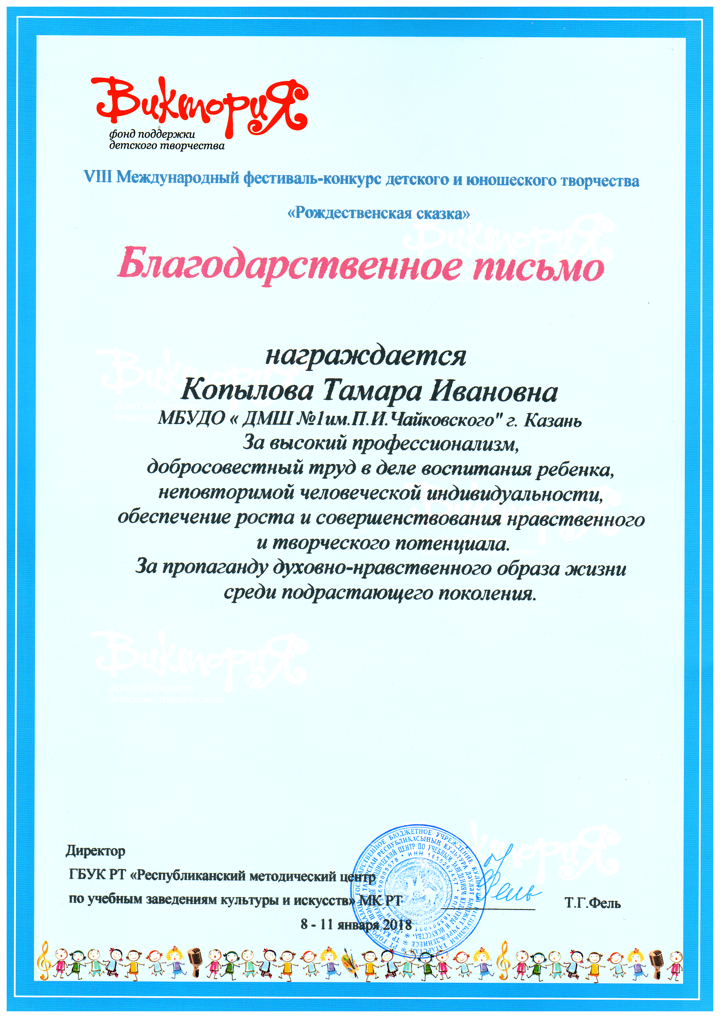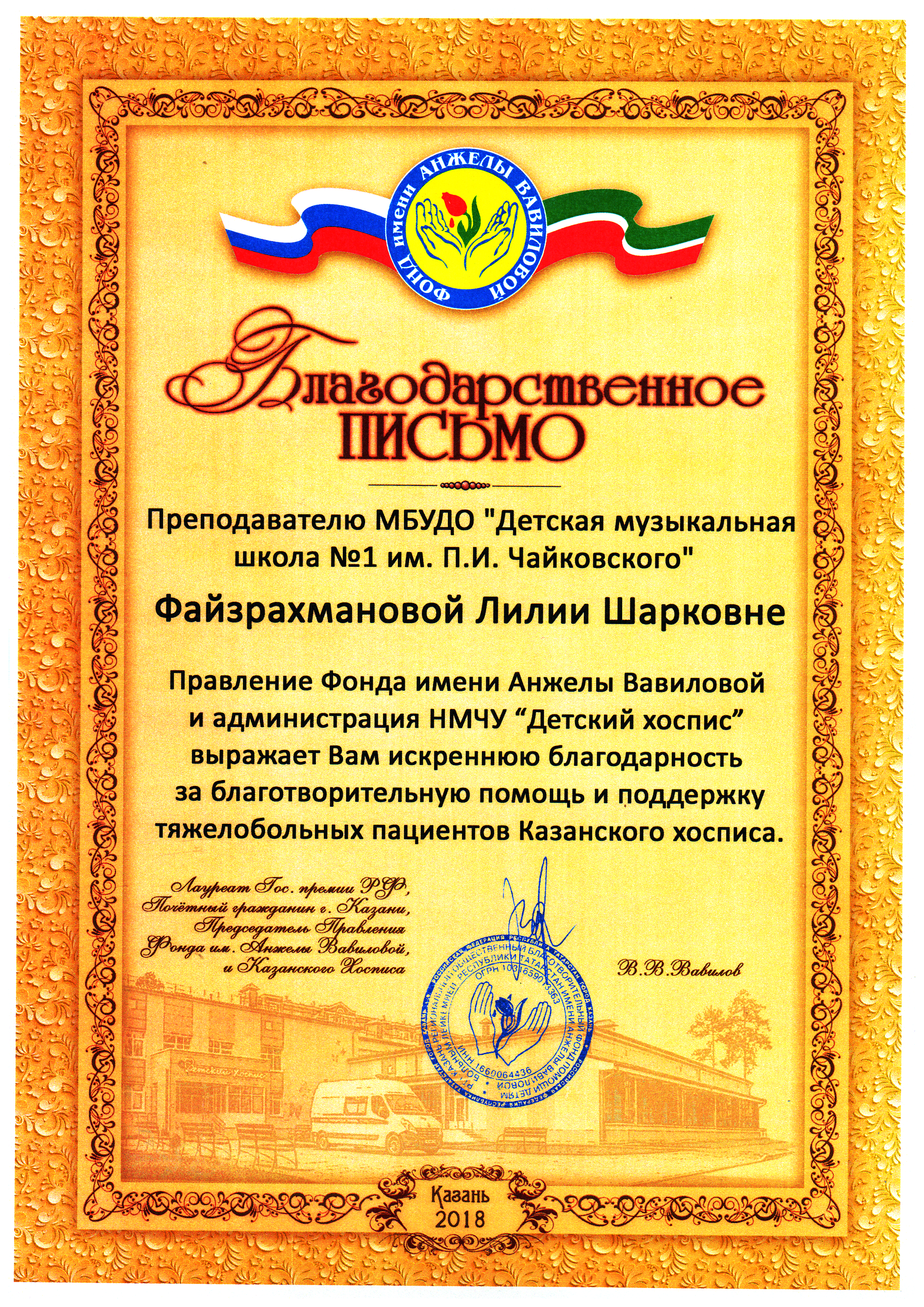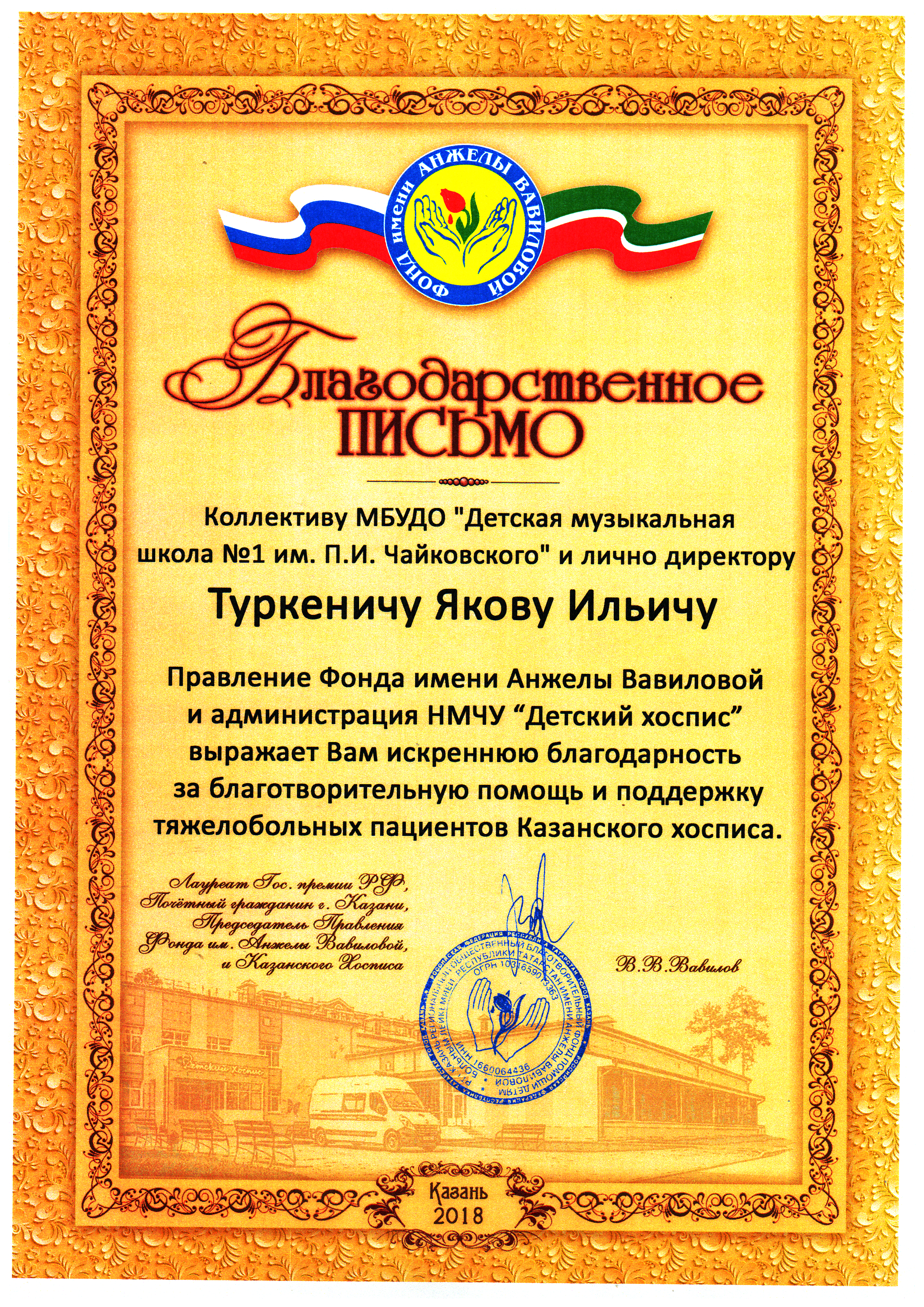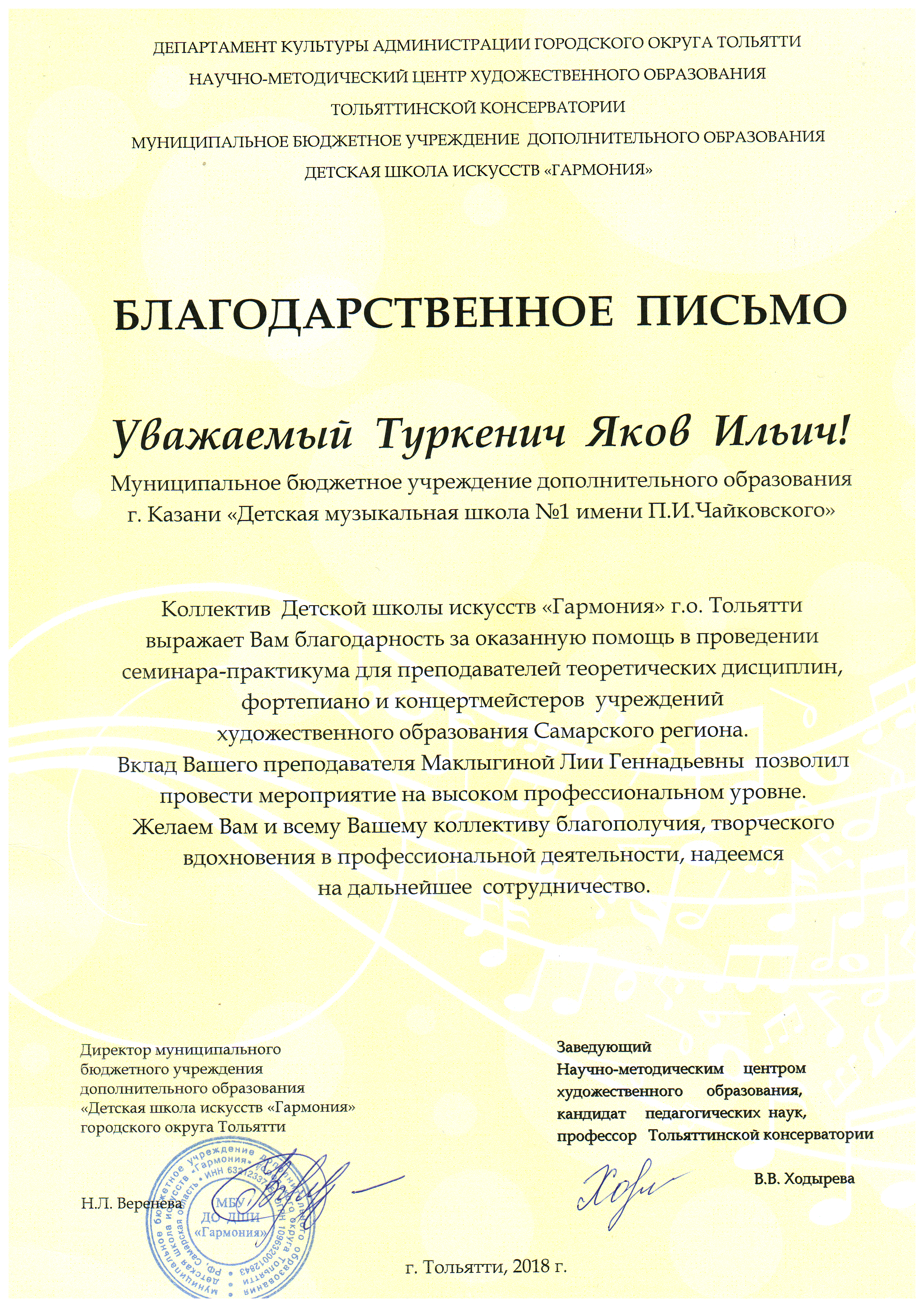 ДШИ "Гармония" г.о. Тольятти - Туркенич Я.И., Благодарственное письмо;