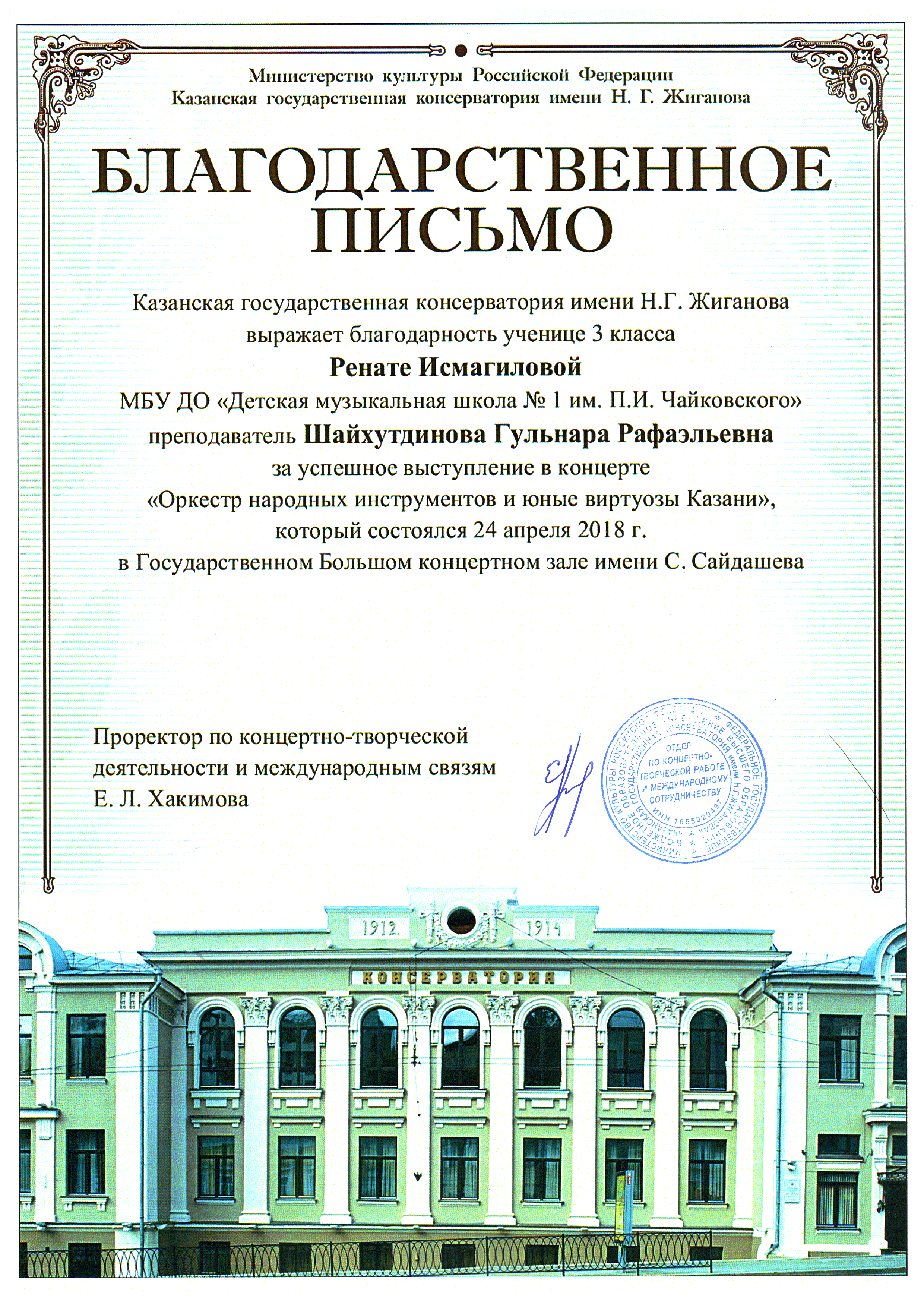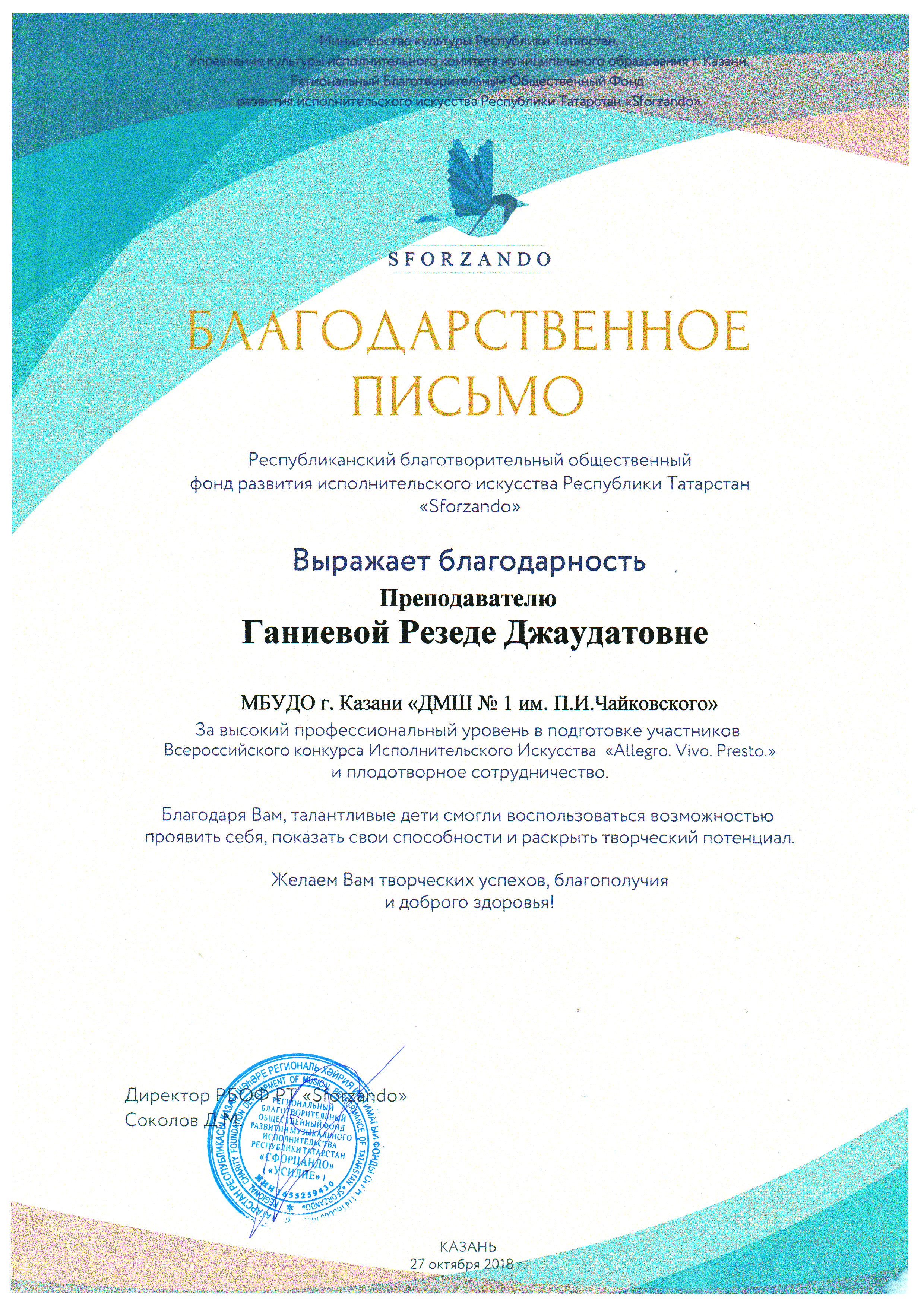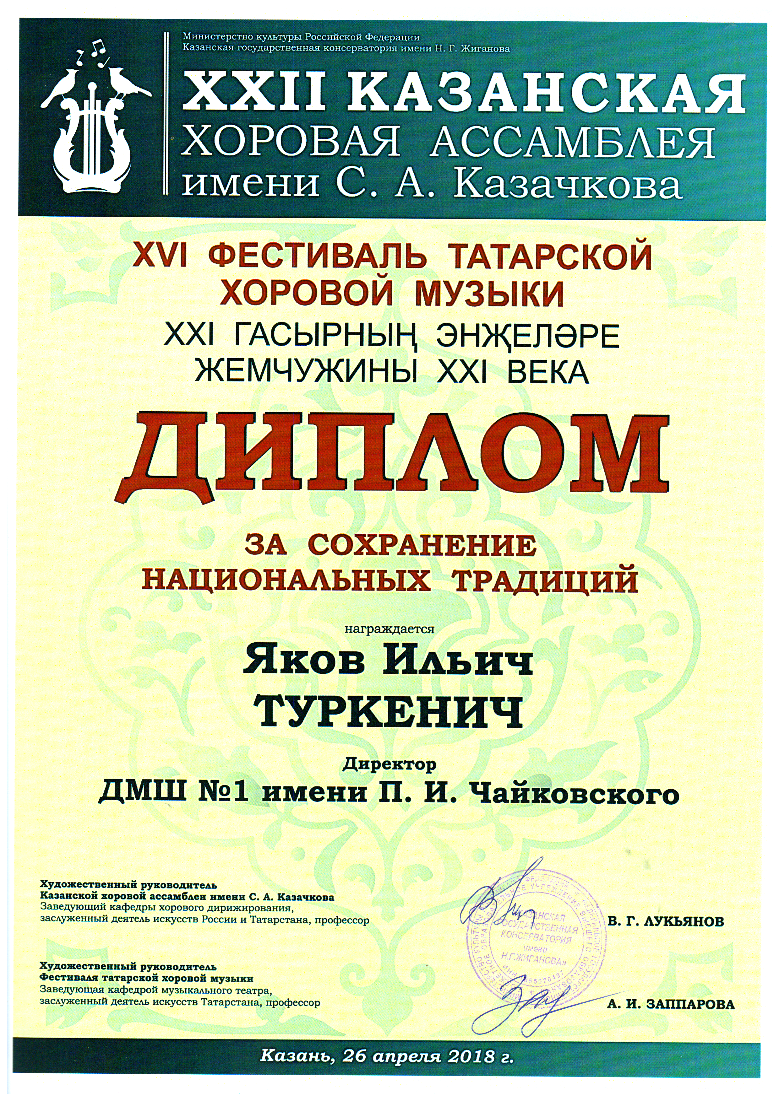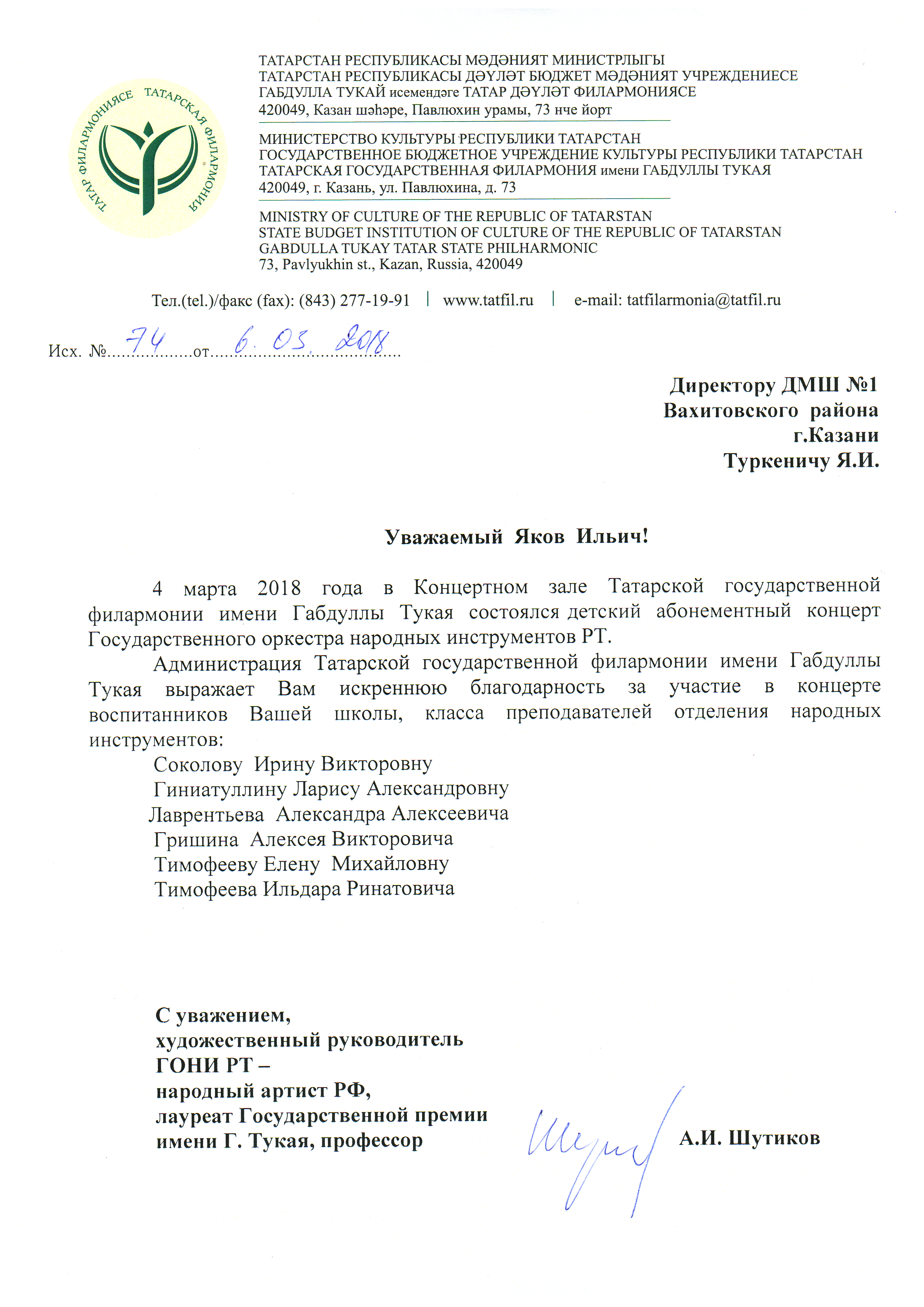 ДШИ "Гармония" г.о. Тольятти - Туркенич Я.И., Благодарственное письмо;