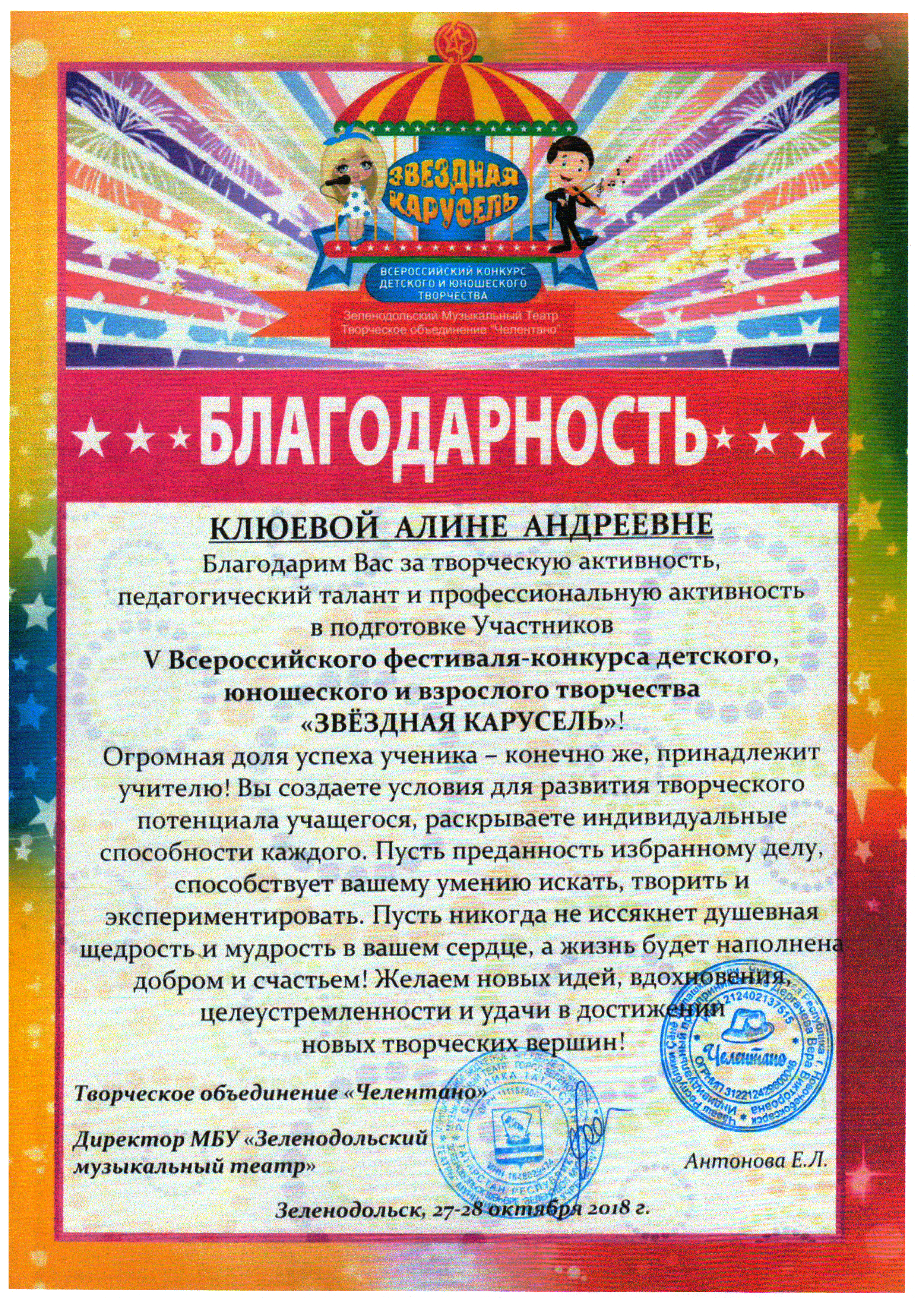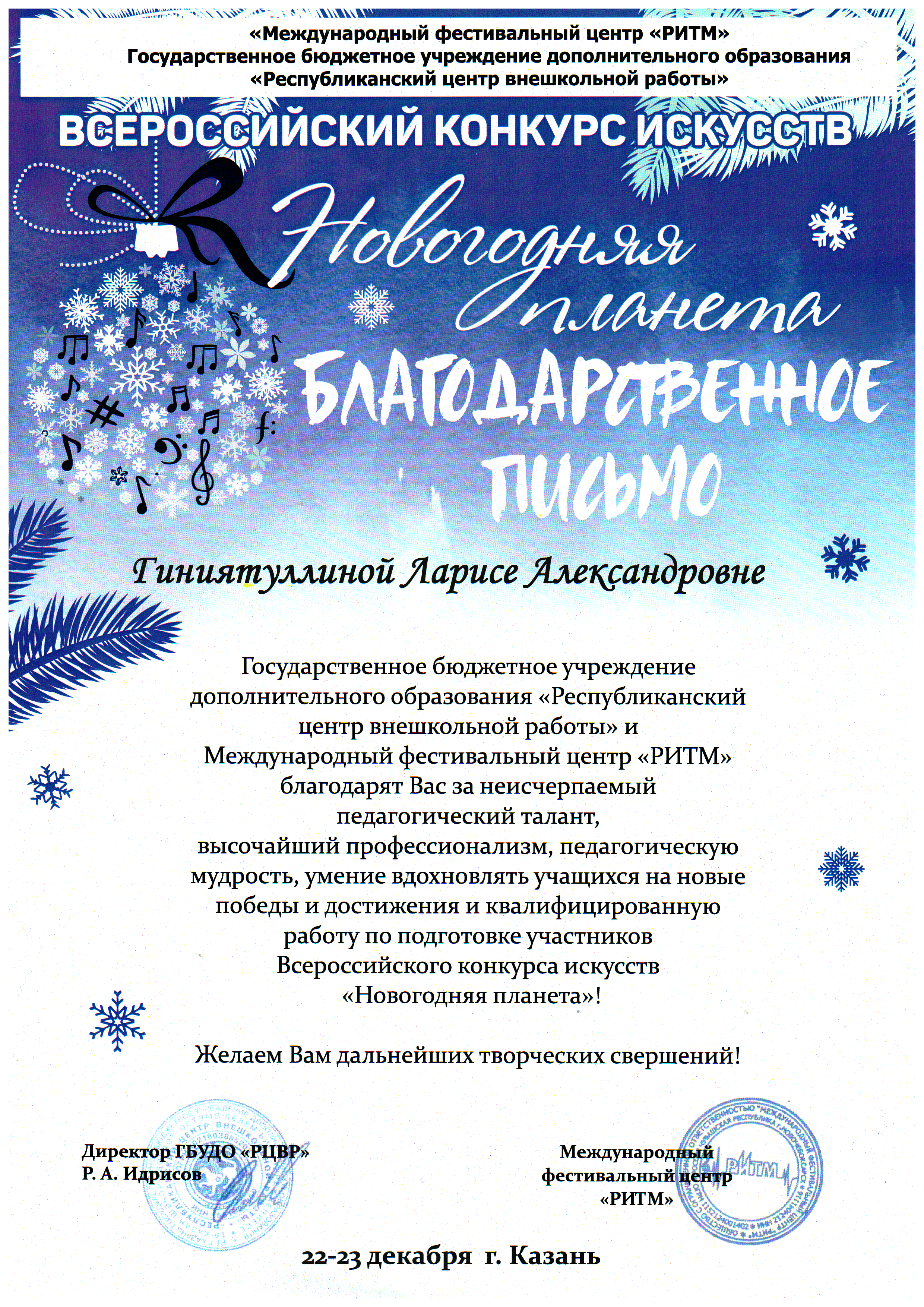 Всероссийский конкурс искусств "Новогодняя планета" - Гиниятуллина Л.А., Благодарственное письмо;