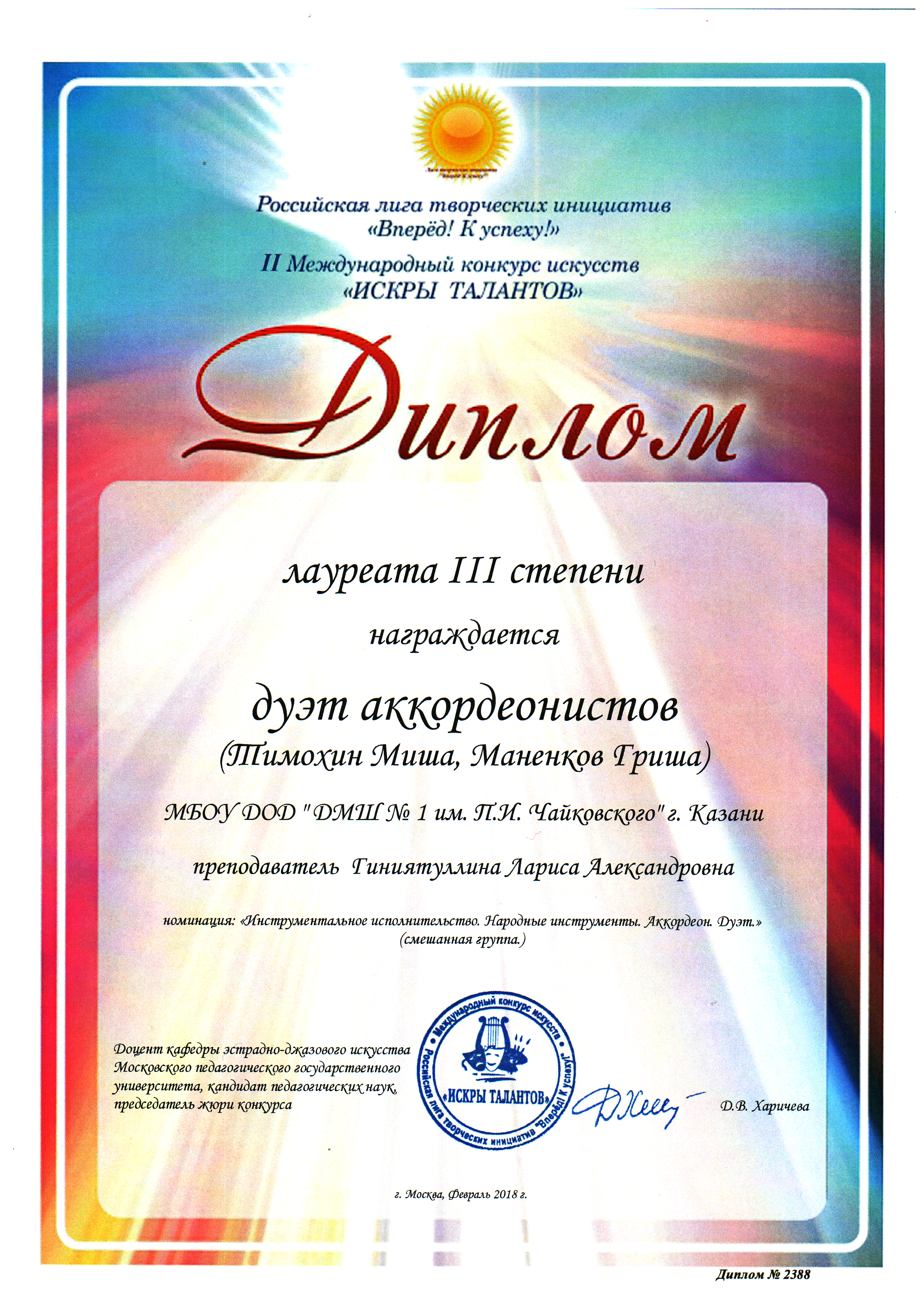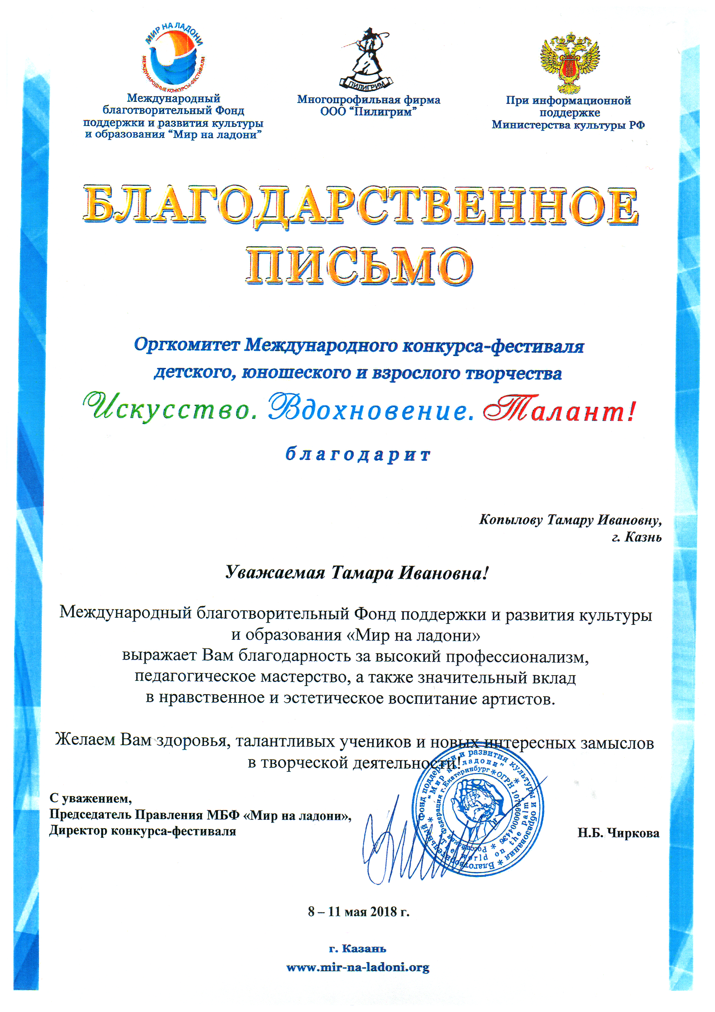 II Международный конкурс искусств "Искры талантов" - Гиниятуллина Л.А., Благодарственное письмо;