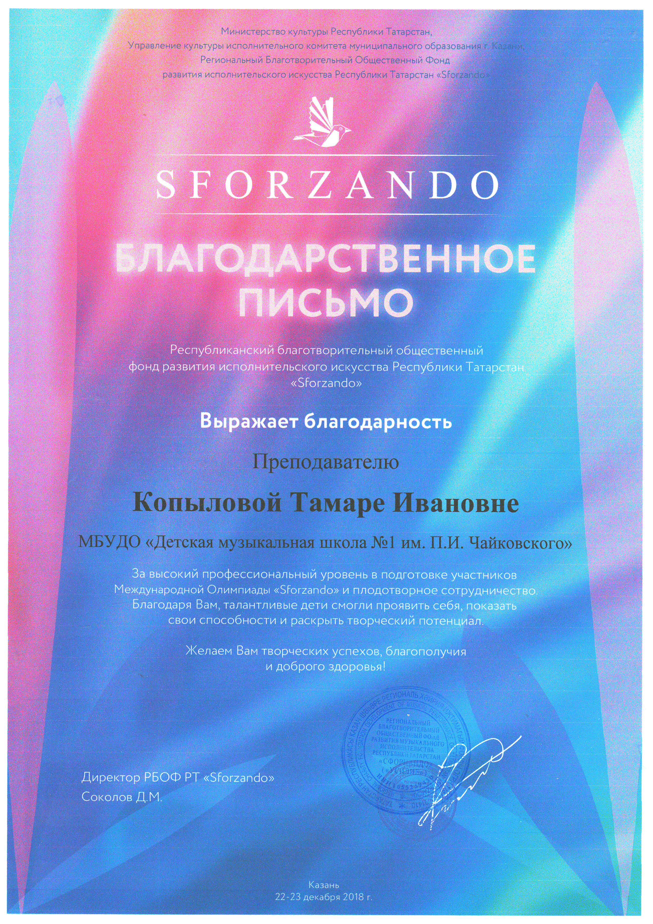 Международная олимпиада "SFORZANDO" - Копылова Т.И.; Благодарственное письмо;