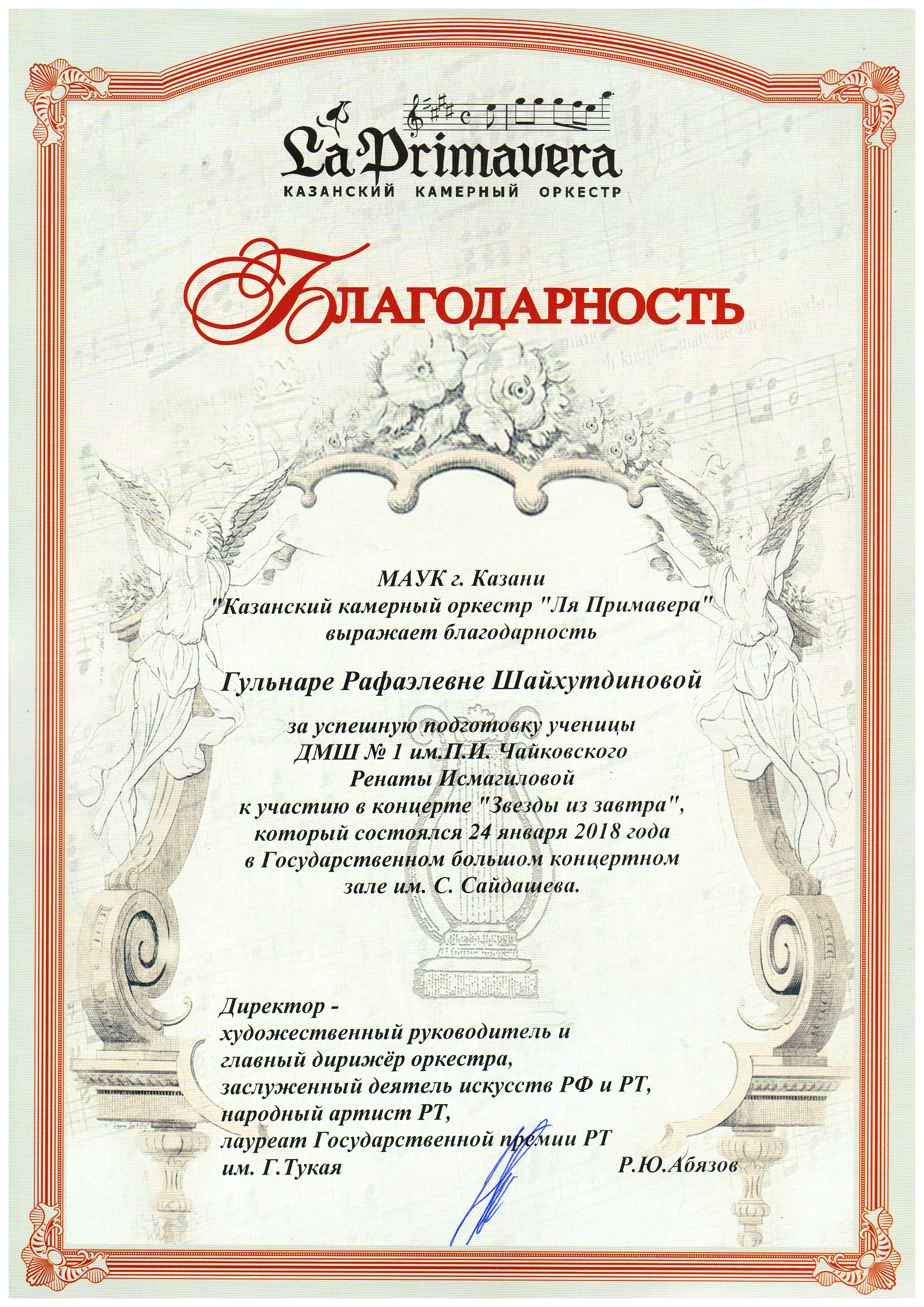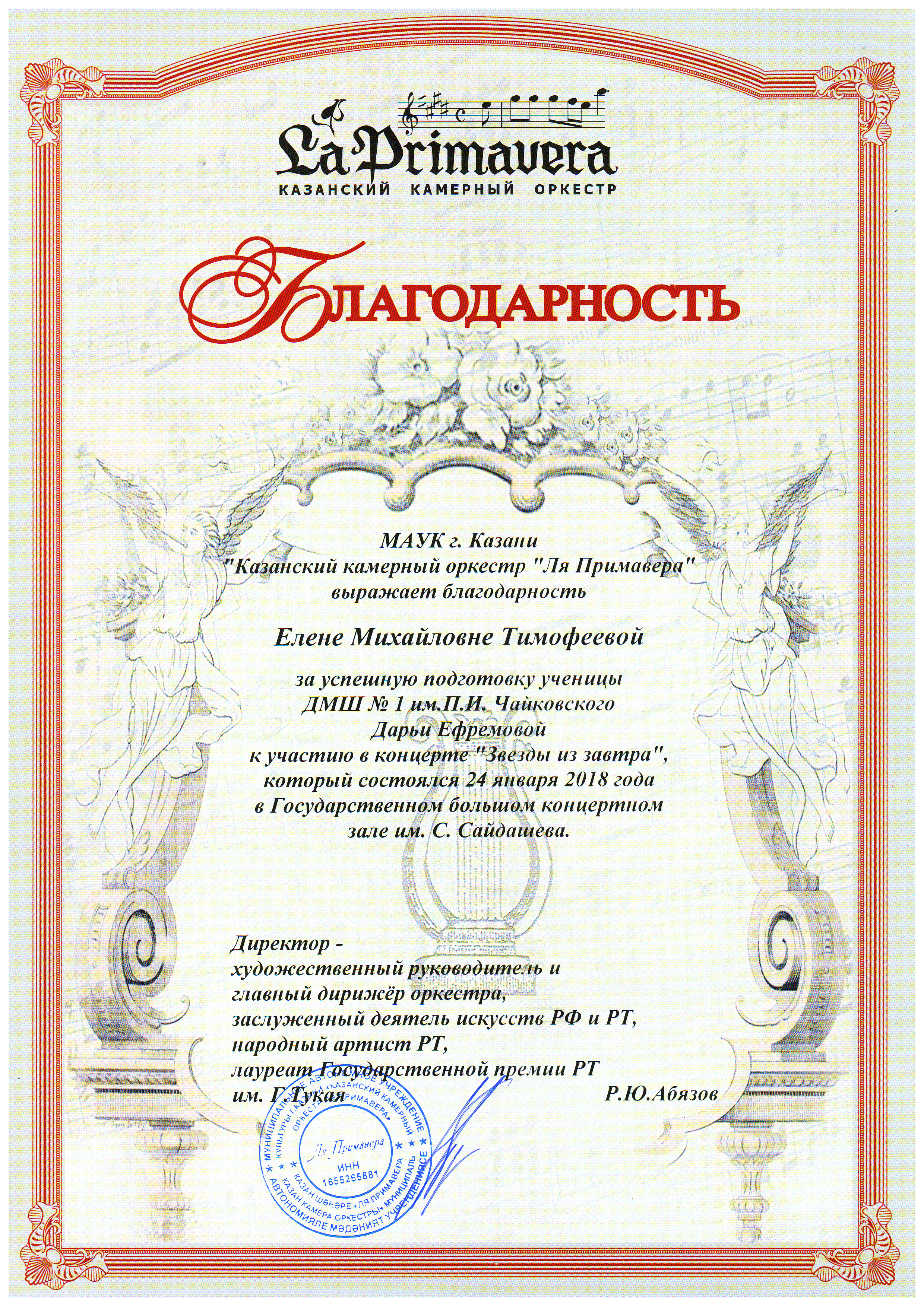 Концерт камерного оркестра La Primavera "Звёзды из завтра" - Кулеева Л.А., Благодарность за успрешную подготовку ученицы;