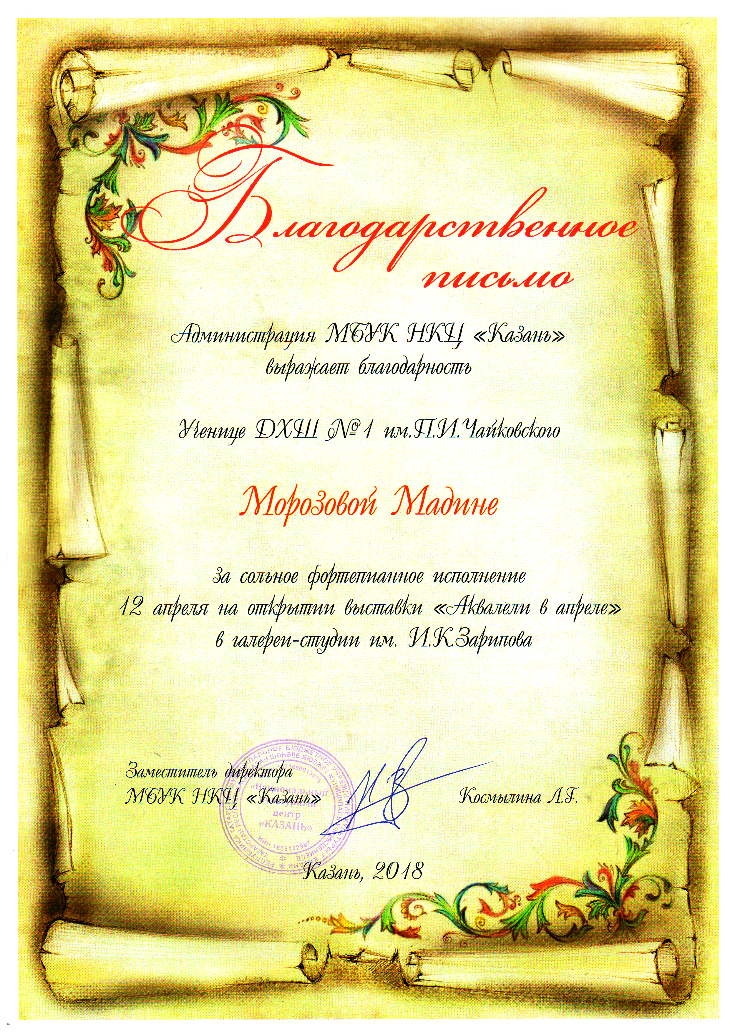 Галерея-студия им.И.К.Зарипова, выставка "Акварели в апреле" - Морозова Мадина, Благодарственное письмо;