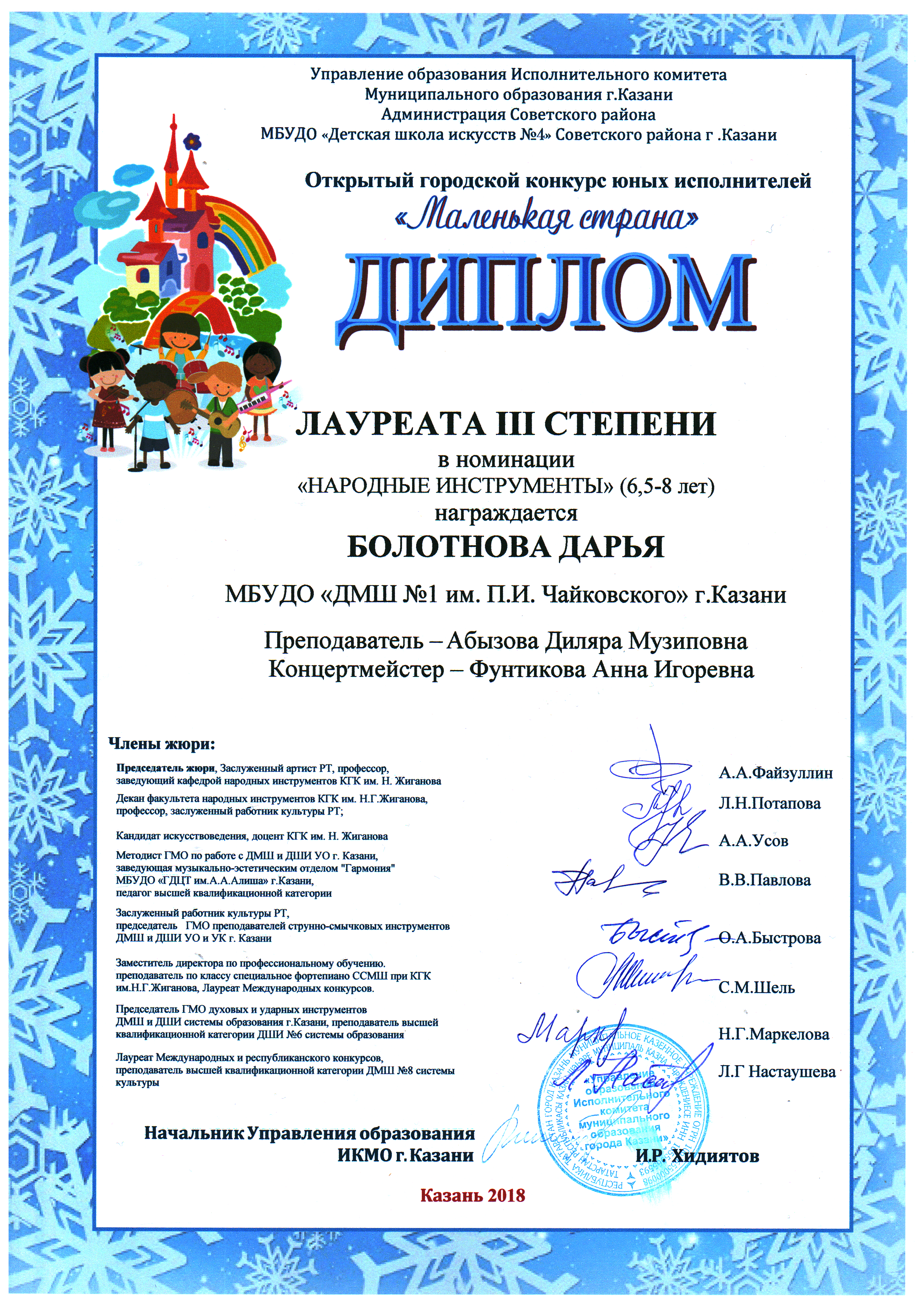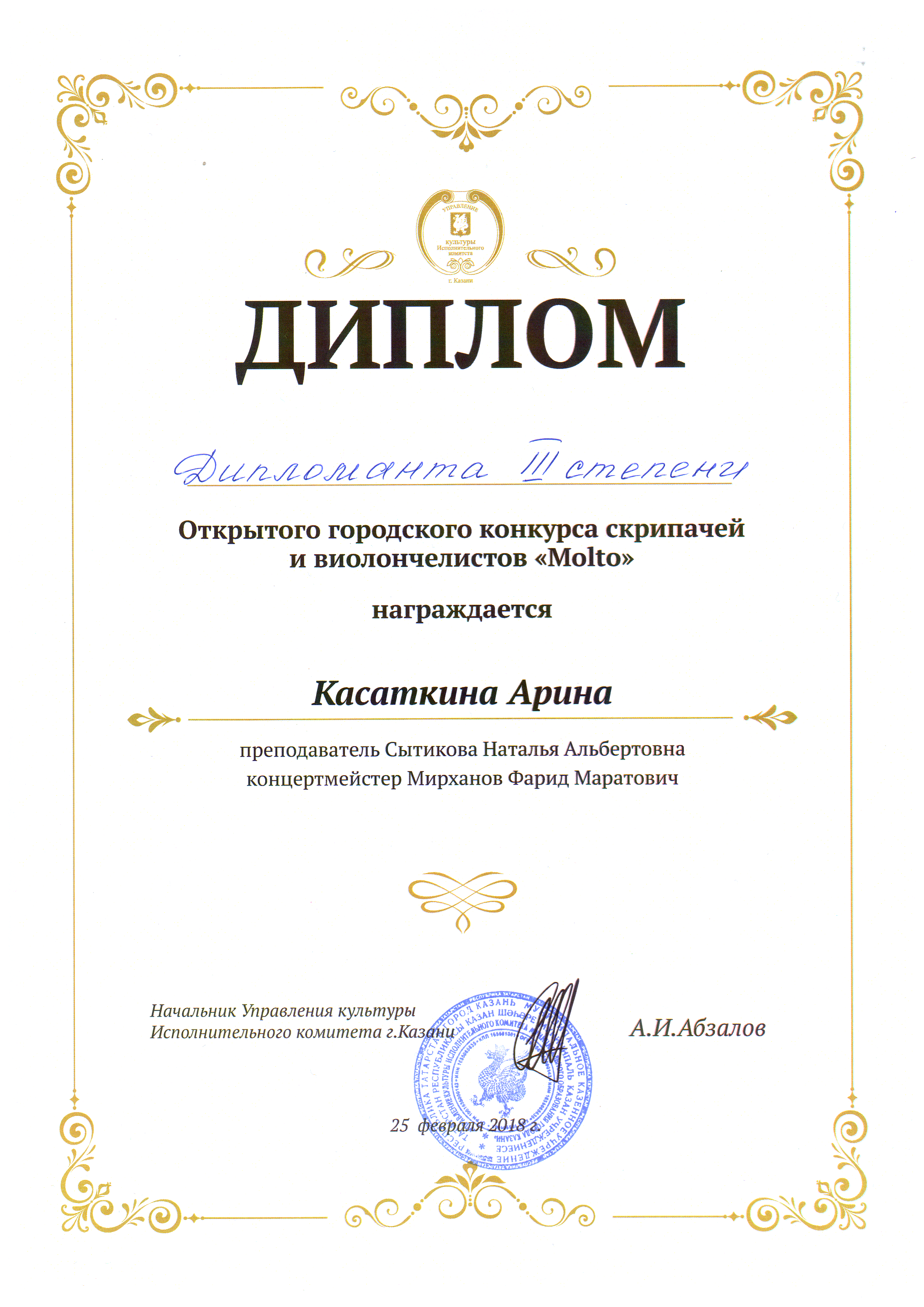 Открытый городской конкурс скрипачей и виолончелистов "Molto" - Ахтимьянова Малика, Дипломант I степени;