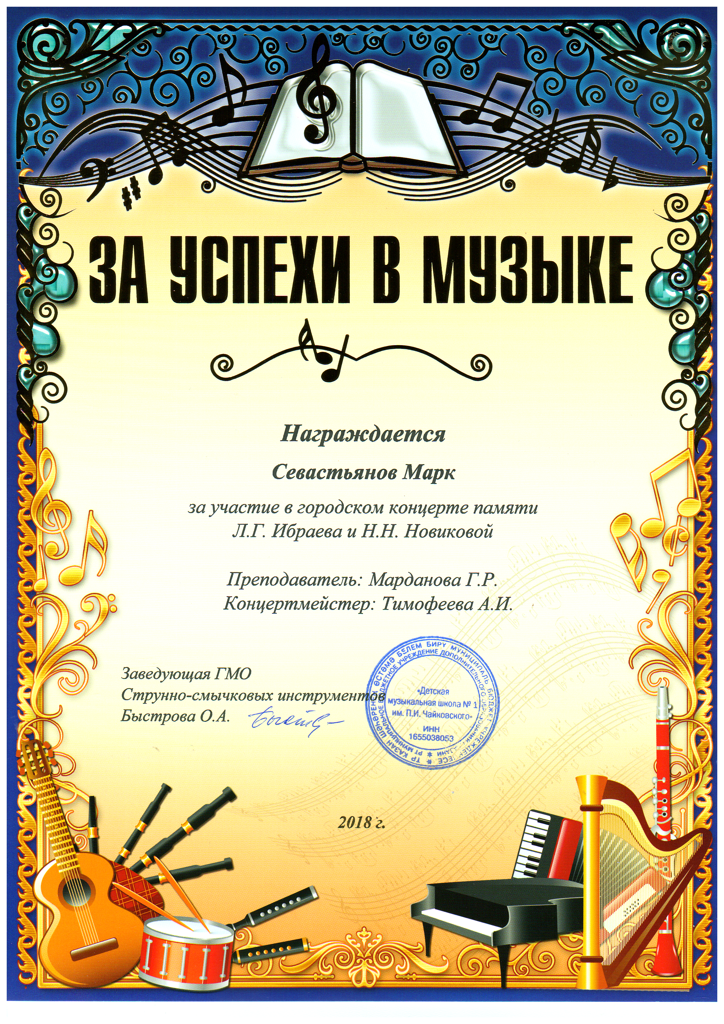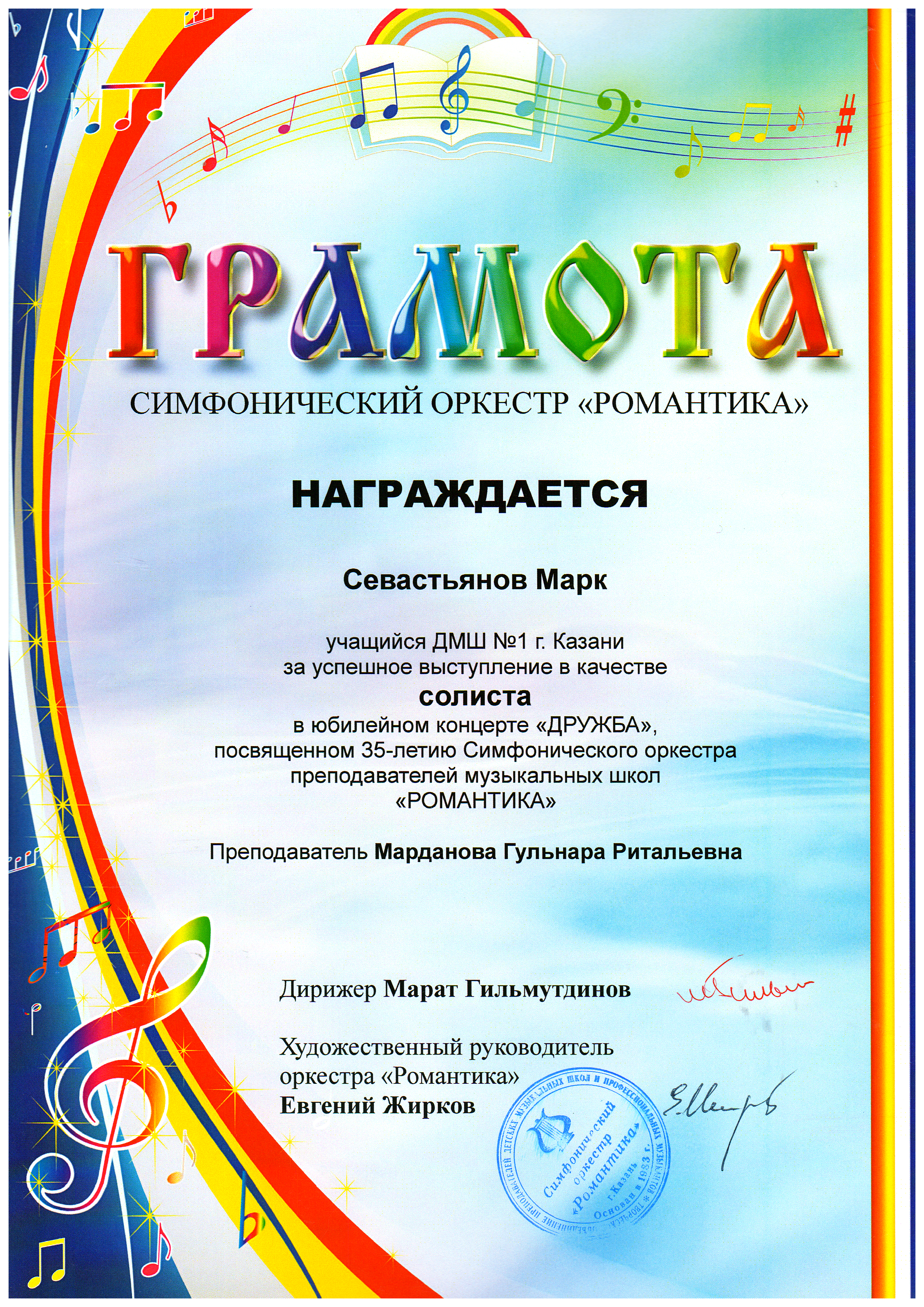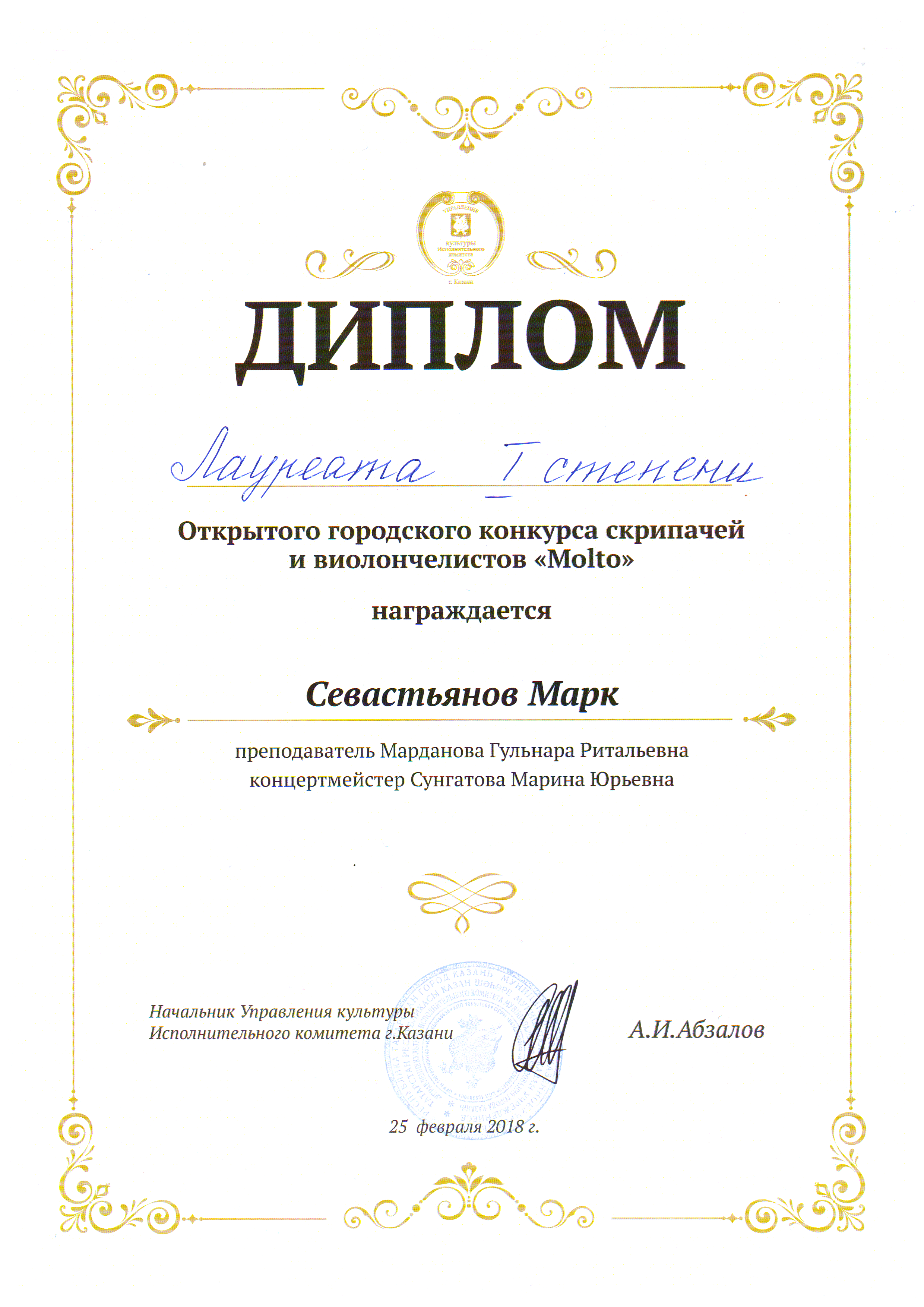 Открытый городской конкурс скрипачей и виолончелистов "Molto" - Севастьянов Марк, Лауреат I степени;