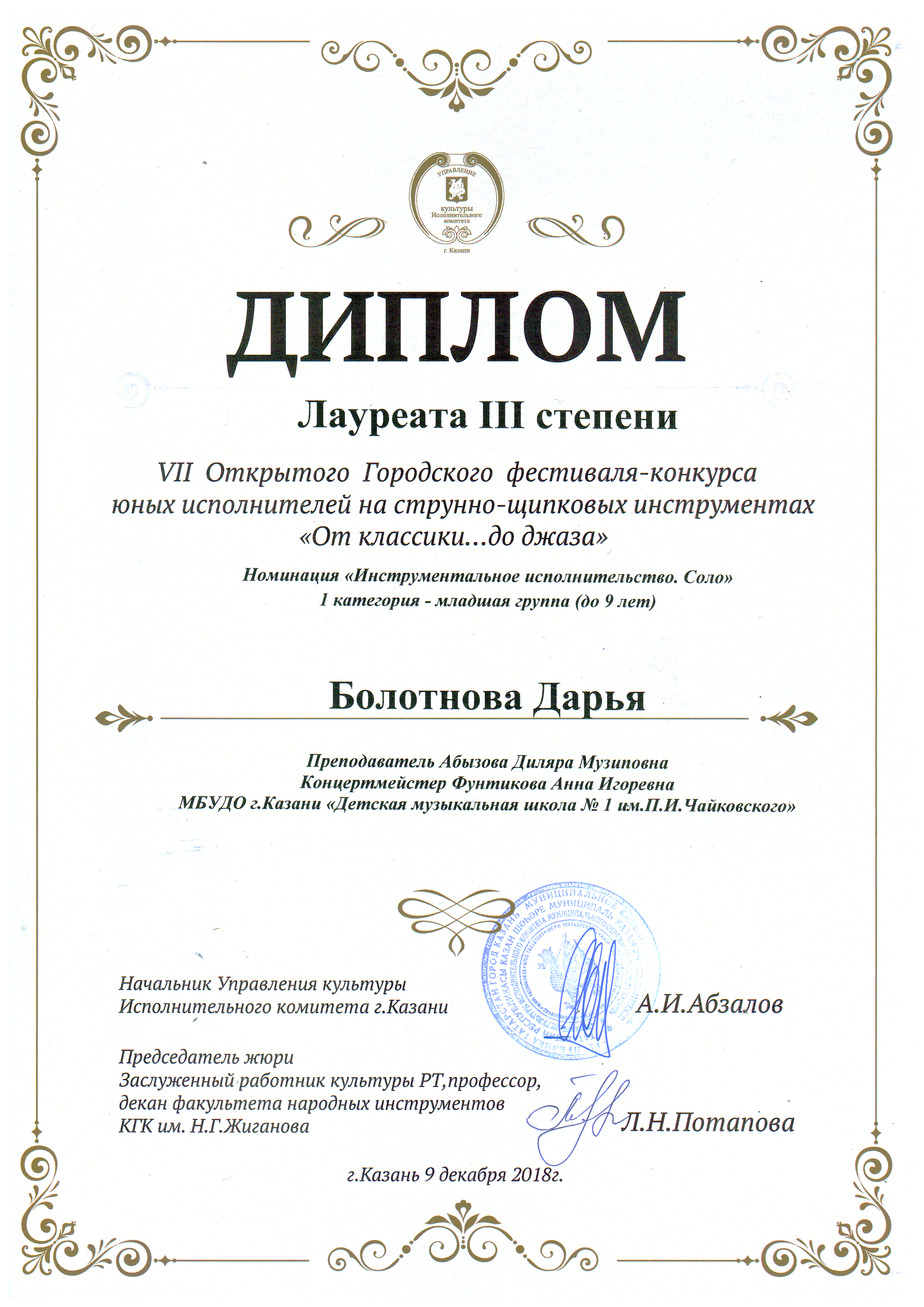 VII Открытый Городской фестиваль-конкурс юных исполнителей на струнно-щипковых инструментах "От классики... до джаза" - , Лауреат III степени, класс ., концертмейстер Фунтикова А.И.;