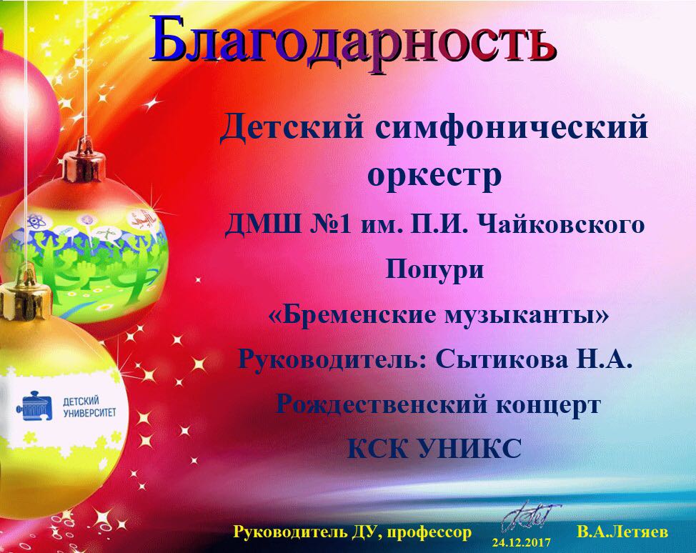 Рождественский концерт КСК "УНИКС" - Детский симфонический оркестр, Благодарность;