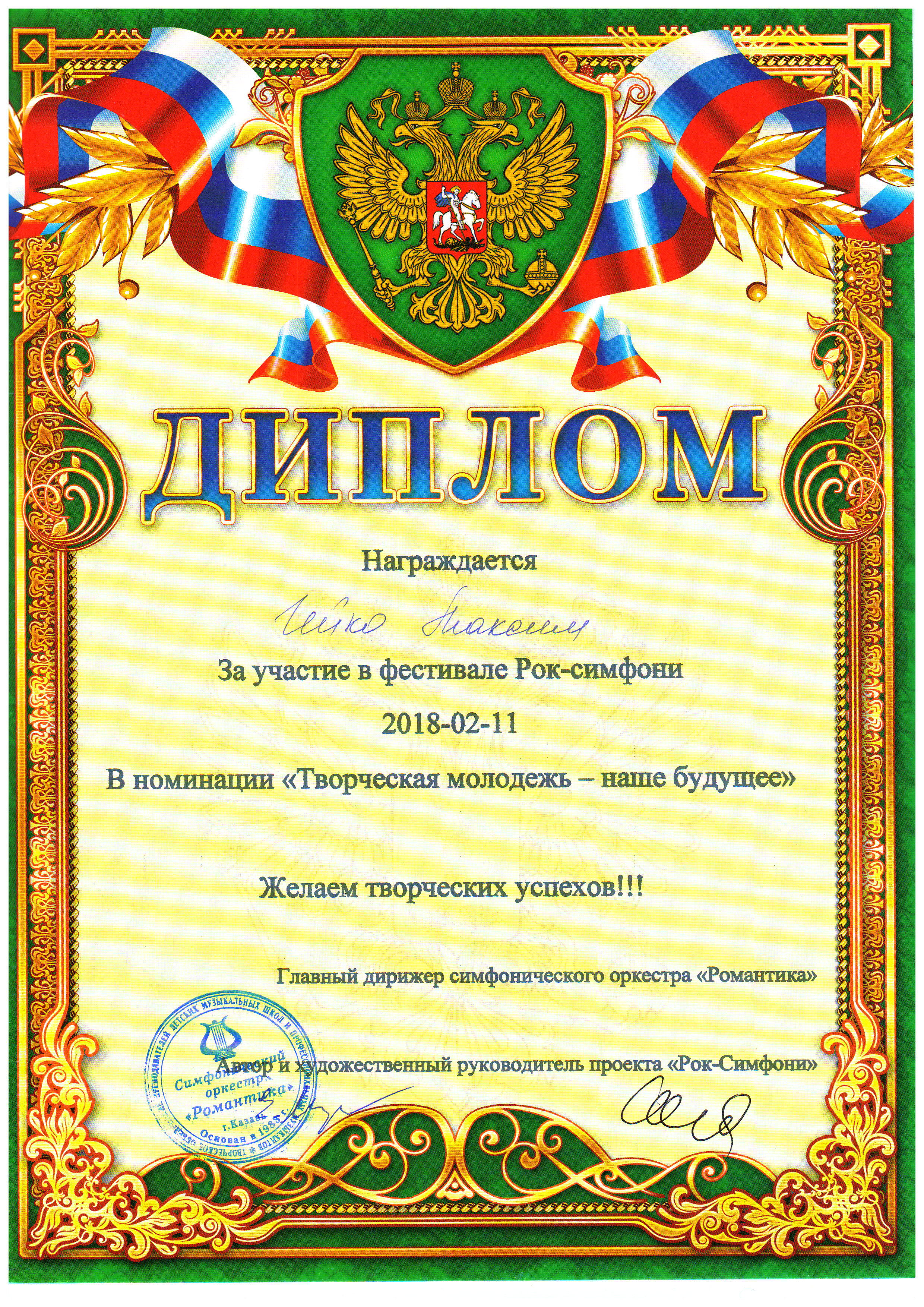 Фестиваль рок-симфони, номинация "Творческая молодёжь - наше будущее" - Гейко Максим, Диплом;