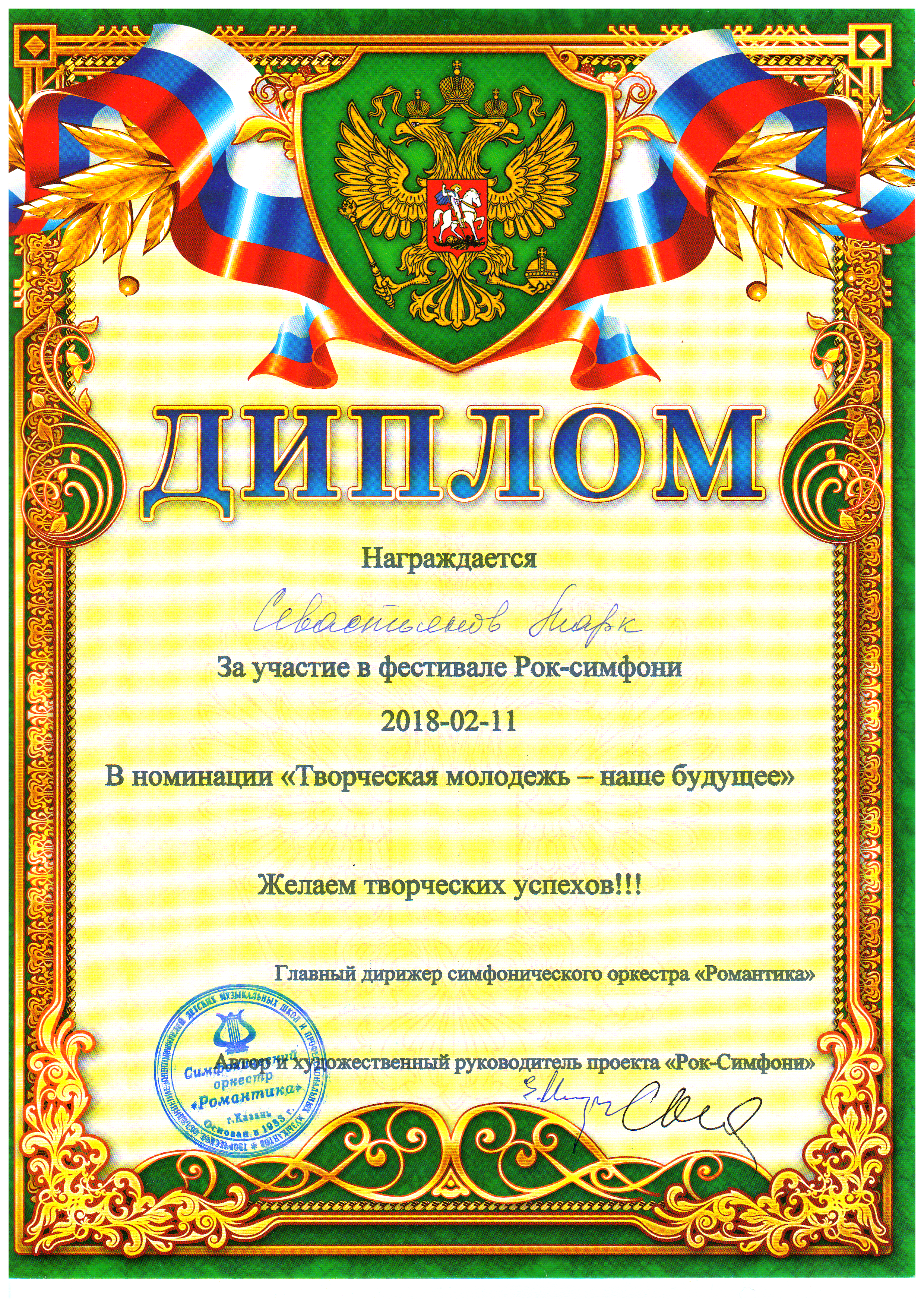 Фестиваль рок-симфони, номинация "Творческая молодёжь - наше будущее" - Севастьянов Марк, Диплом;