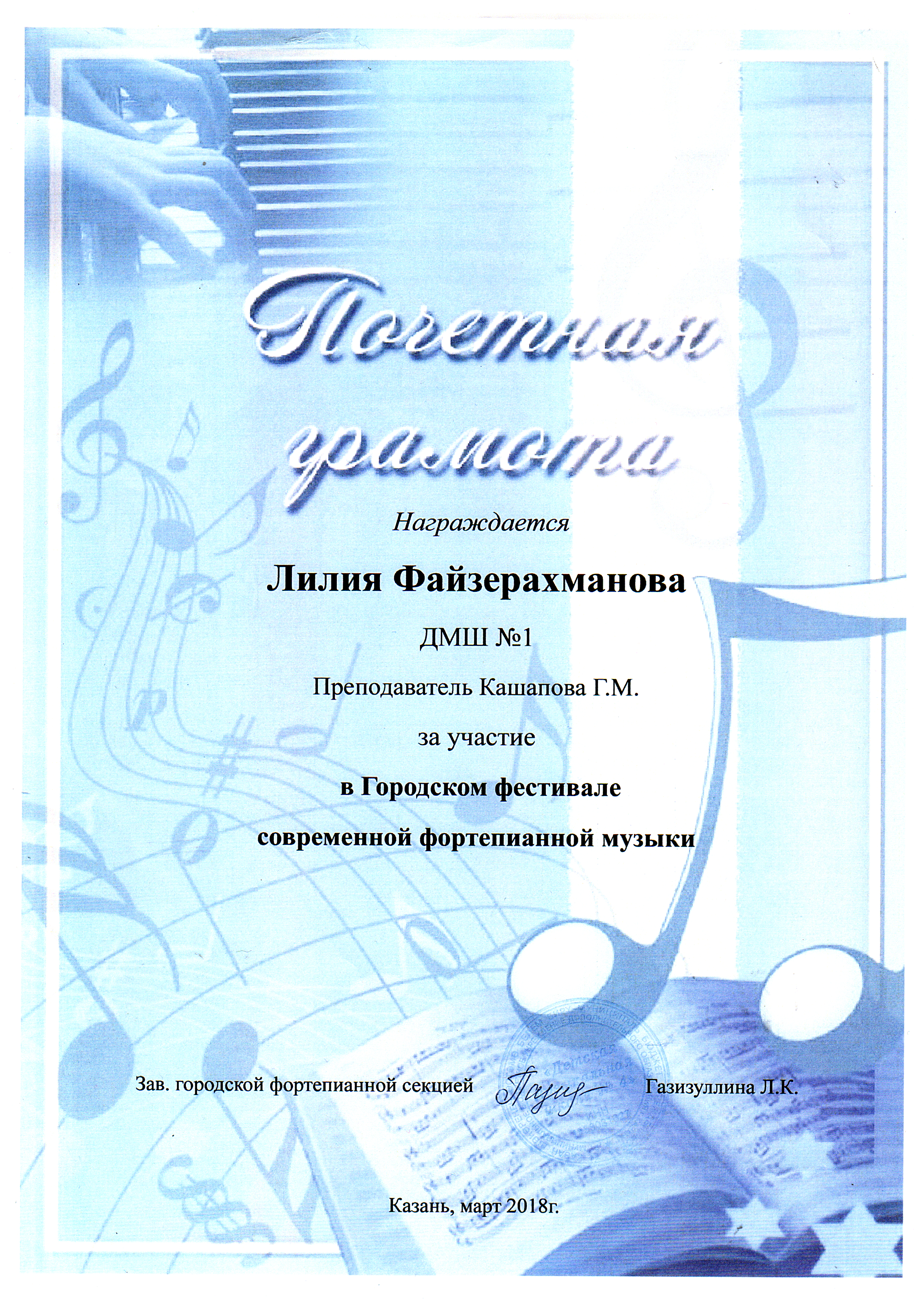 Городской фестиваль современной фортепианной музыки - Файзерахманова Лилия, Полчётная грамота;