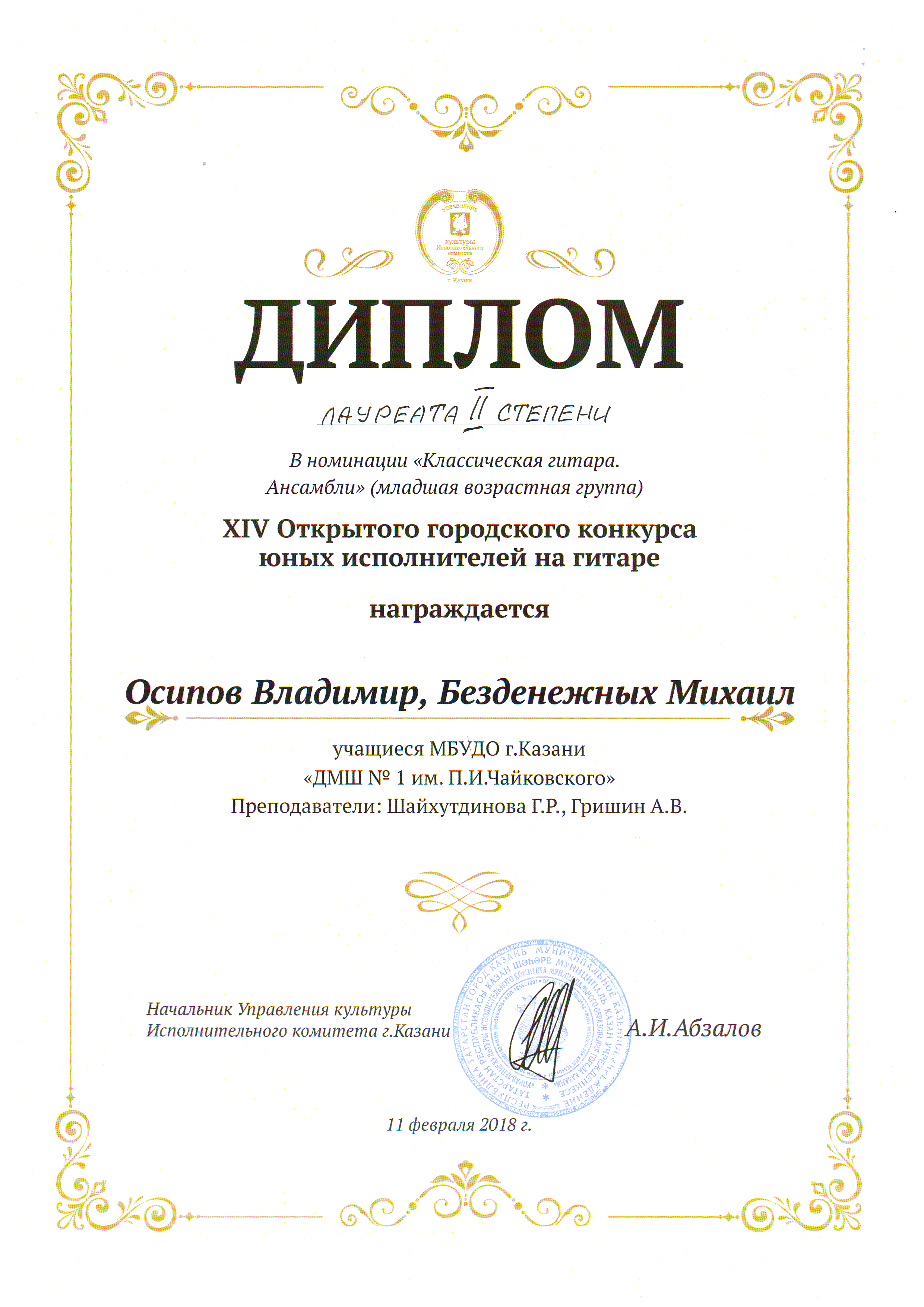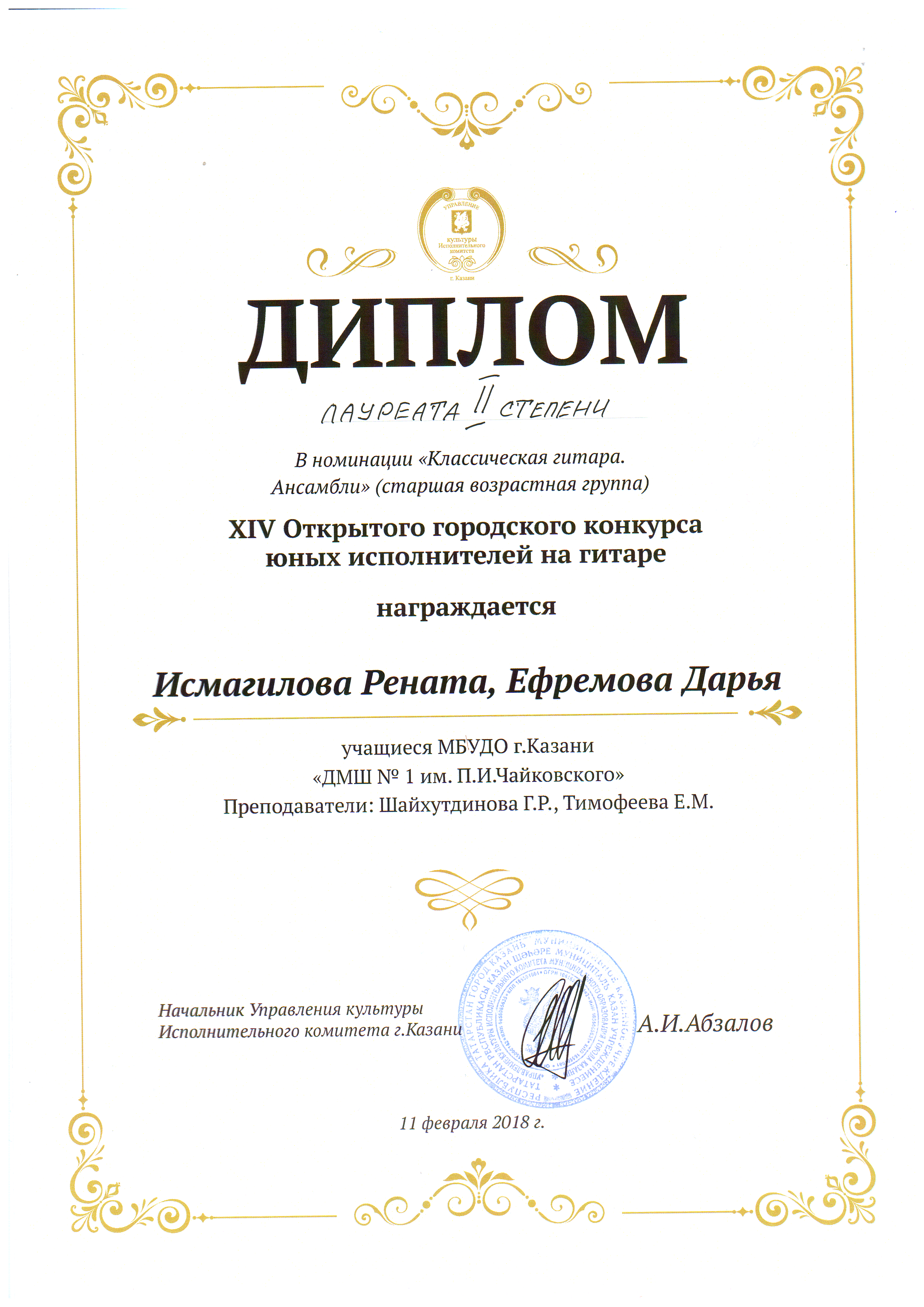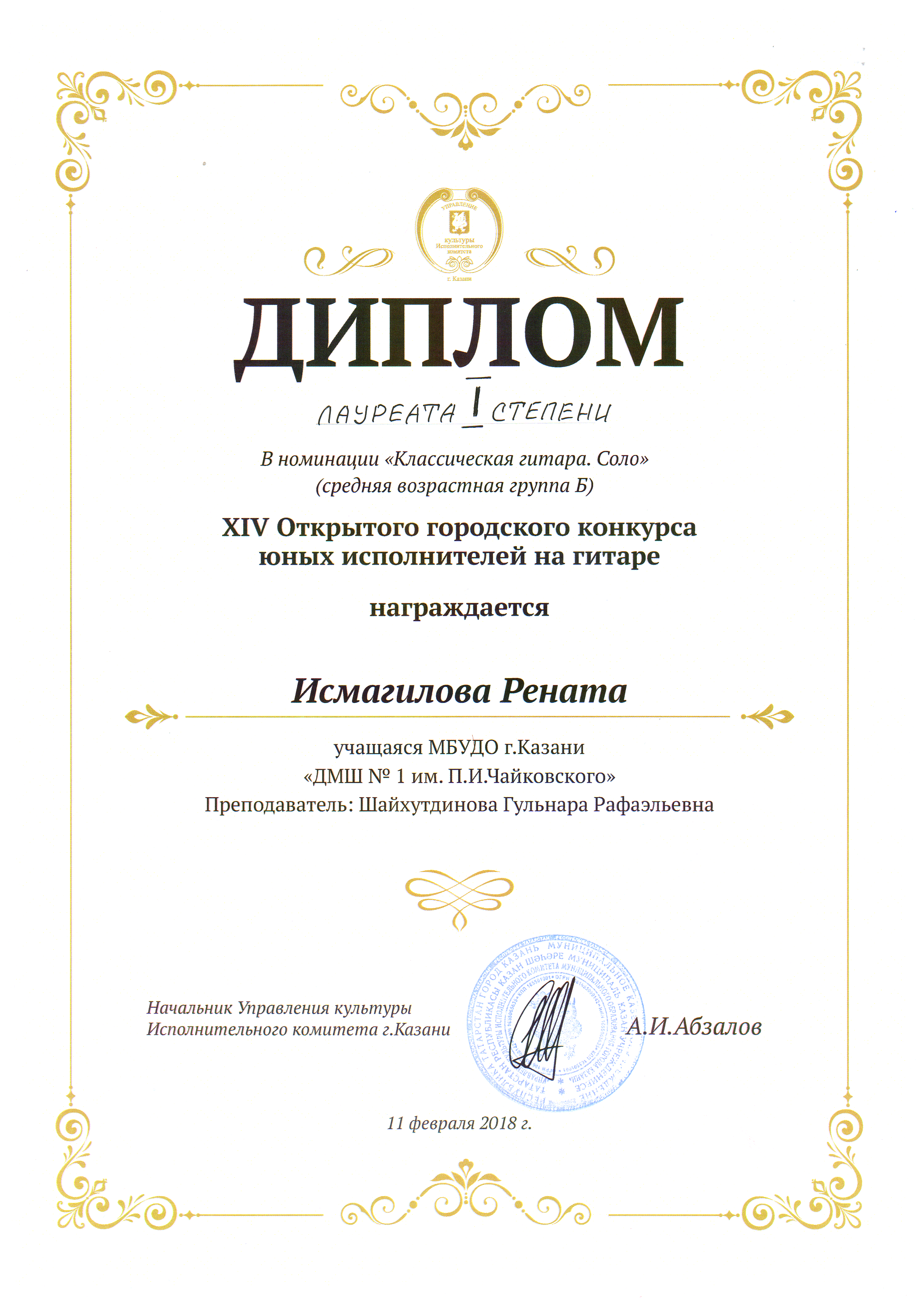 XIV Открытый Городской конкурс юных исполнителей на гитаре - Исмагилова Рената, Лауреат I степени;
