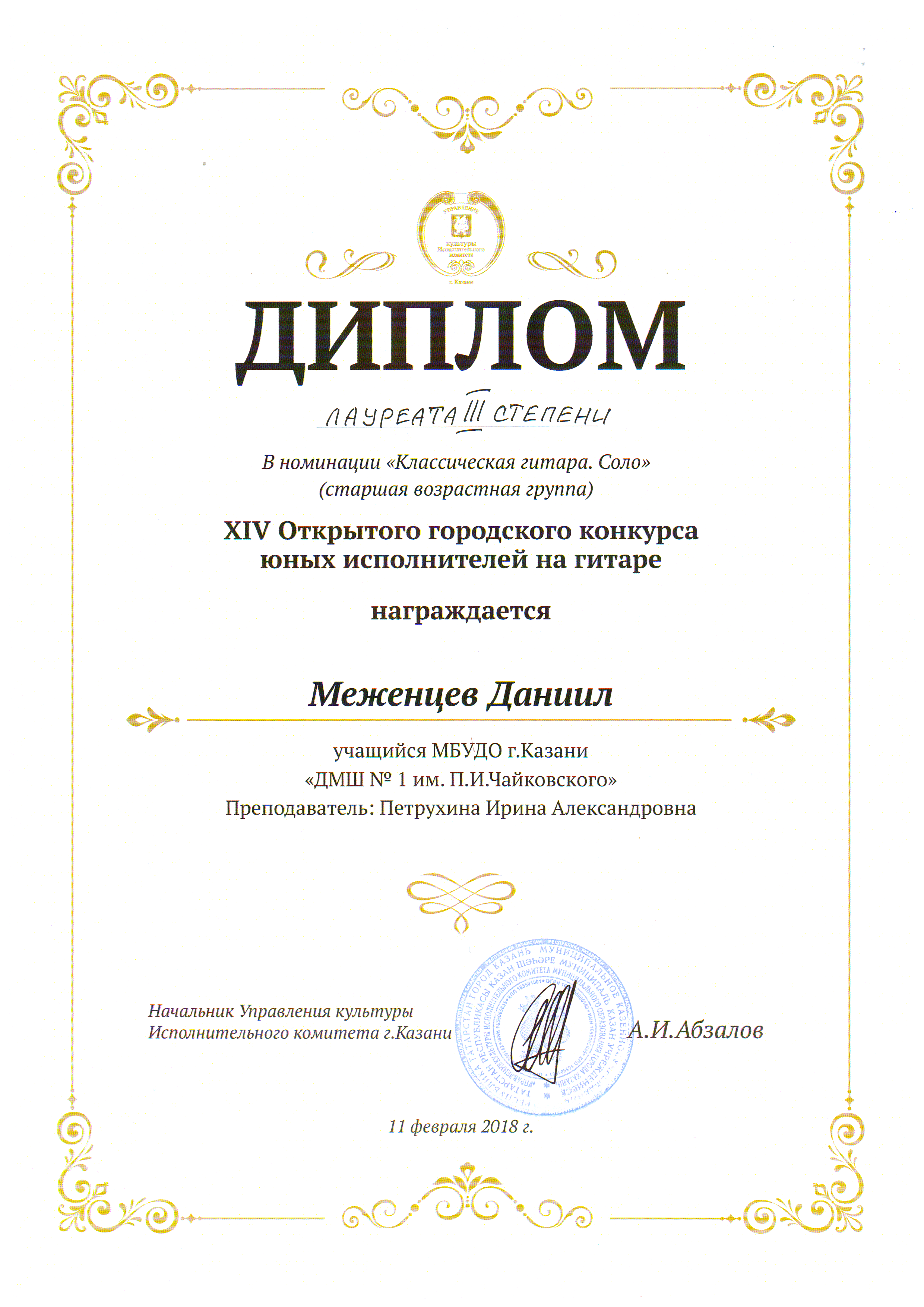 XIV Открытый Городской конкурс юных исполнителей на гитаре - Меженцев Даниил, Лауреат III степени;