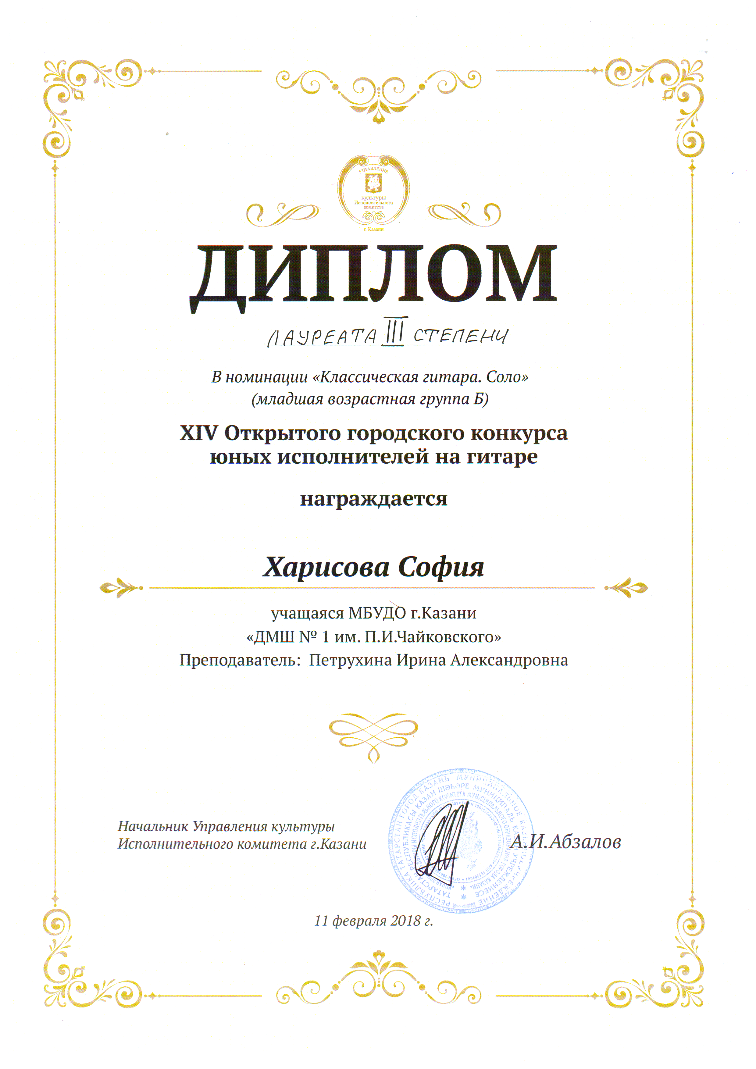 XIV Открытый Городской конкурс юных исполнителей на гитаре - Харисова София, Лауреат III степени;