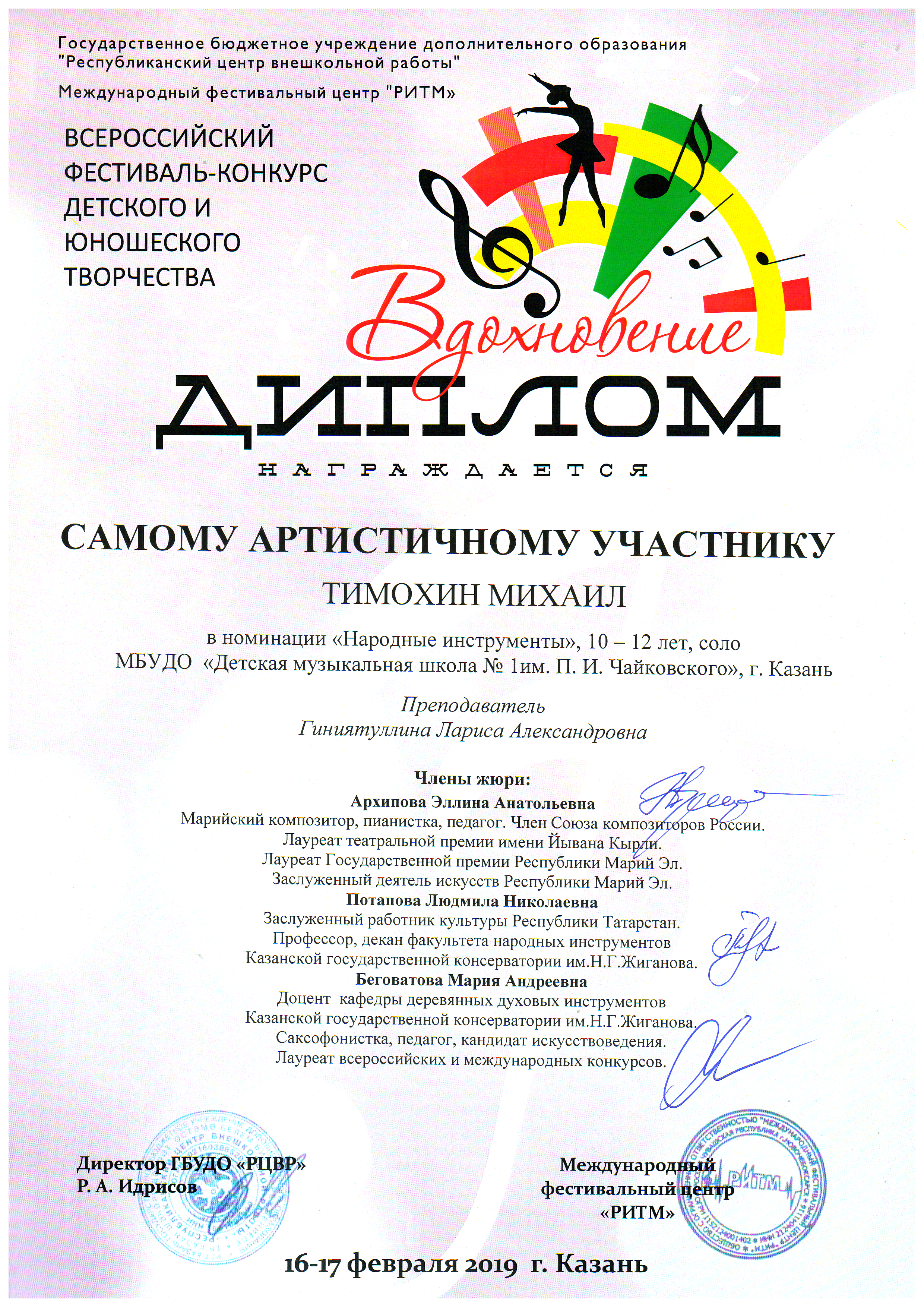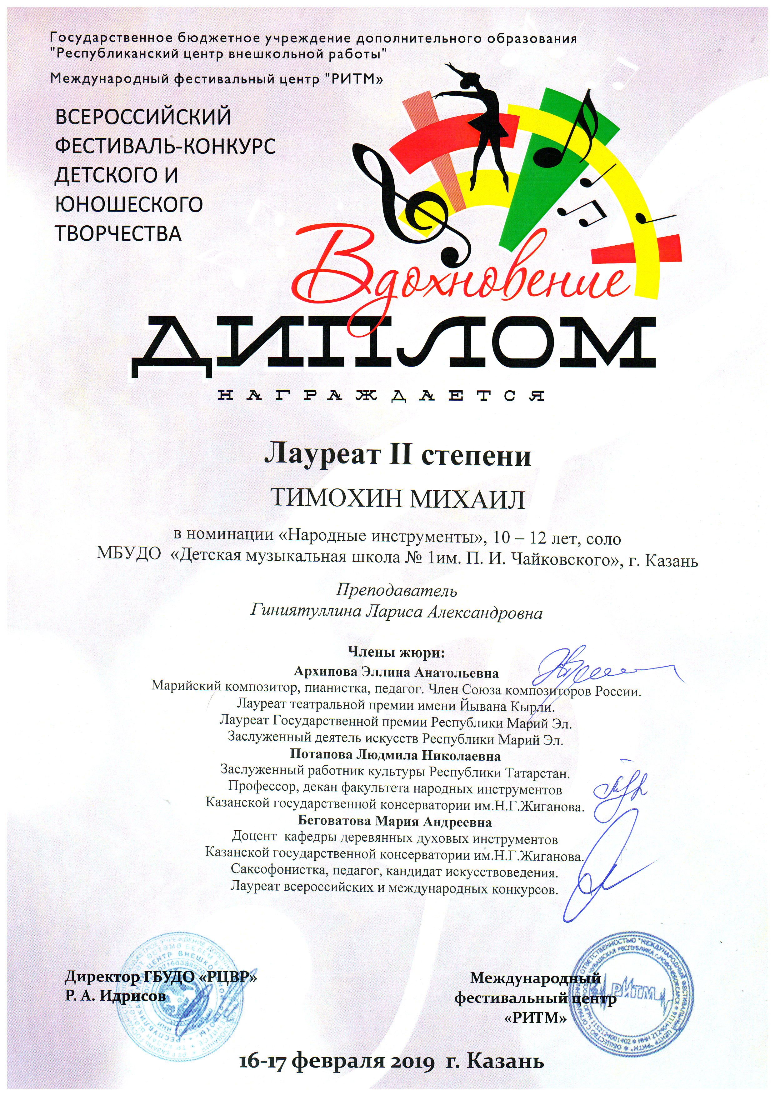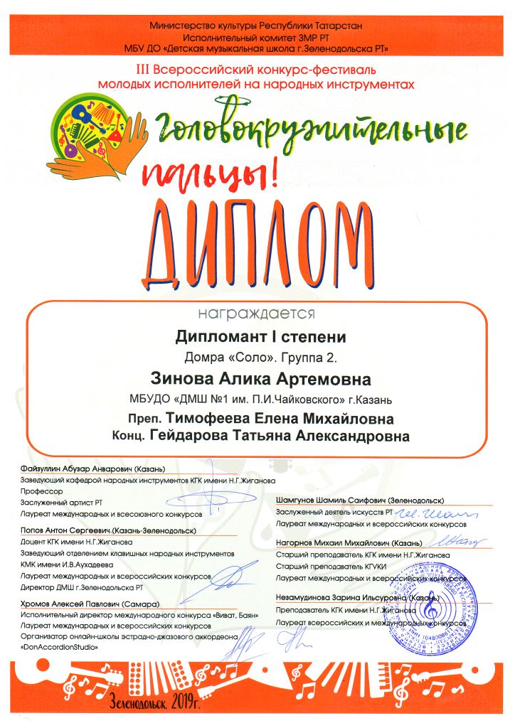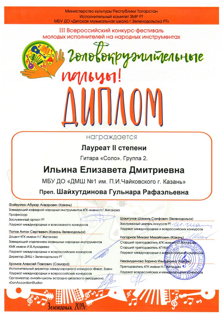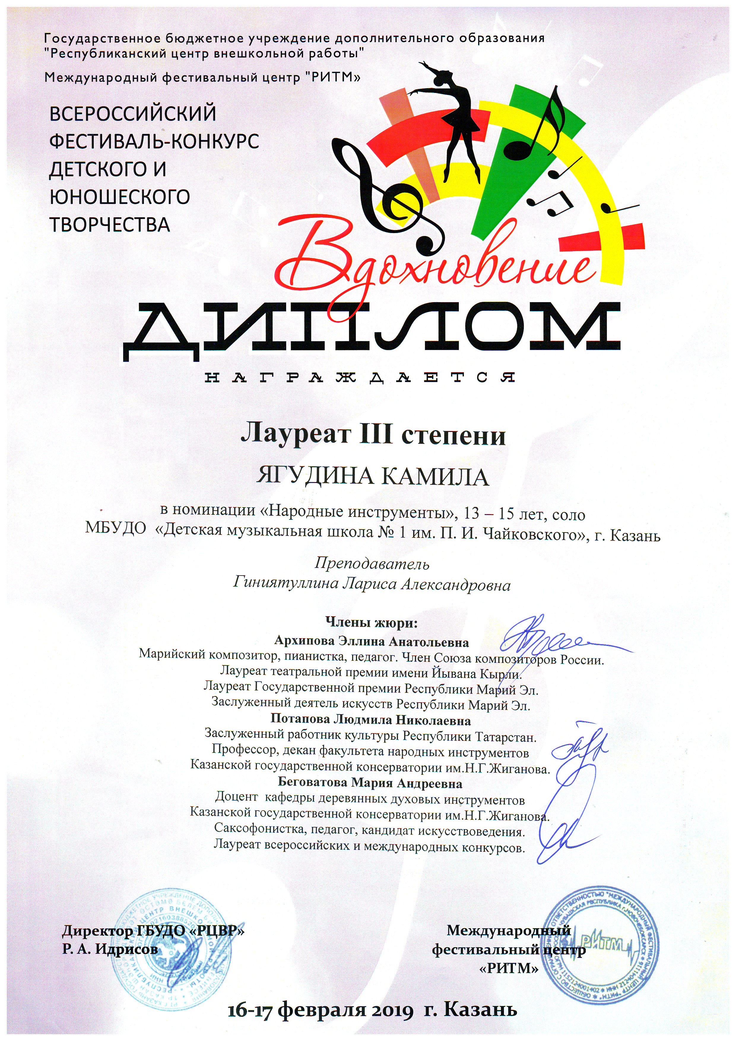 III Всероссийский конкурс-фестиваль молодых исполнителей на народных инструментах "Головокружительные пальцы" - Файзерахманова Ляйсан, Лауреат II степени, класс Петрухиной И.А.;