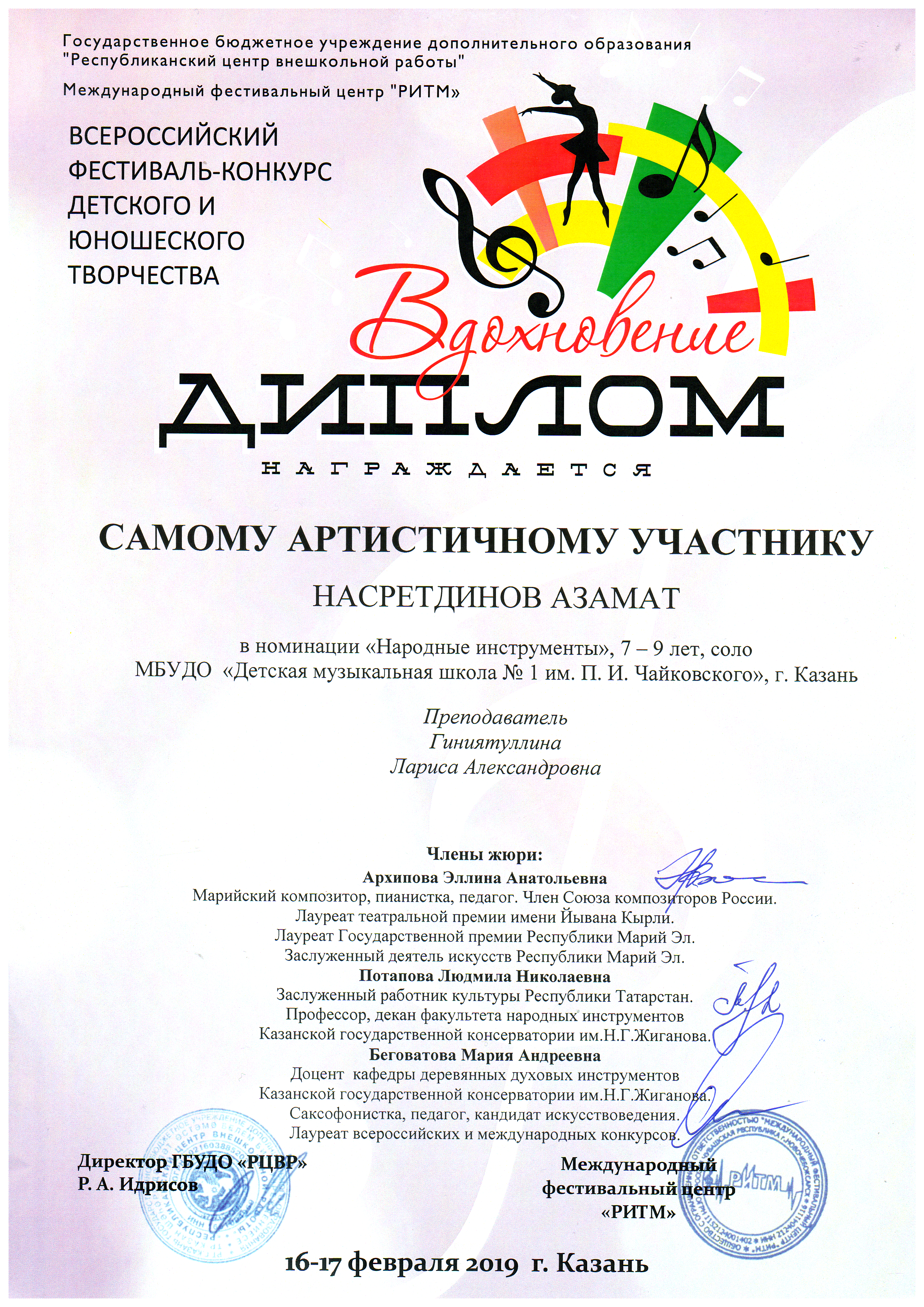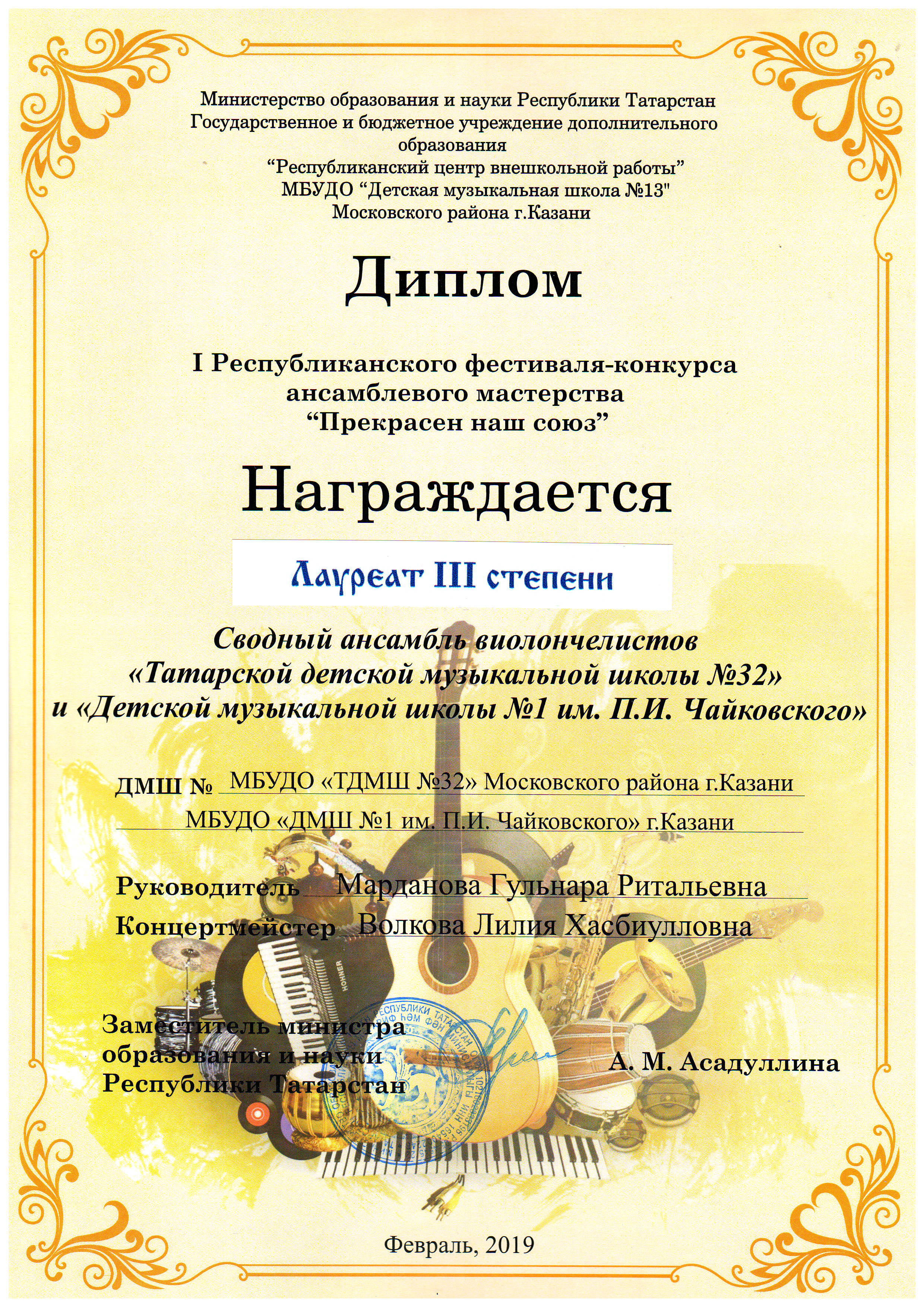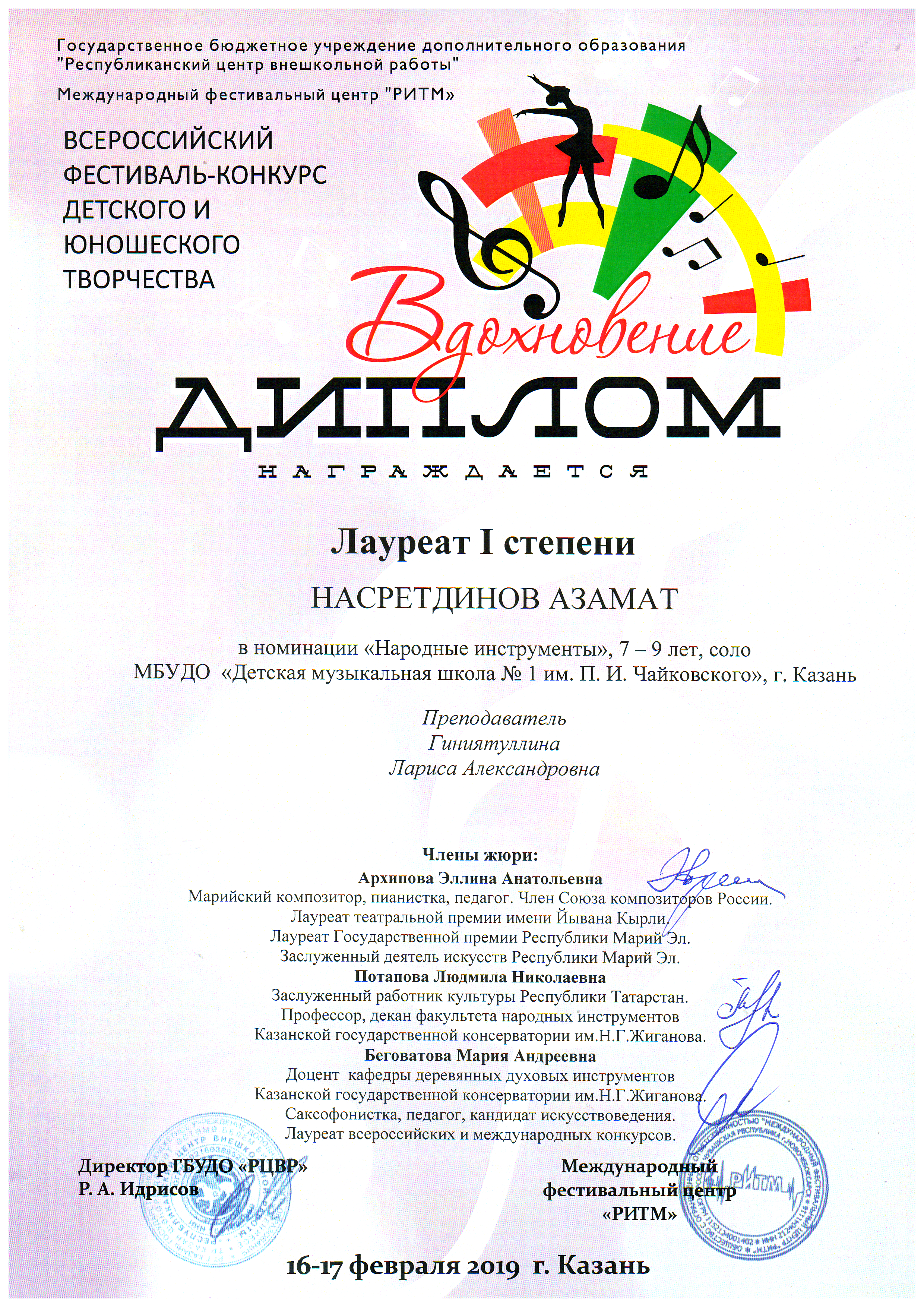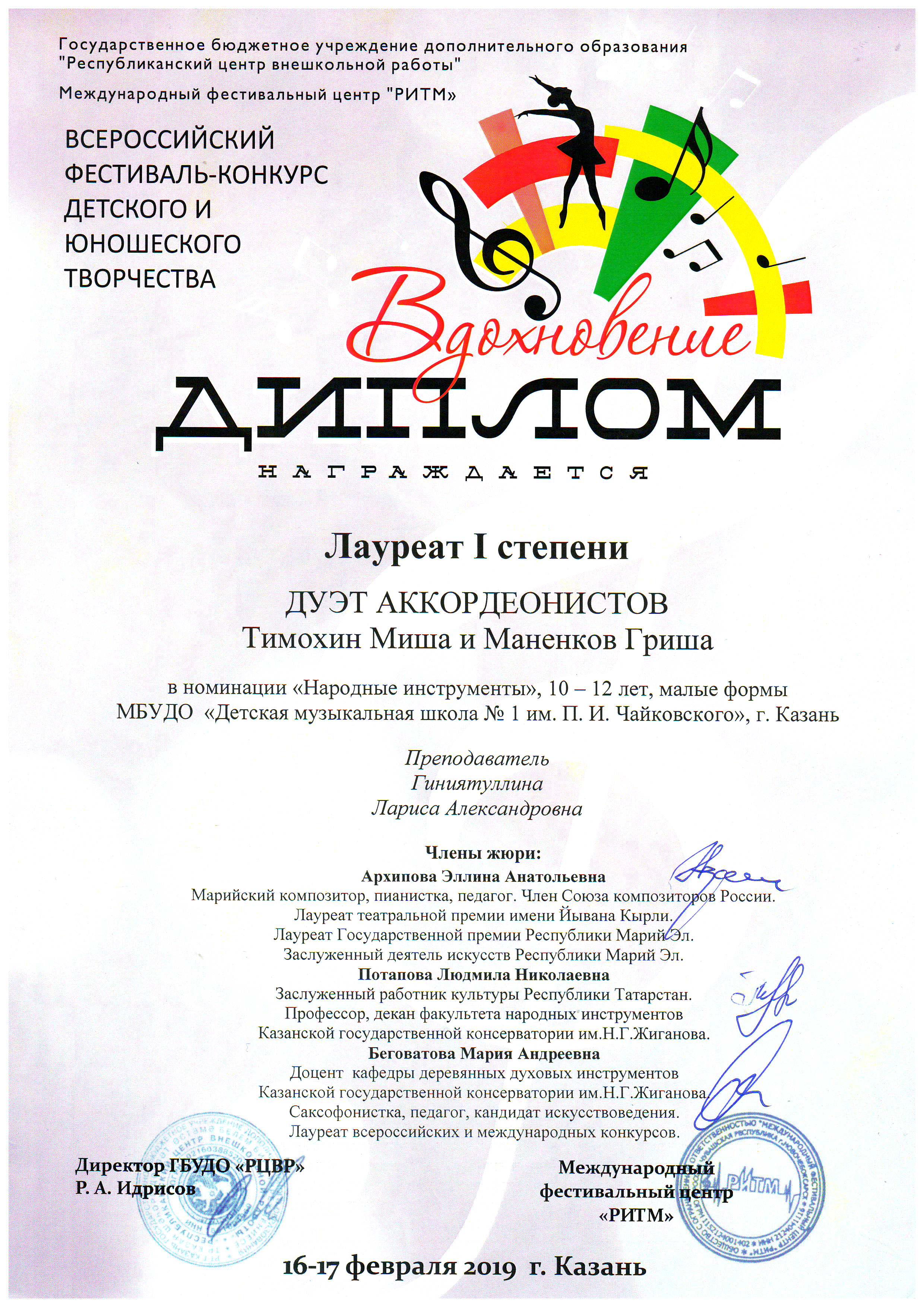 III Всероссийский конкурс-фестиваль молодых исполнителей на народных инструментах "Головокружительные пальцы" - Файзерахманова Ляйсан, Лауреат II степени, класс Петрухиной И.А.;