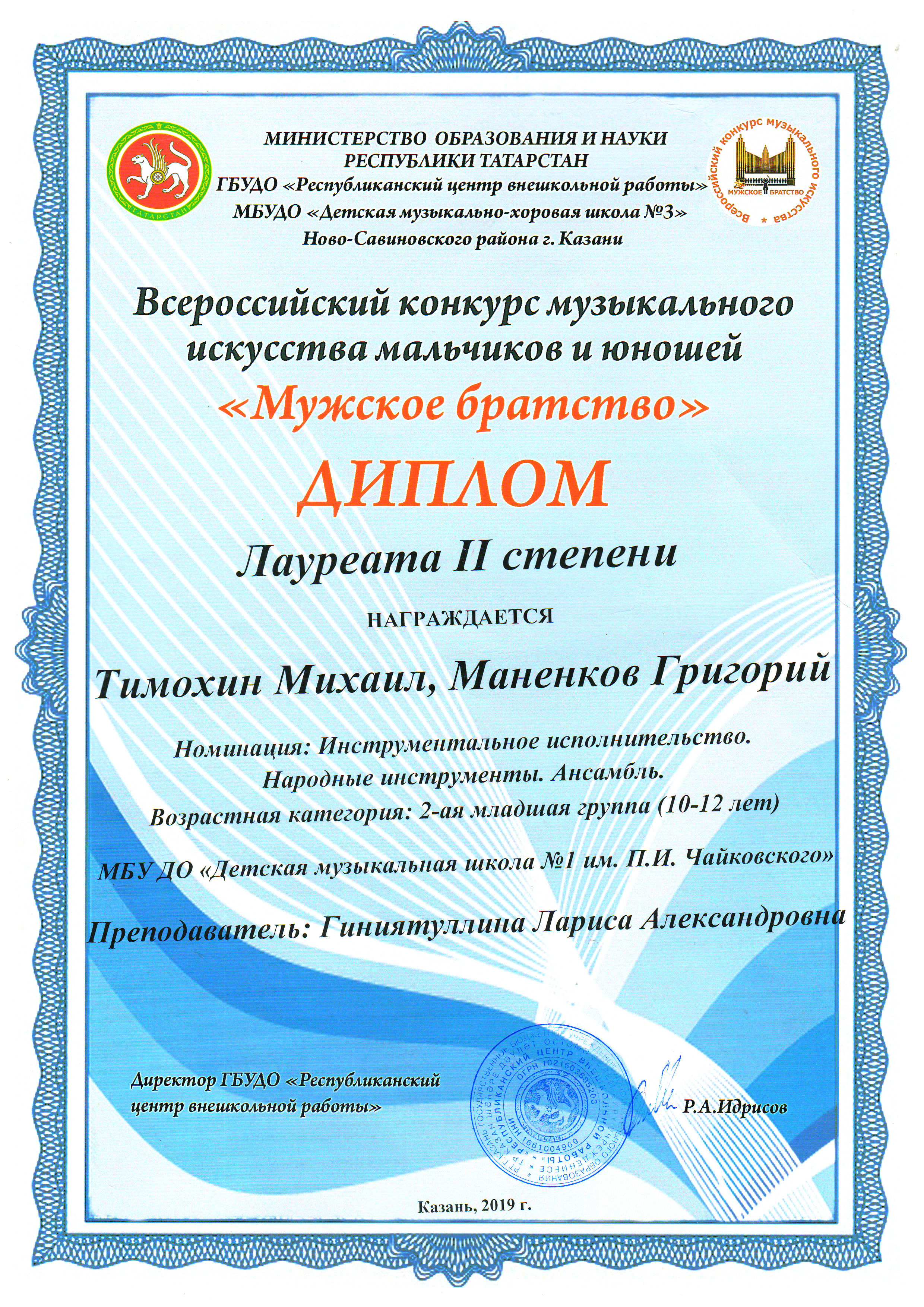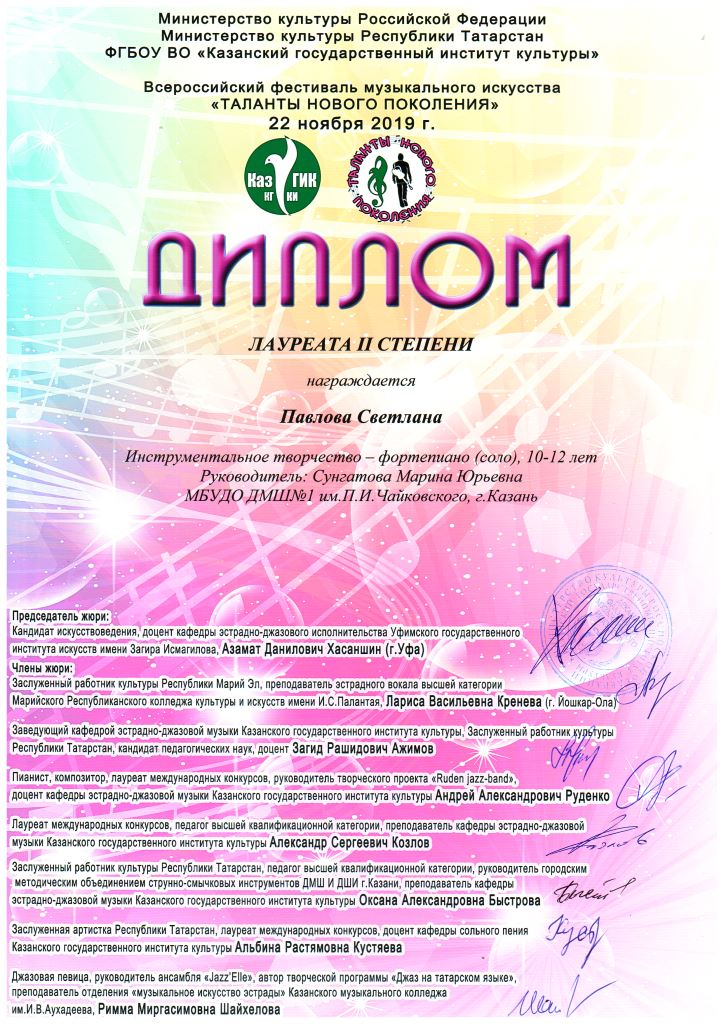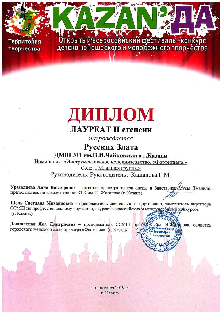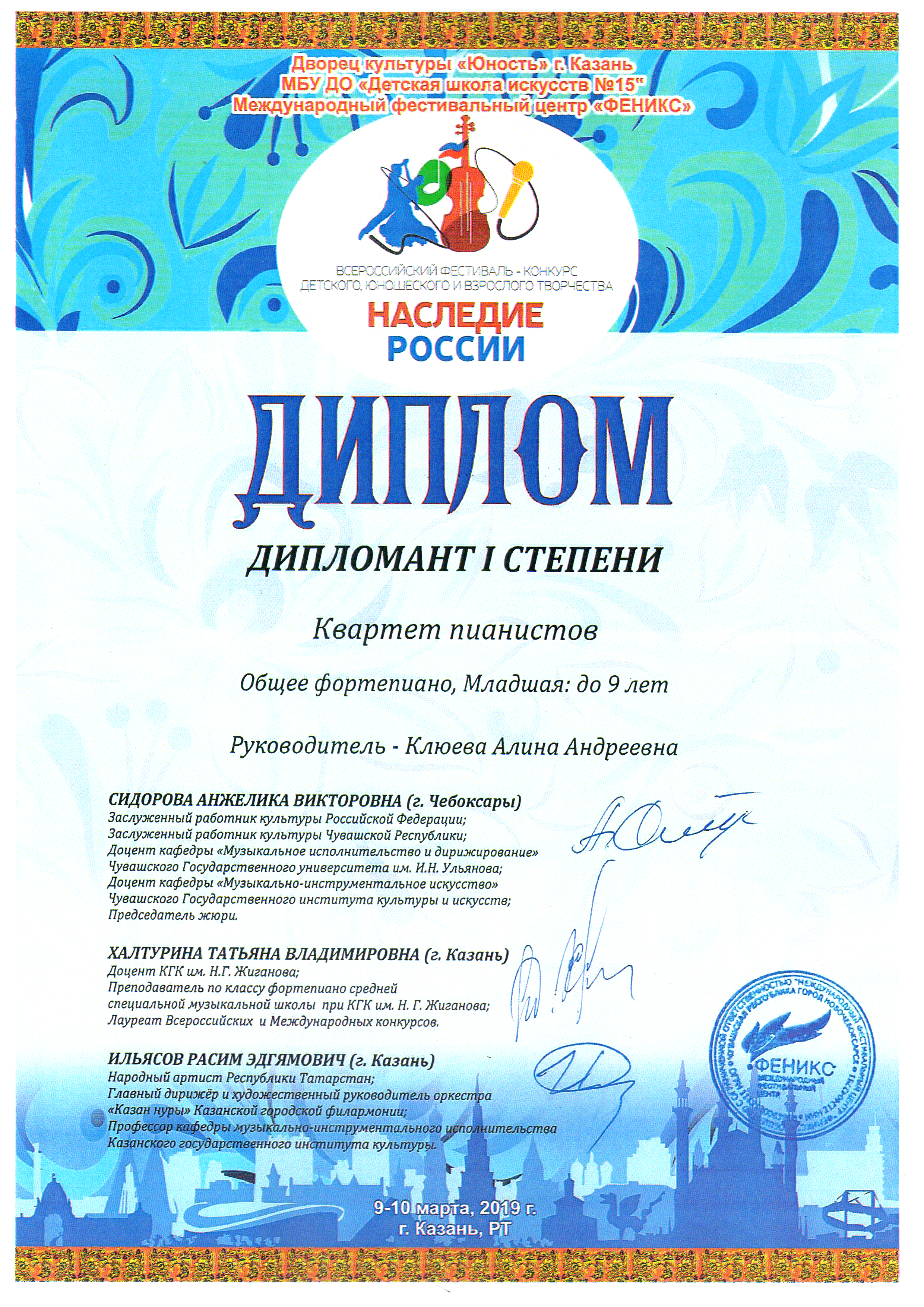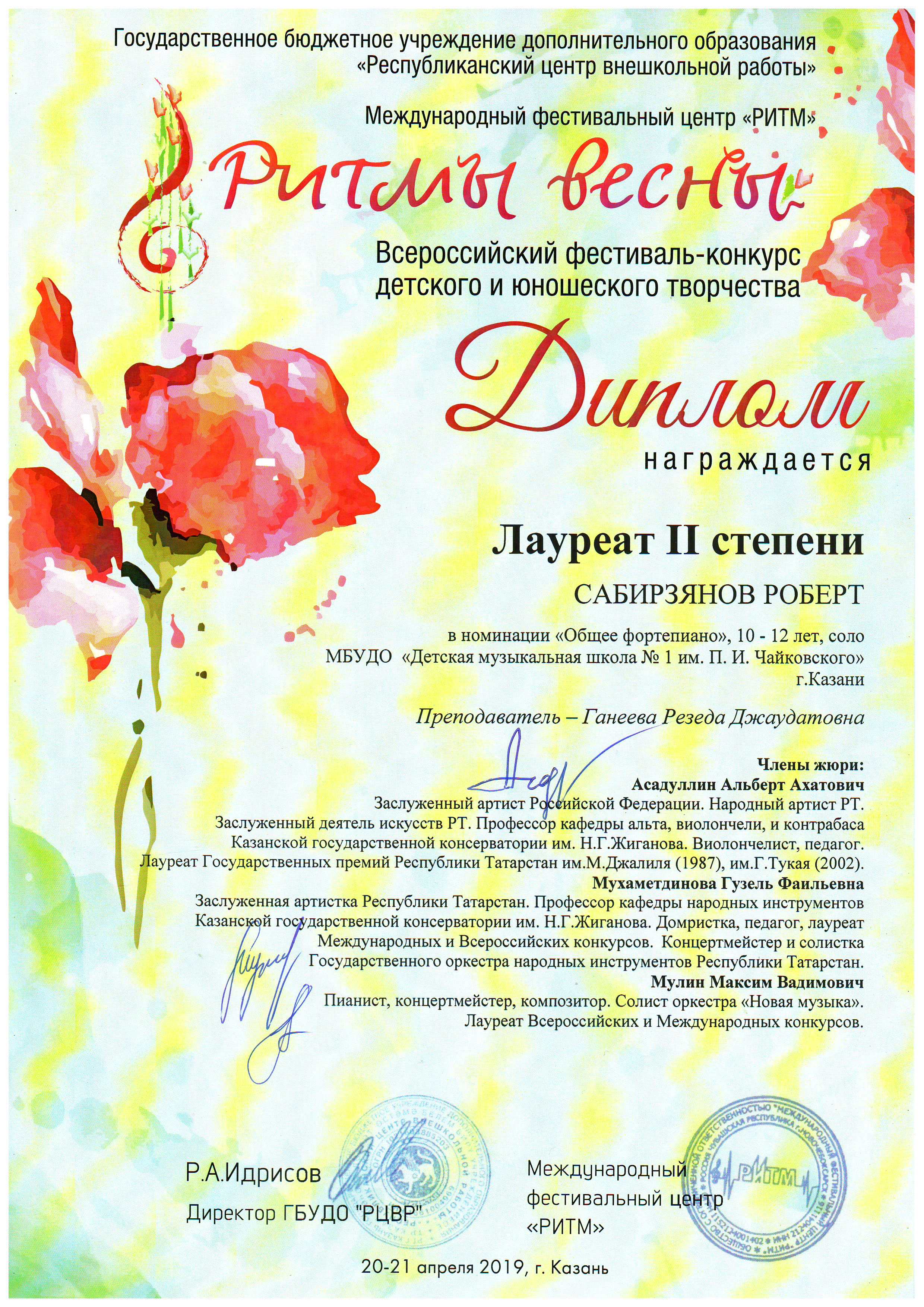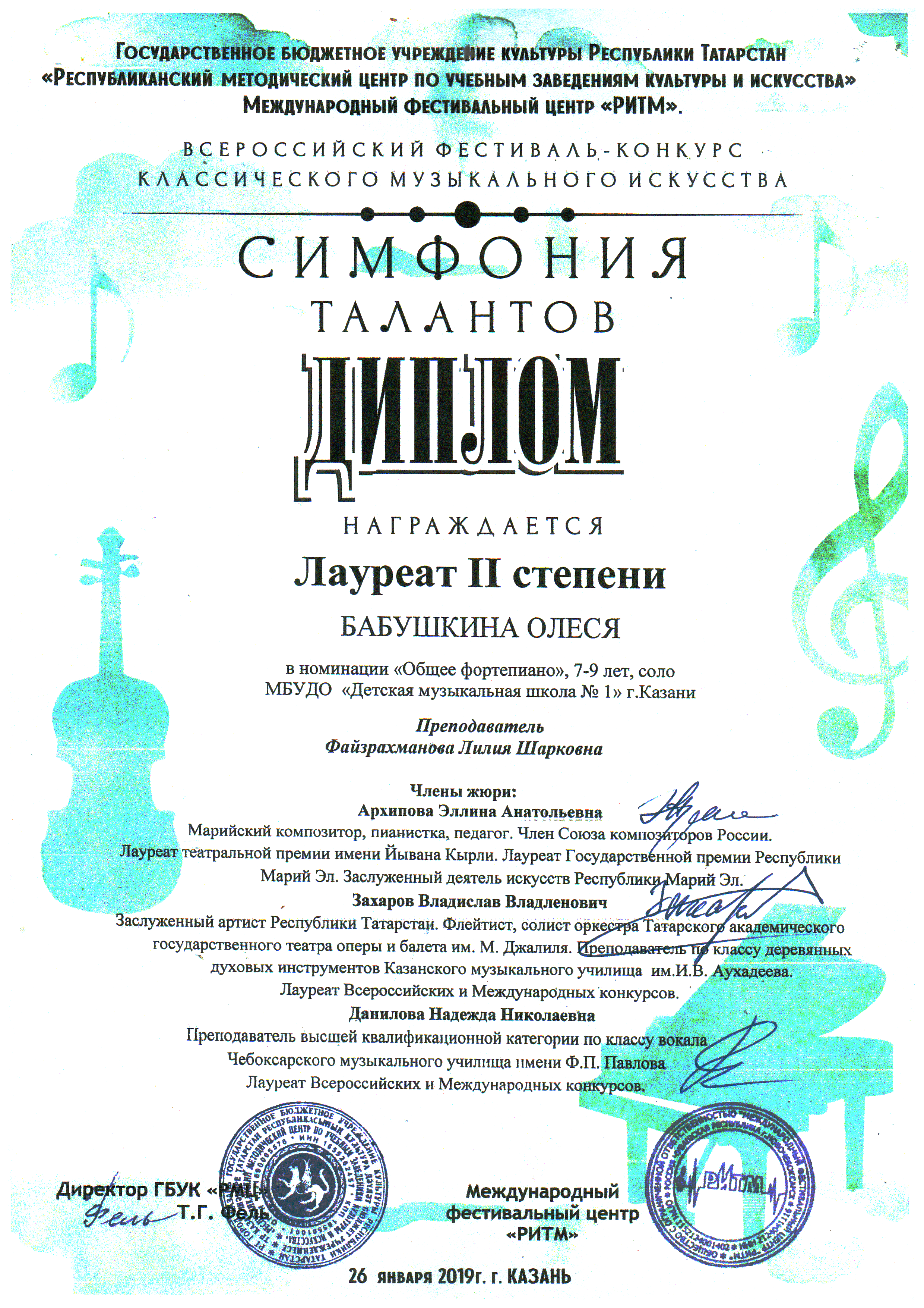 III Всероссийский конкурс-фестиваль молодых исполнителей на народных инструментах "Головокружительные пальцы" - Файзерахманова Ляйсан, Лауреат II степени, класс Петрухиной И.А.;