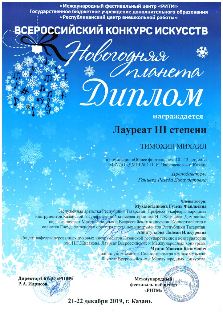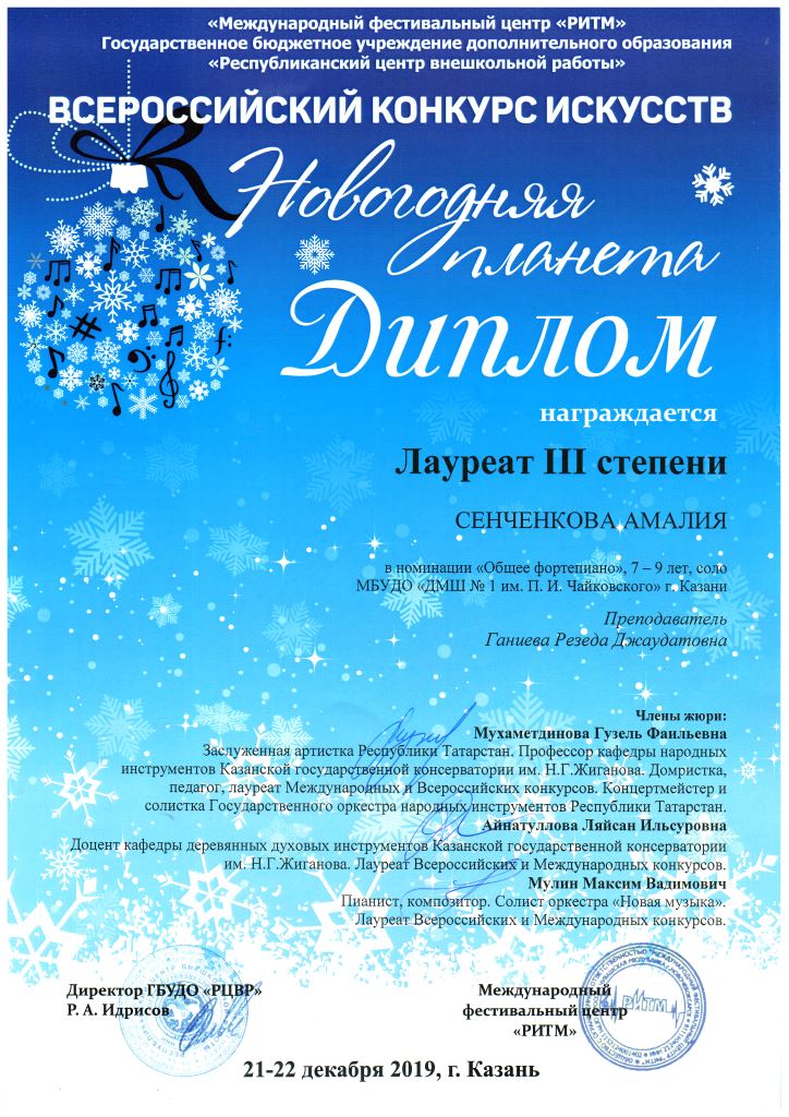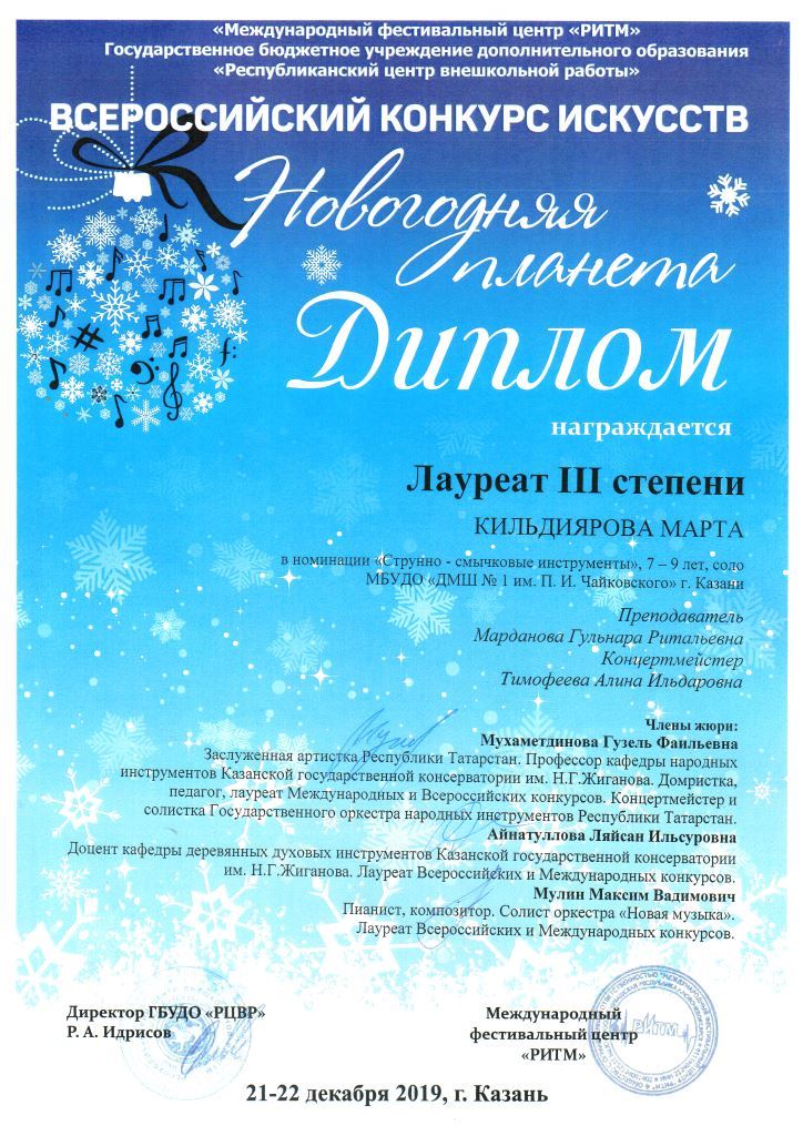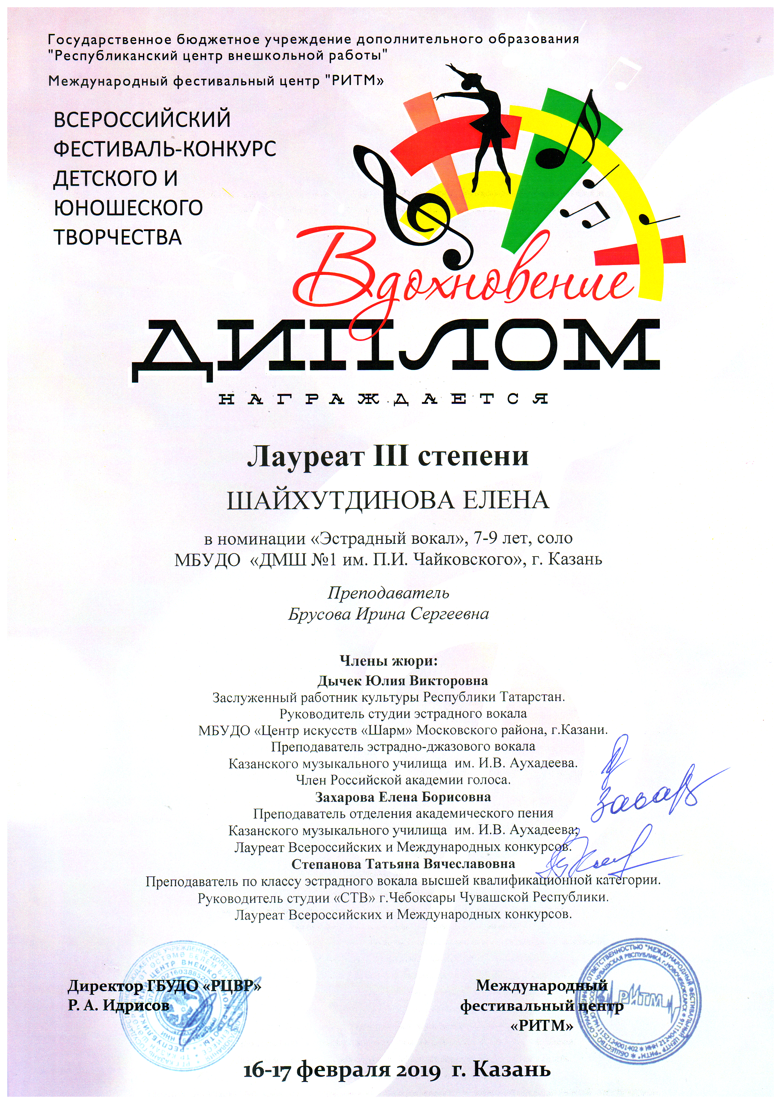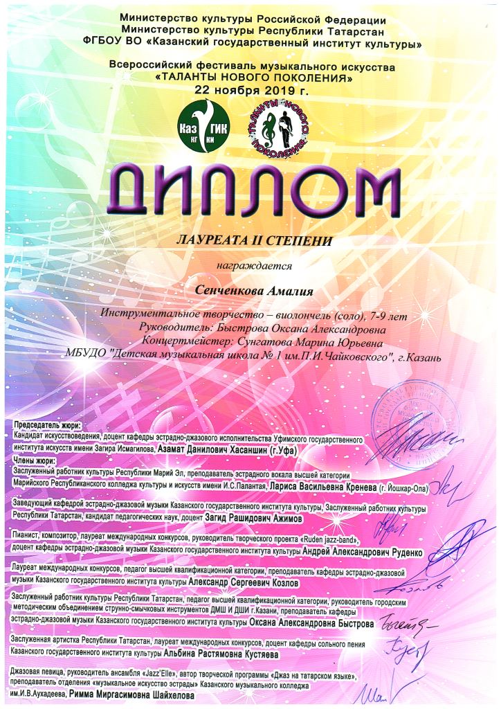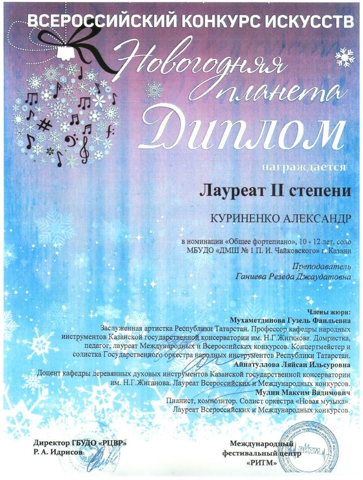 III Всероссийский конкурс-фестиваль молодых исполнителей на народных инструментах "Головокружительные пальцы" - Файзерахманова Ляйсан, Лауреат II степени, класс Петрухиной И.А.;
