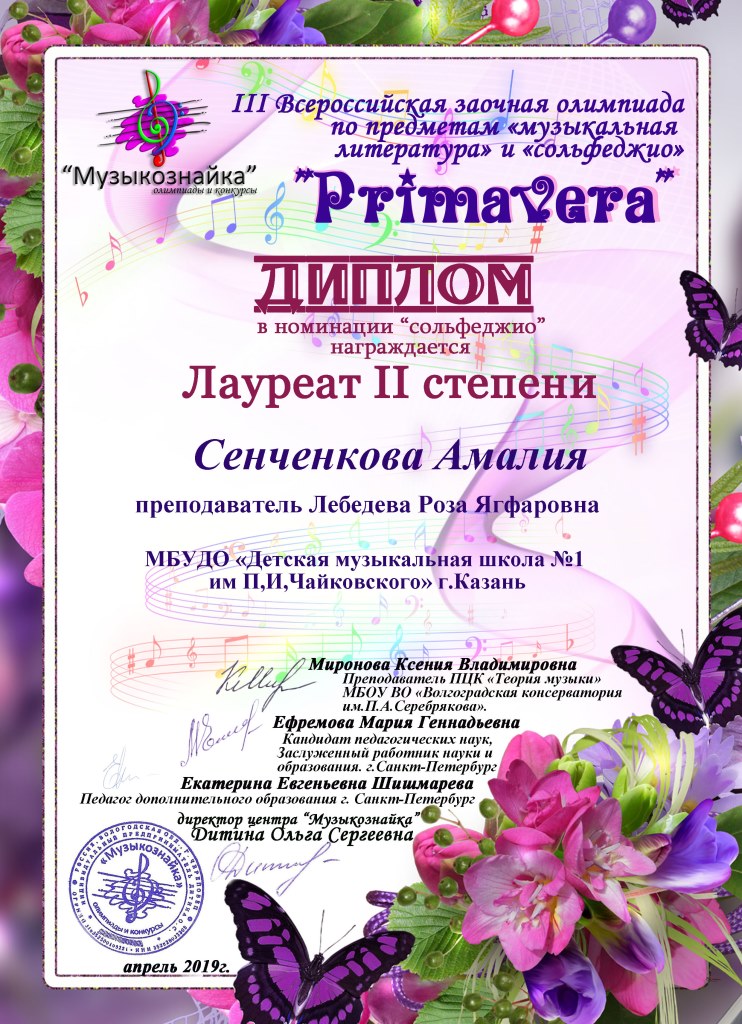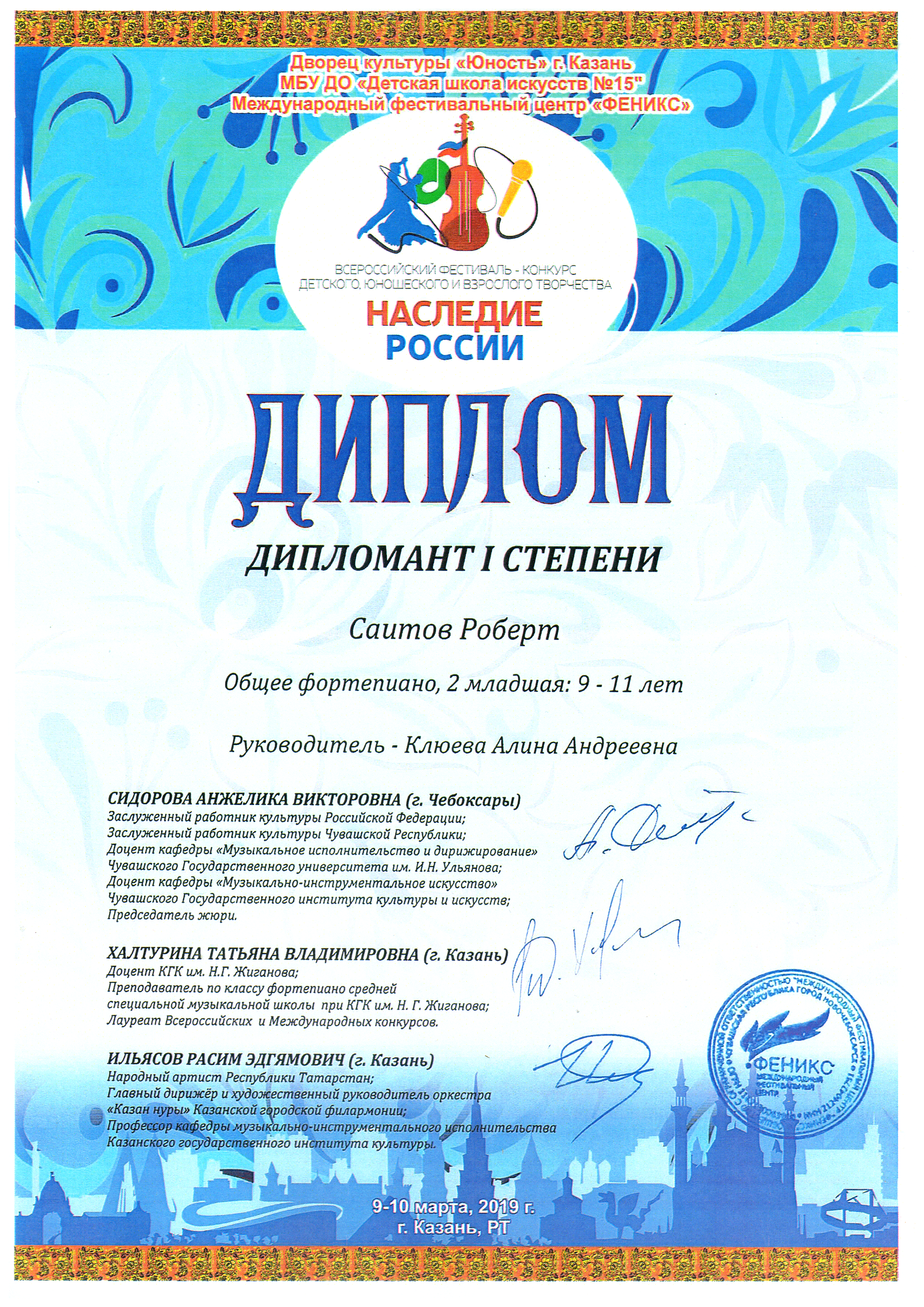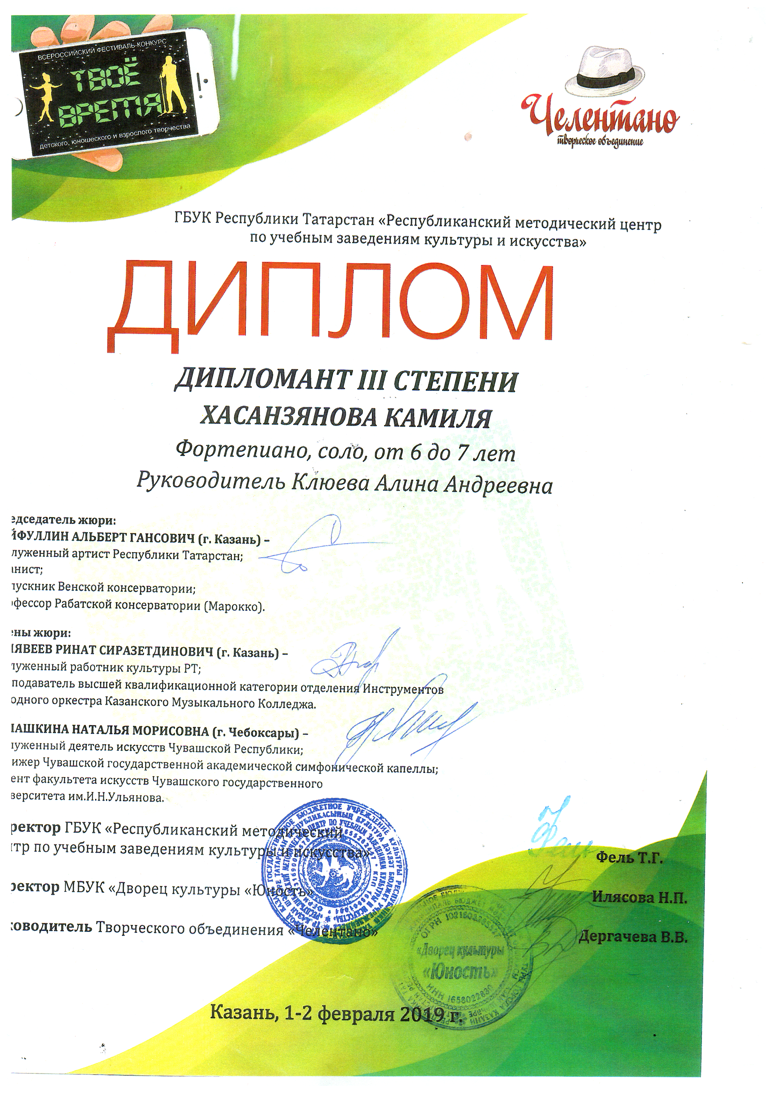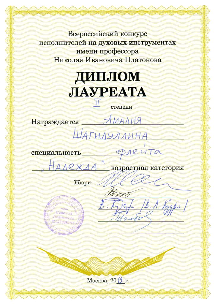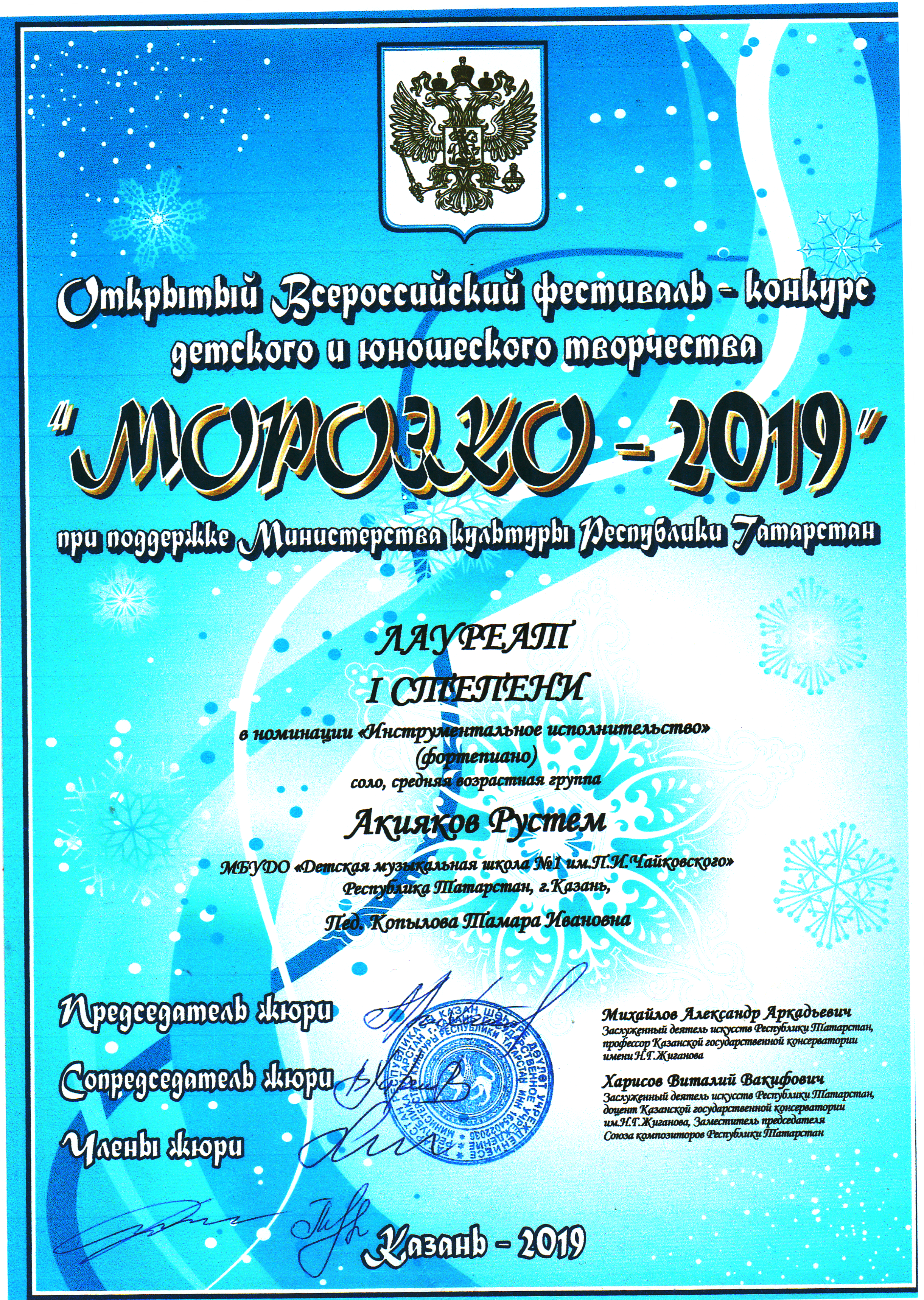 III Всероссийский конкурс-фестиваль молодых исполнителей на народных инструментах "Головокружительные пальцы" - Файзерахманова Ляйсан, Лауреат II степени, класс Петрухиной И.А.;