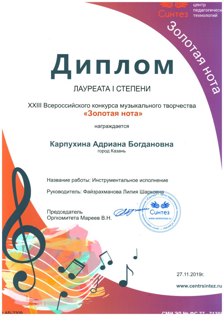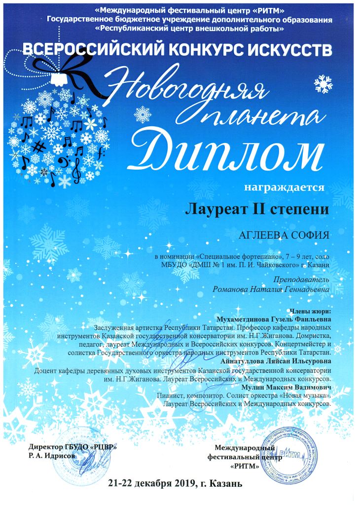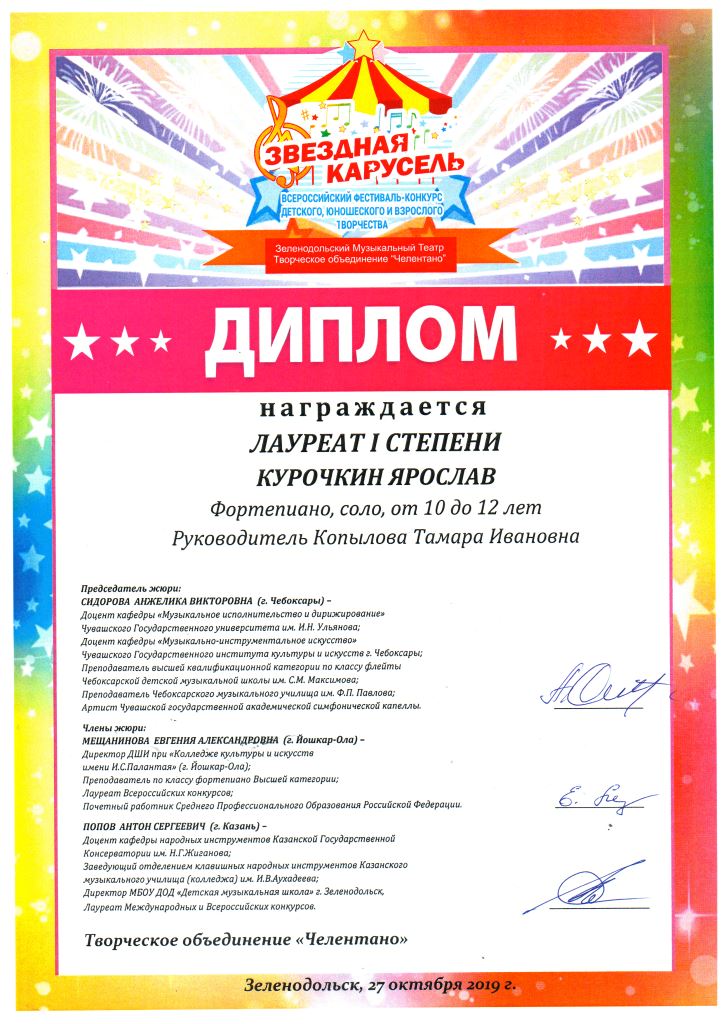 Всероссийский фестиваль-конкурс детского, юношеского и взрослого творчества "Звёздная карусель" - , Лауреат I степени, класс Копыловой Т.И.;