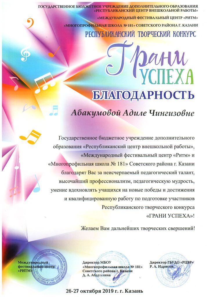 Республиканский творческий конкурс "Грани успеха" - Благодарственное письмо Абызовой Д.М.;