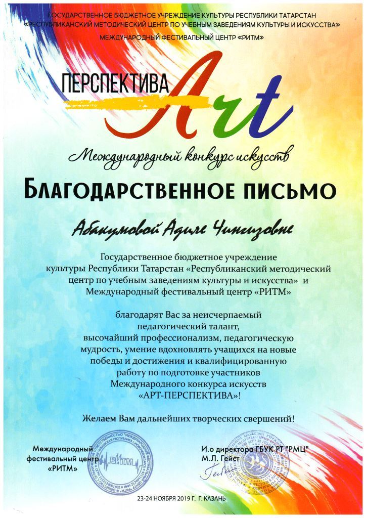 Международный конкурс искусств " Art перспектива" - Благодарственное письмо, Абакумова А.Ч.;
