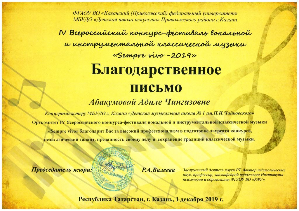 IV Всероссийский конкурс-фестиваль вокальной и инструментальной классической музыки "Sempre vivo" - Благодарственное письмо Абакумовой А.Ч.;