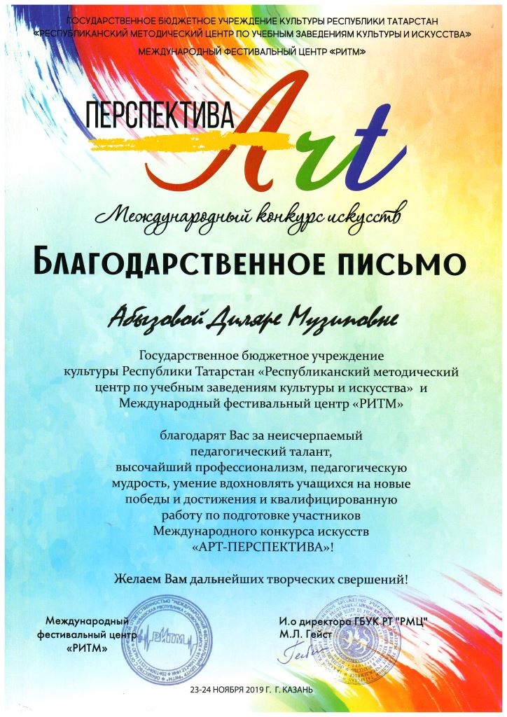 Международный конкурс искусств " Art перспектива" - Благодарственное письмо, Абызова Д.М.;