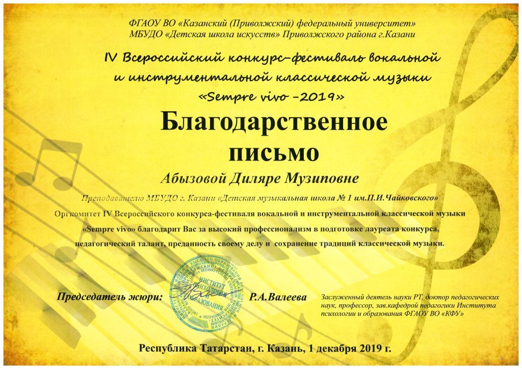 IV Всероссийский конкурс-фестиваль вокальной и инструментальной классической музыки "Sempre vivo" - Благодарственное письмо Абызовой Д.М.;