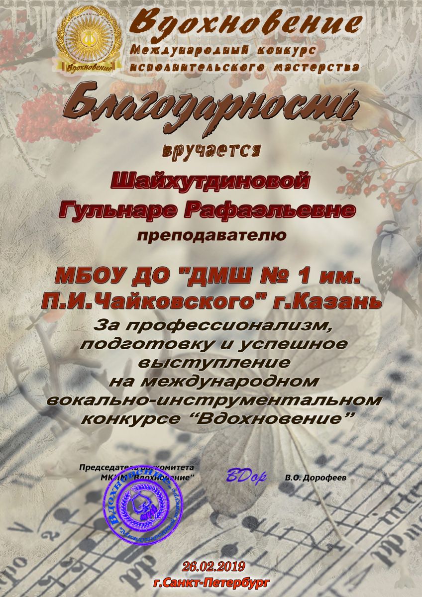 Международный конкурс исполнительского мастерства "Вдохновение" - Шайхутдинова Г.Р., Благодарность;