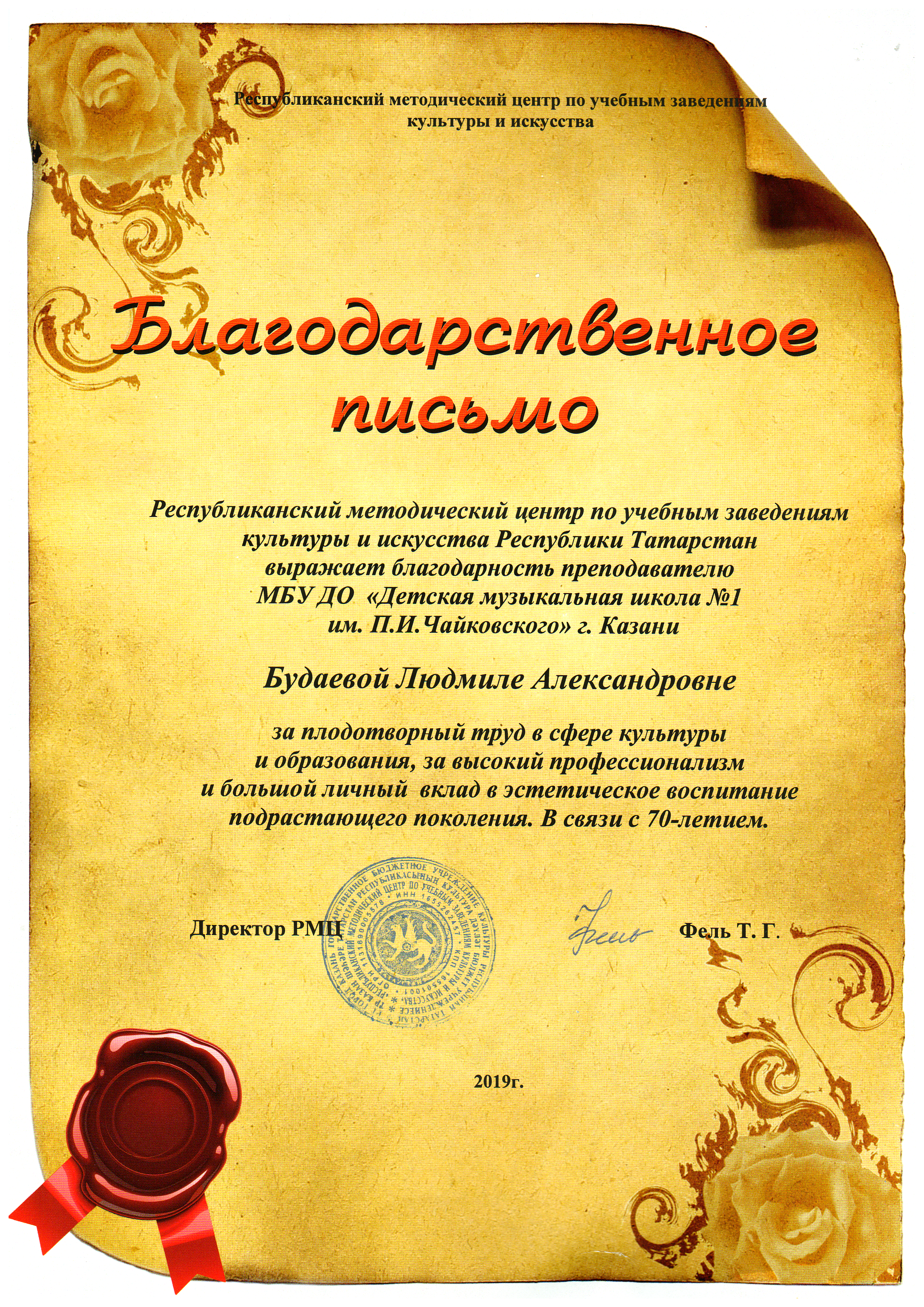 РМЦ МК РТ - Благодарственное письмо Будаевой Л.А. за плодотворный труд;