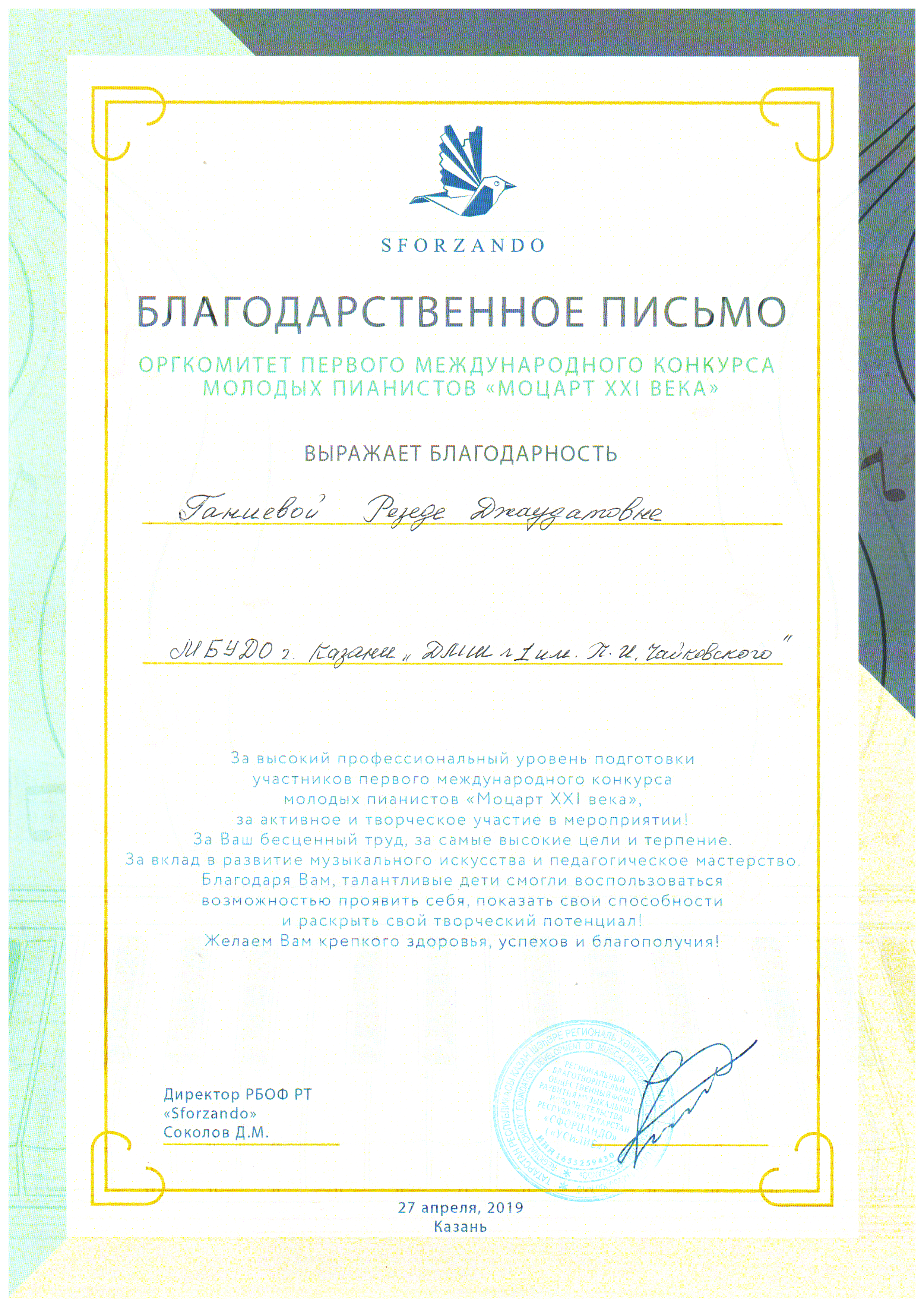 Первый международный конкурс молодых пианистов "Моцарт XXI века" - Благодарственное письмо Ганиевой Р.Д.;