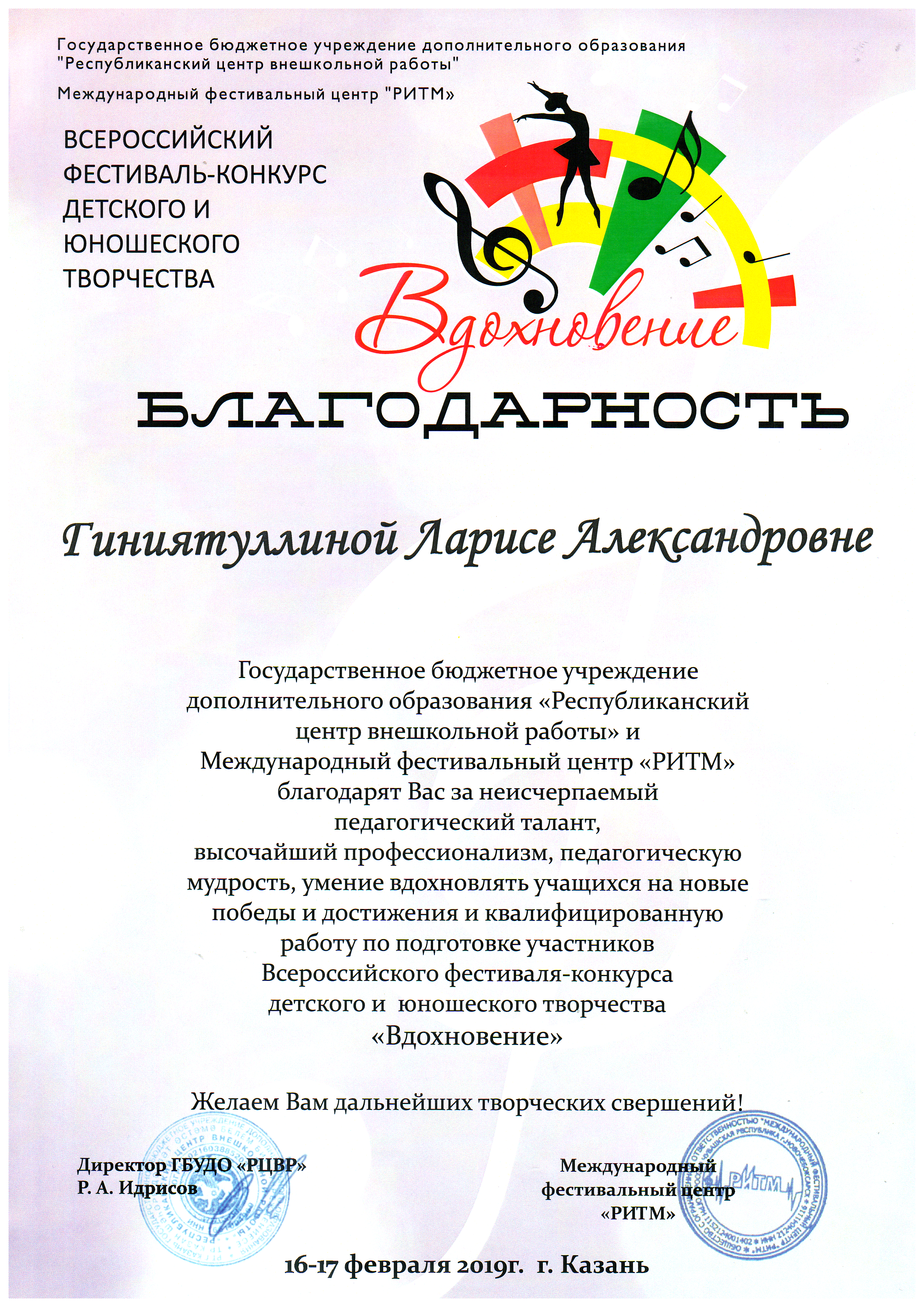 Всероссийский фестиваль-конкурс детского и юношеского творчества "Вдохновение" - Благодарность Гиниятуллиной Л.А.;