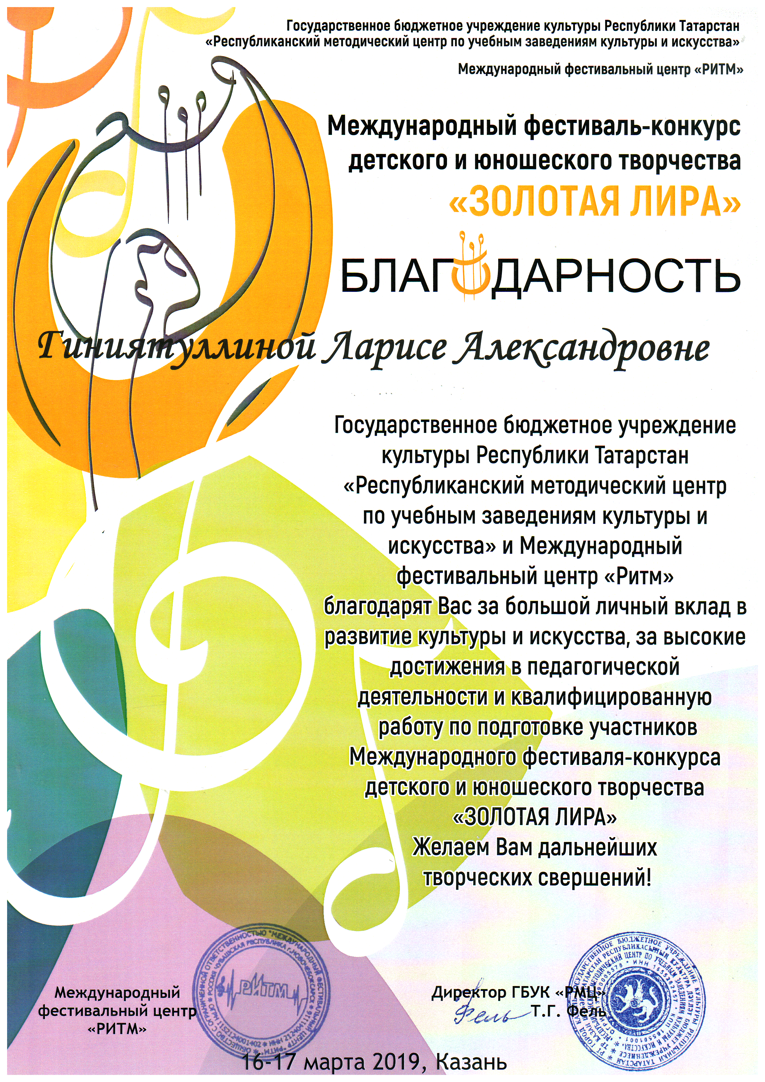 Международный фестиваль-конкурс детского и юношеского творчества "Золотая лира" - Гиниятуллина Л.А., Благодарность;