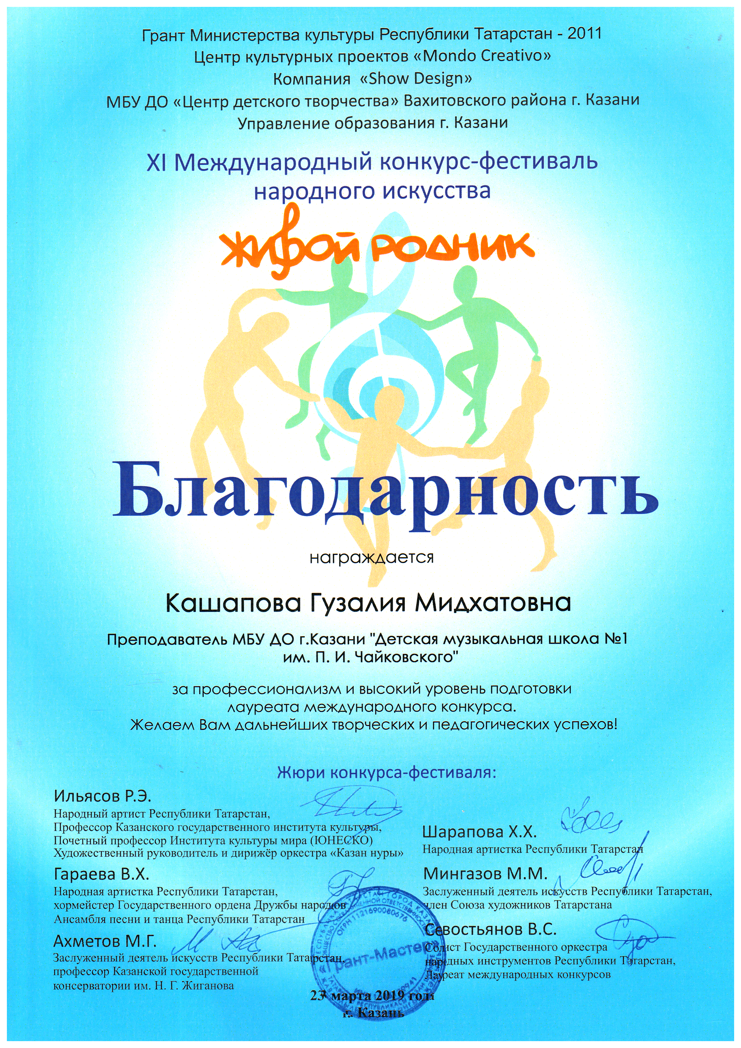 XI Международный конкурс-фестиваль народного творчества "Живой родник" -Благодарность Кашаповой Г.М.;