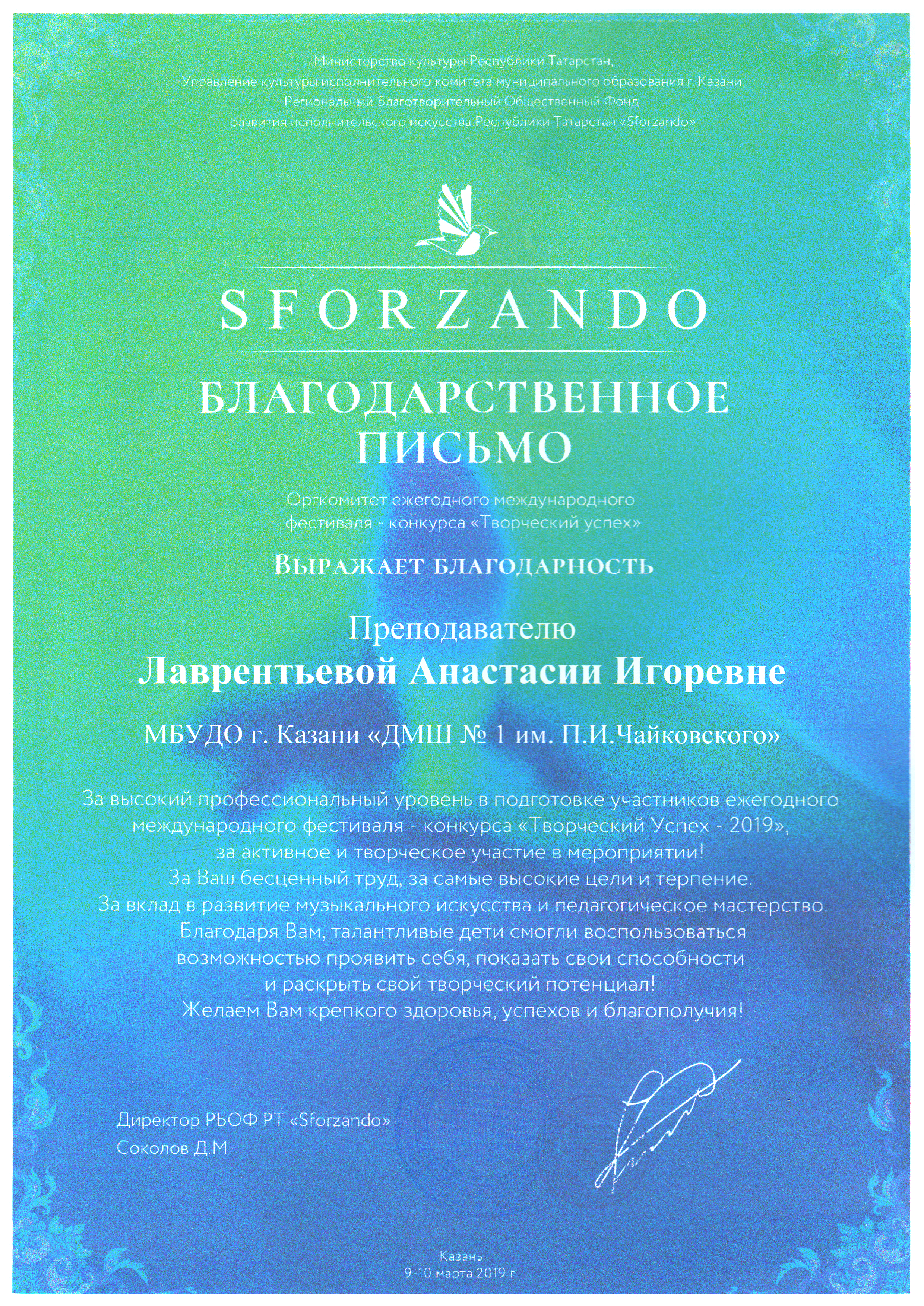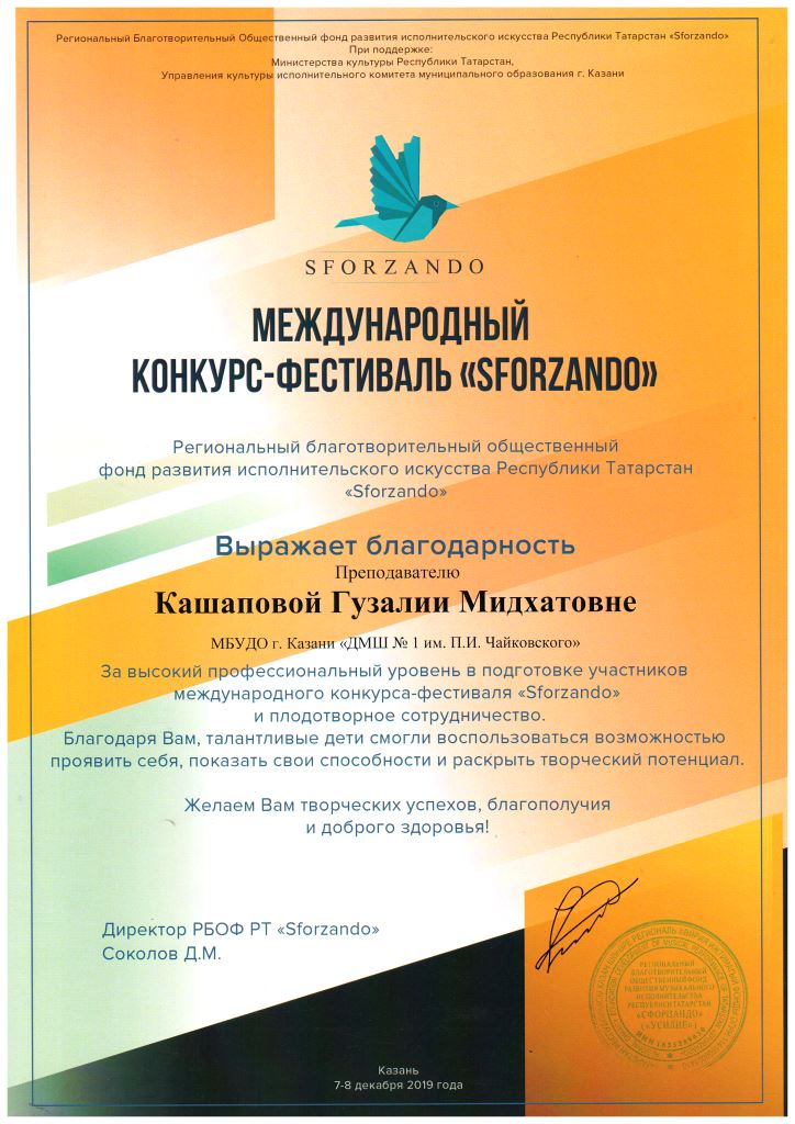 Международный конкурс-фестиваль "Sforzando" - Благодарность Кашаповой Г.М.;