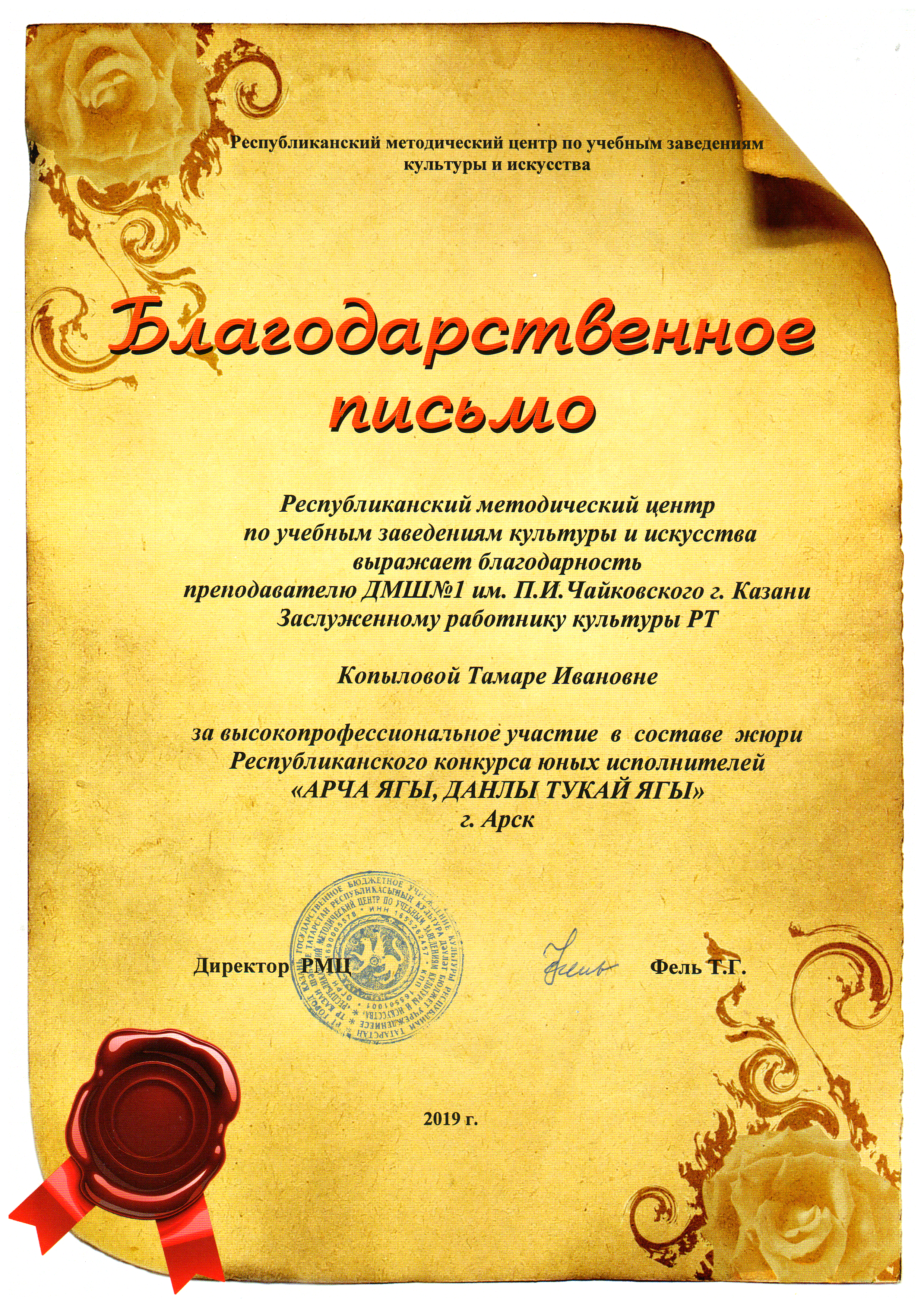 РМЦ МК РТ - Благодарственное письмо Копыловой Т.И. за работу в жюри Республиканского конкурса "Арча ягы, данлы тукай ягы";