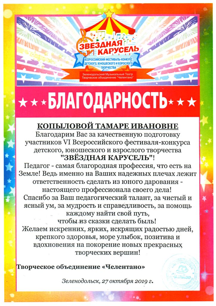 Всероссийский фестиваль-конкурс детского, юношеского и взрослого творчества "Звёздная карусель" - Благодарность Копыловой Т.И.;