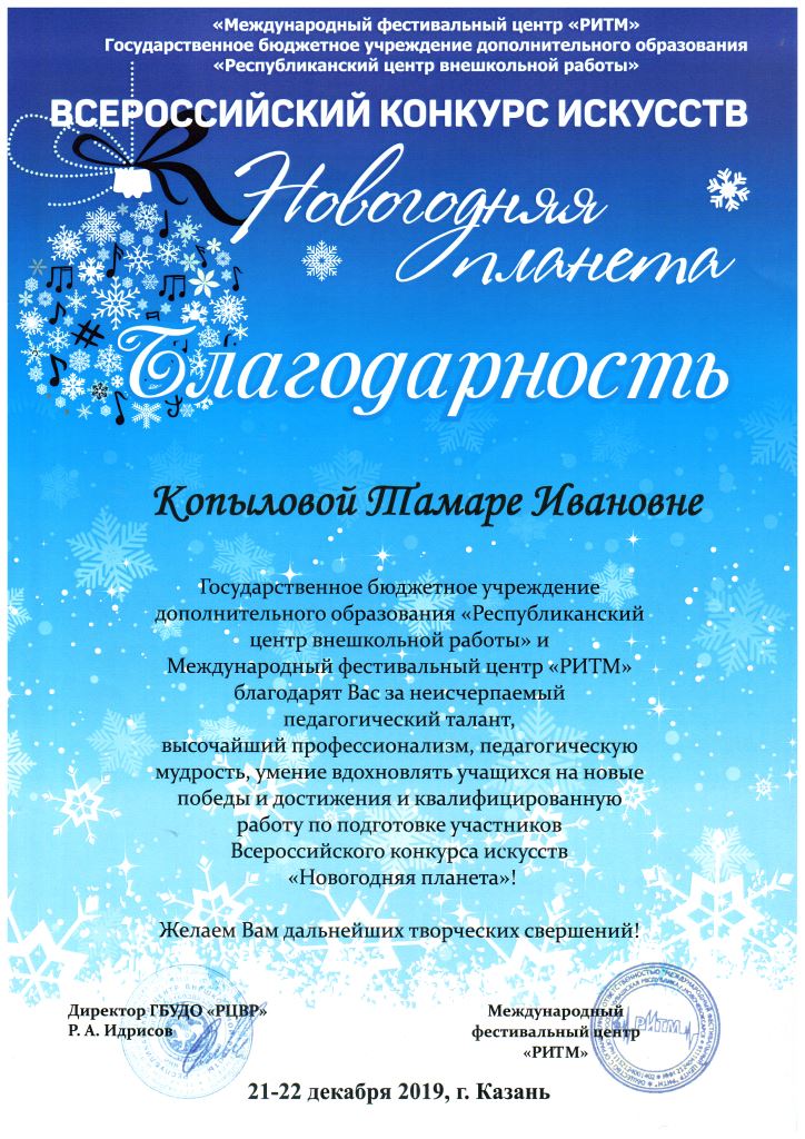 Всероссийский конкурс искусств "Новогодняя планета" - Благодарность Копыловой Т.И.;