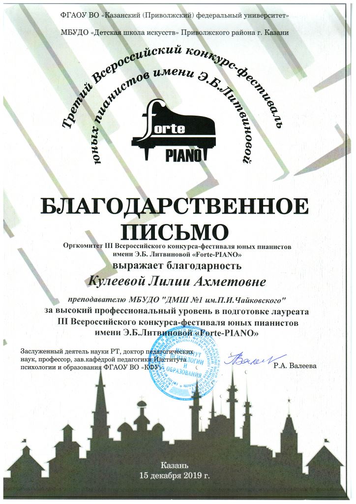 Третий Всероссийский конкурс-фестиваль юных пианистов им. Э.Б.Литвиновой - Благодарственное письмо Кулеевой Л.А.;