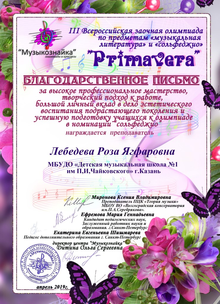 III Всероссийская заочная олимпиада по предметам "музыкальная литература" и "сольфеджио" "Primavera" - Благодарственное письмо Лебедевой Р.Я.;