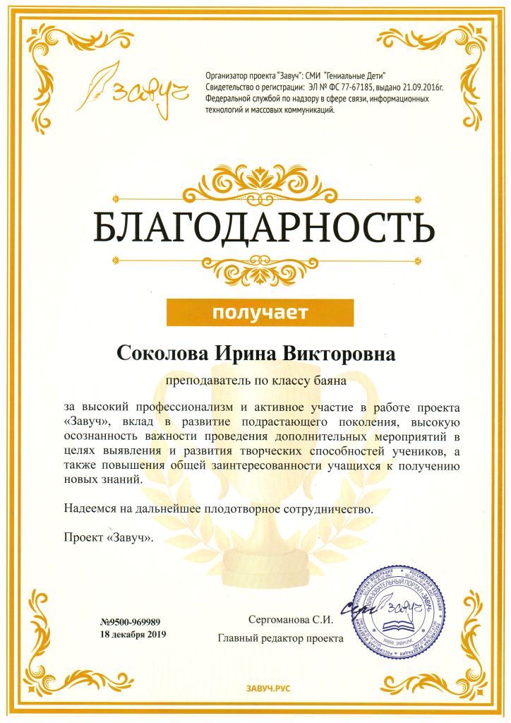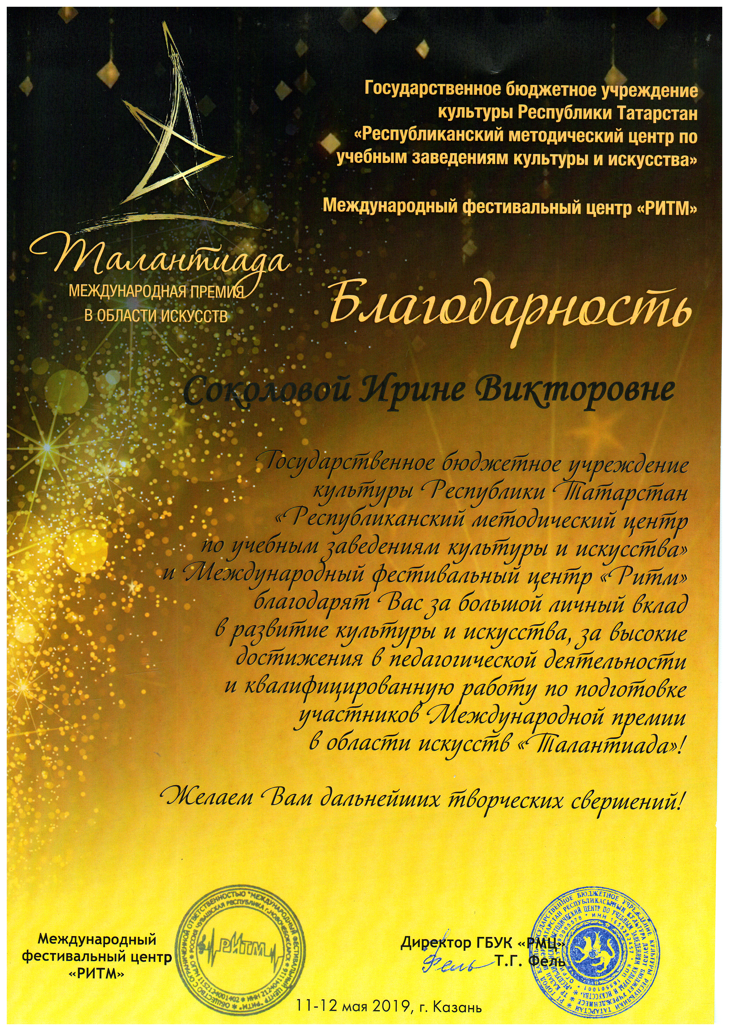Международная премия в области искусств "Талантиада" - Благодарность Соколовой И.В.;