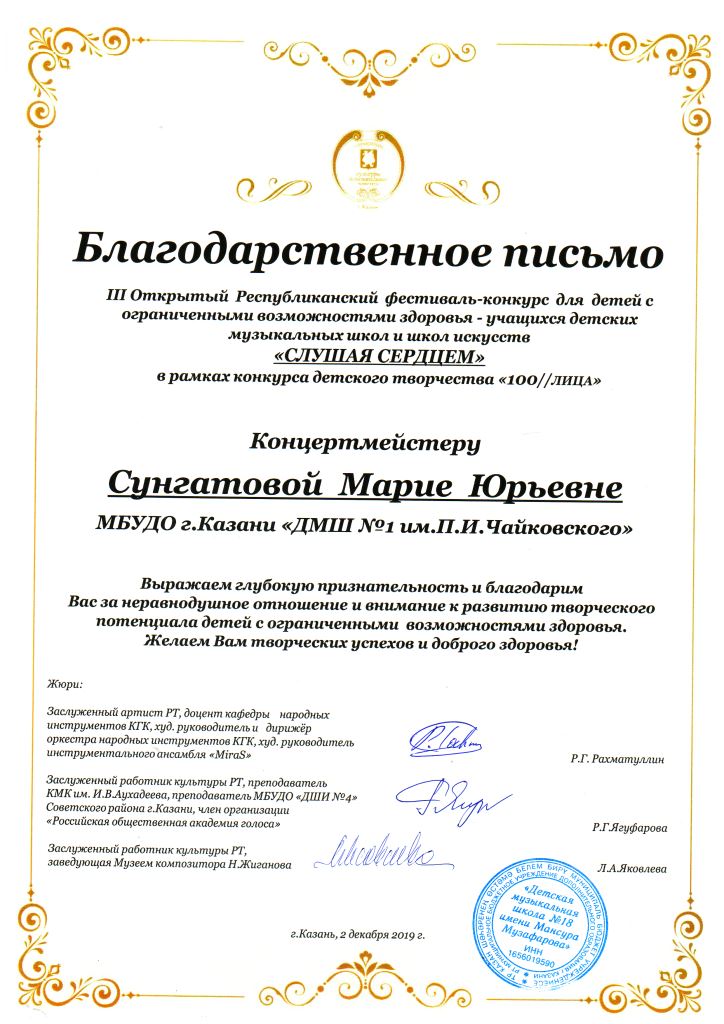 III Открытый Республиканский конкурс для детей с ОВЗ - учащихся ДМШ и ДШИ "Слушая сердцем" - Благодарственное письмо Сунгатовой М.Ю.;