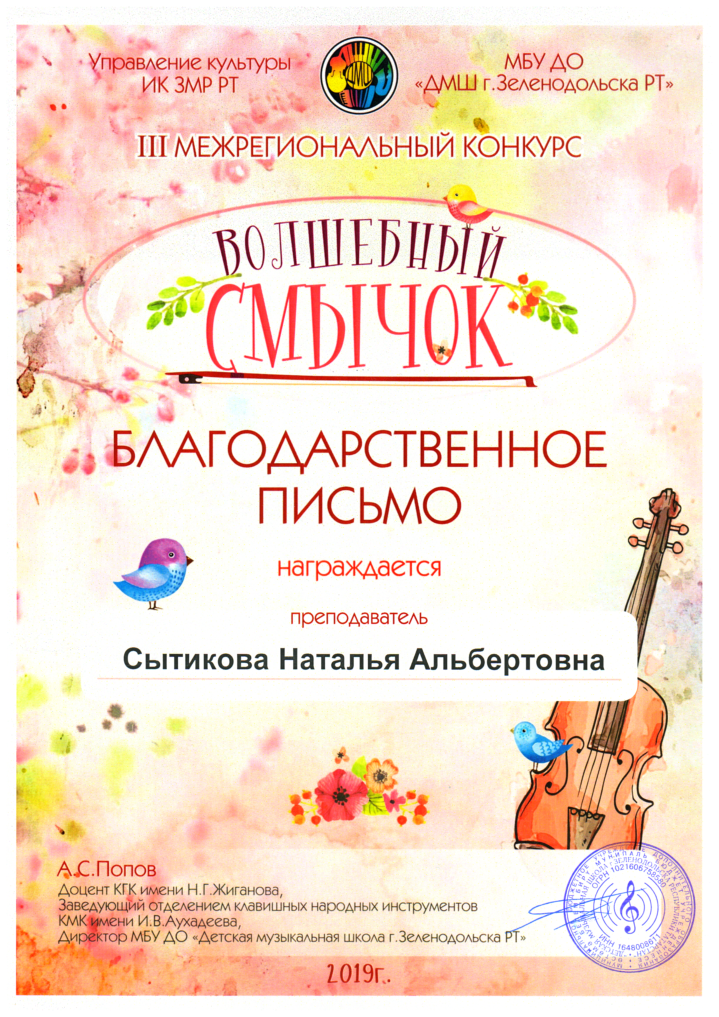 II Всероссийский конкурс молодых исполнителей на струнных смычковых инструментах "TUTTI.ARCO" - Сытикова Н.А., Благодарственное письмо;