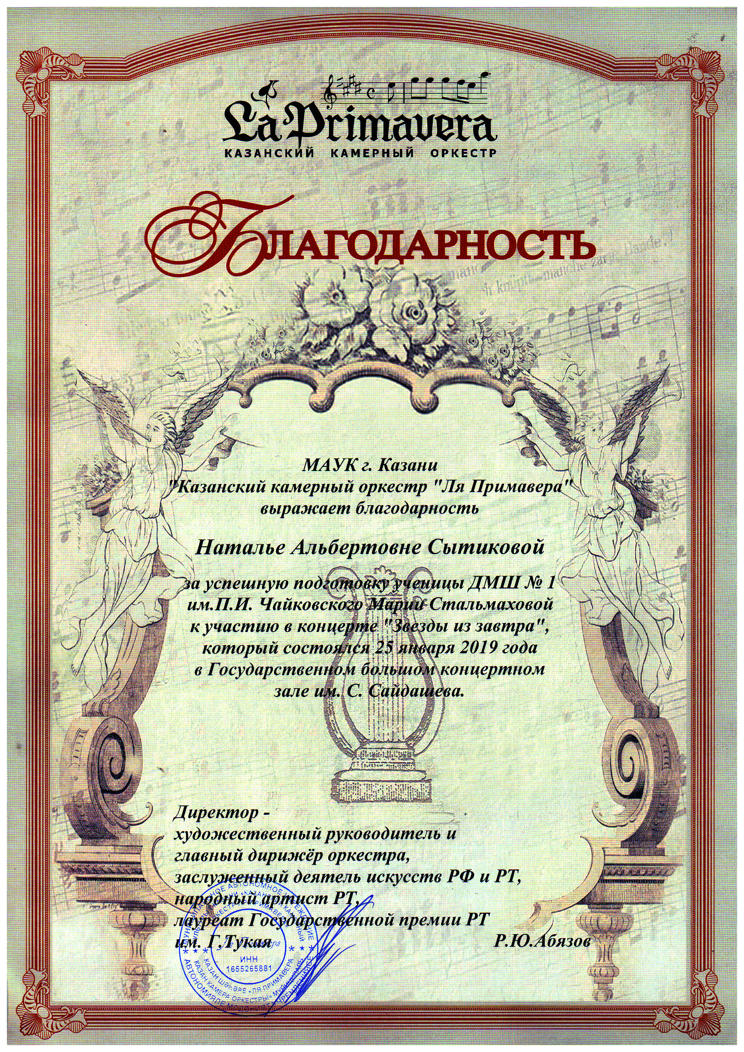Концерт Казанского камерного оркестра "La Primavera" - Сытикова Н..А., Благодарность;