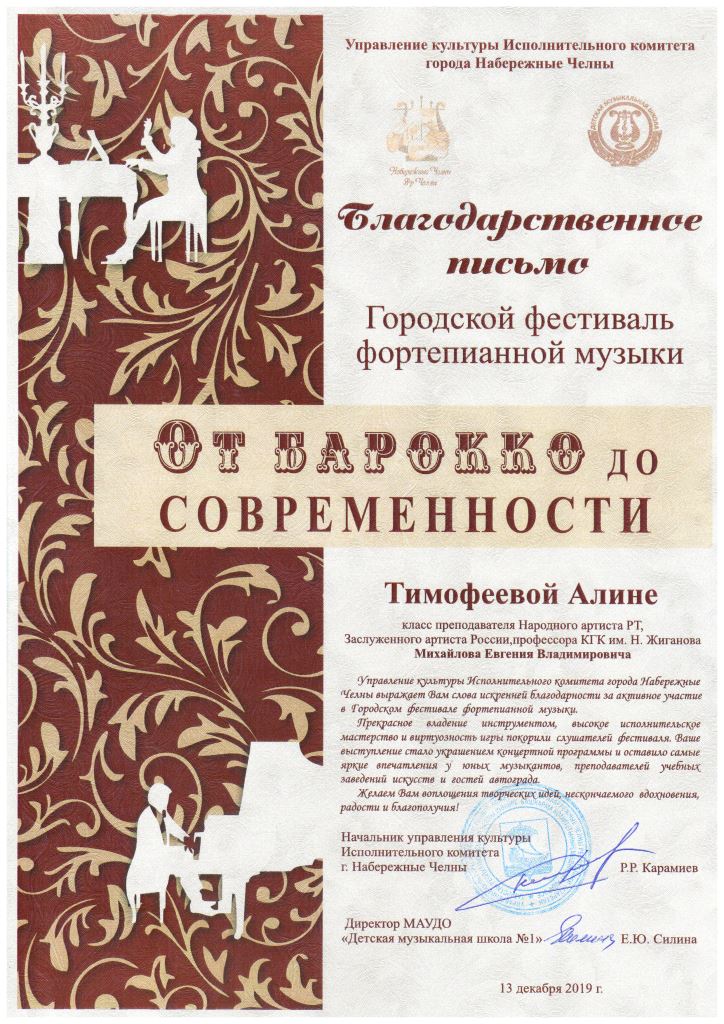 Городской фестиваль современной музыки "От барокко до современности" (г.Набережные Челны) - Благодарственное письмо Тимофеевой А.И.;
