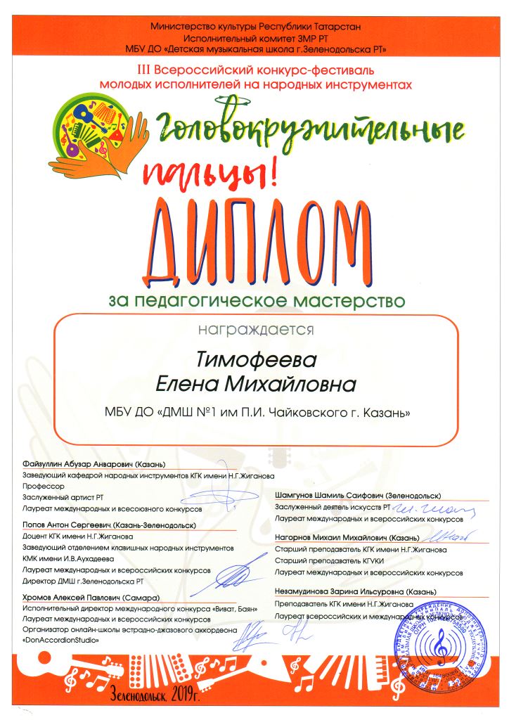 III Всероссийский конкурс-фестиваль молодых исполнителей на народных инструментах "Головокружительные пальцы" - Диплом Тимофеевой Е.М.;