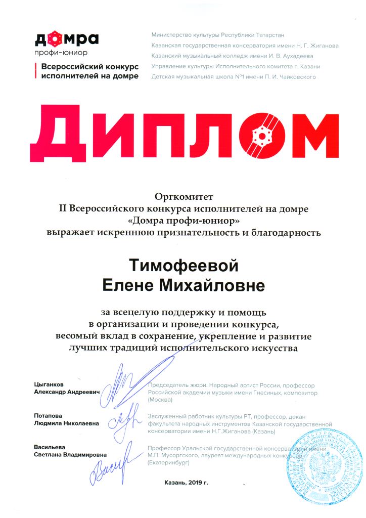 II Всероссийский конкурс исполнителей на домре "Домра профи-юниор" - Благодарность Тимофеевой Е.М.;